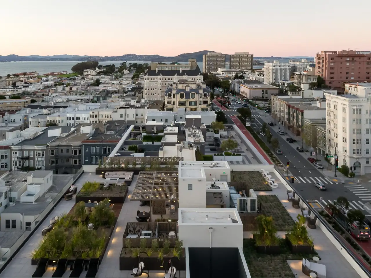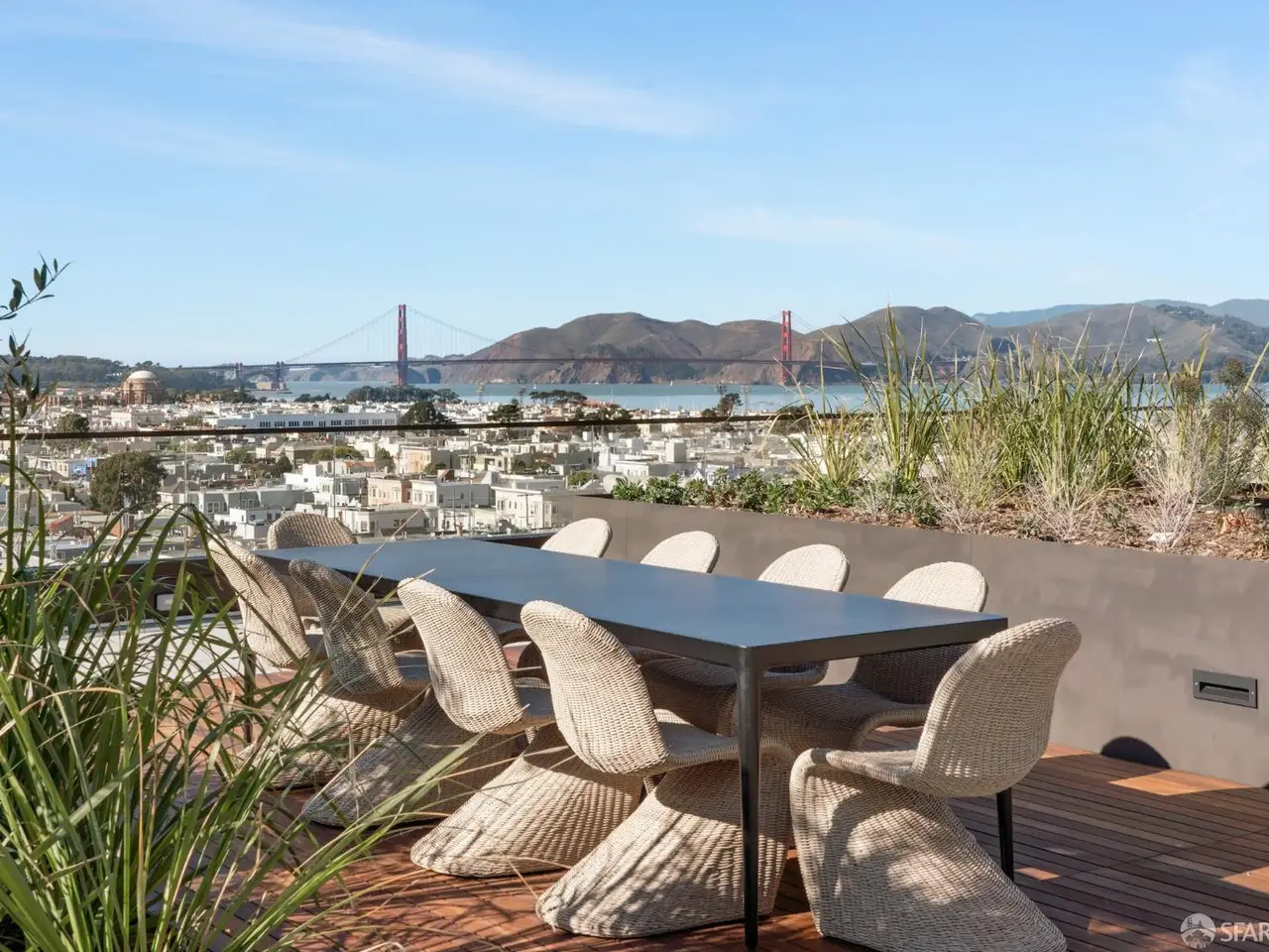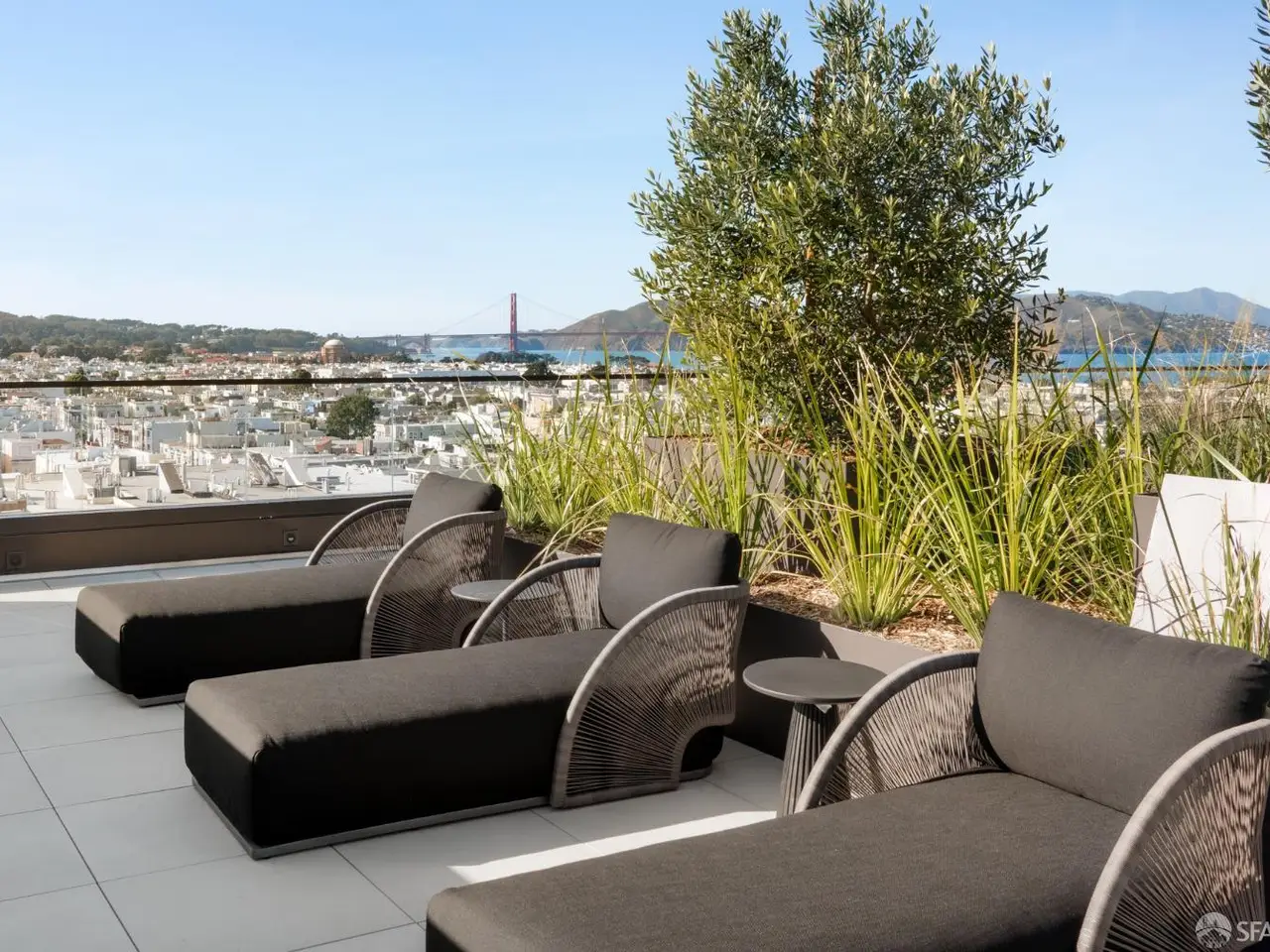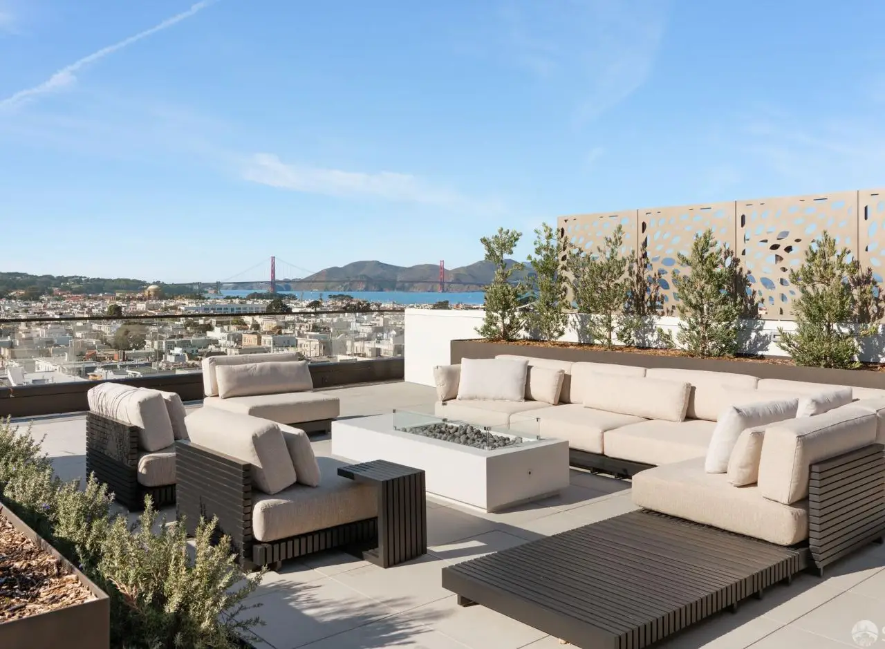 Expansive resort-style roof terrace with Golden Gate Bridge views