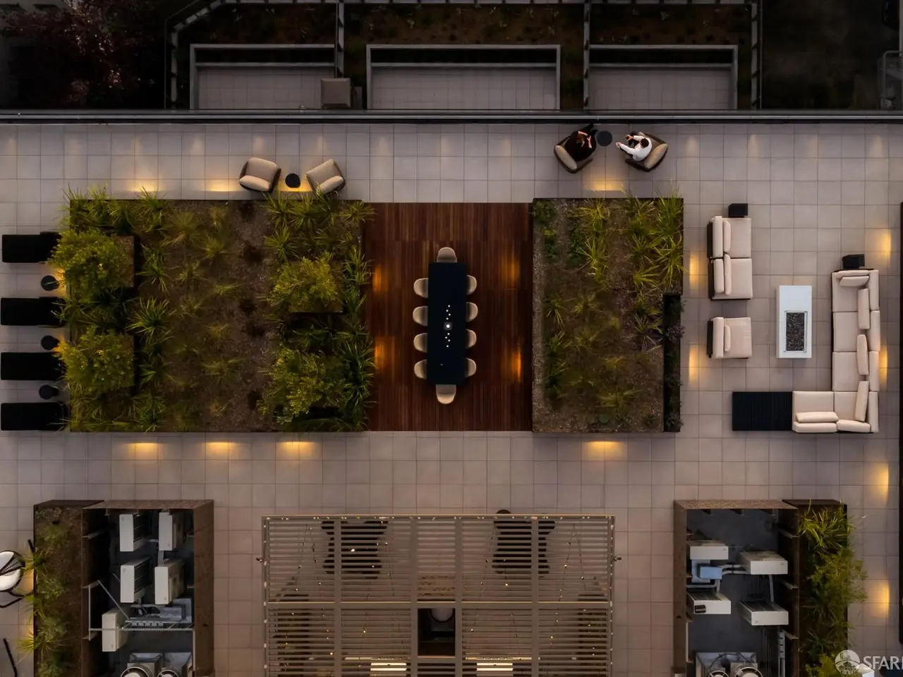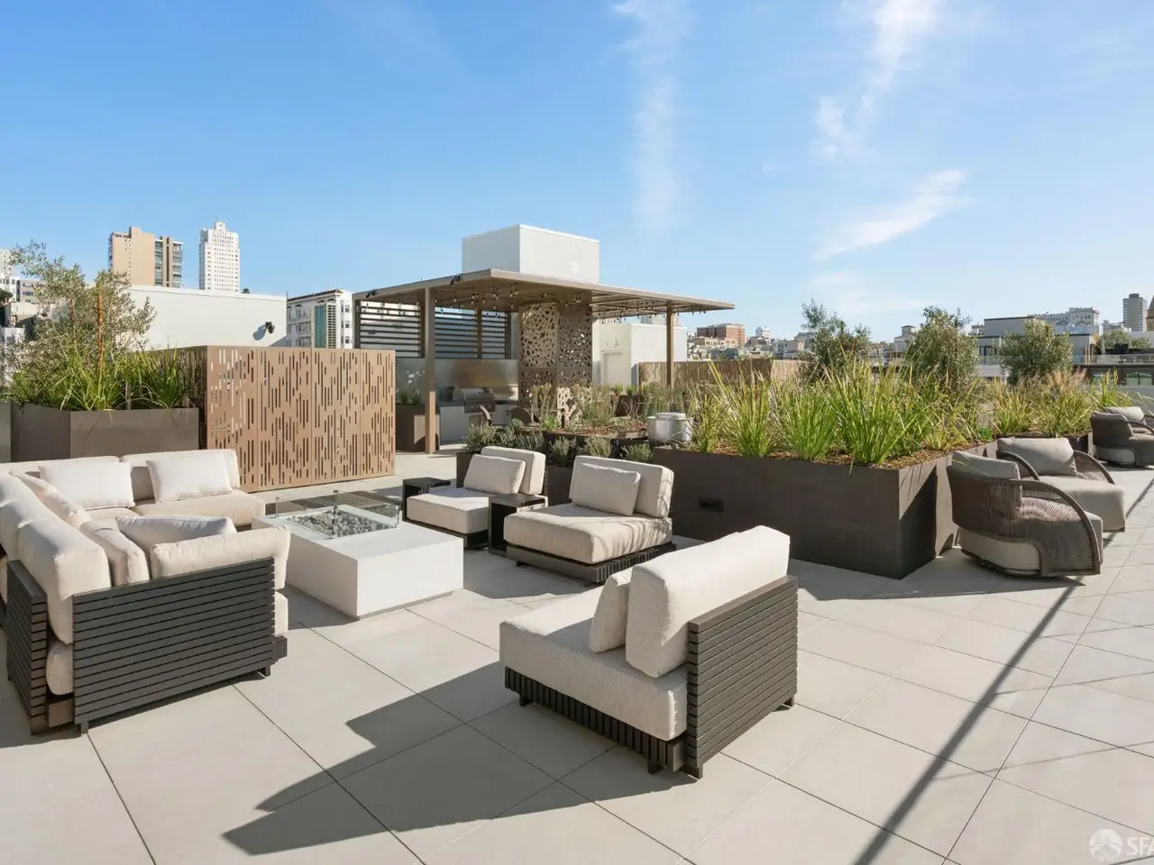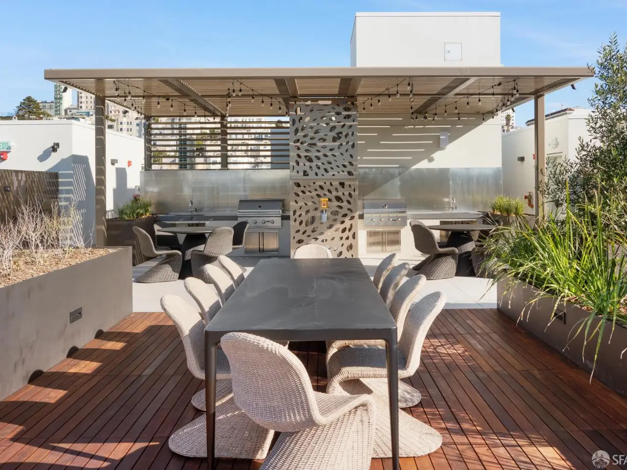 Expansive resort-style roof terrace with Golden Gate Bridge views