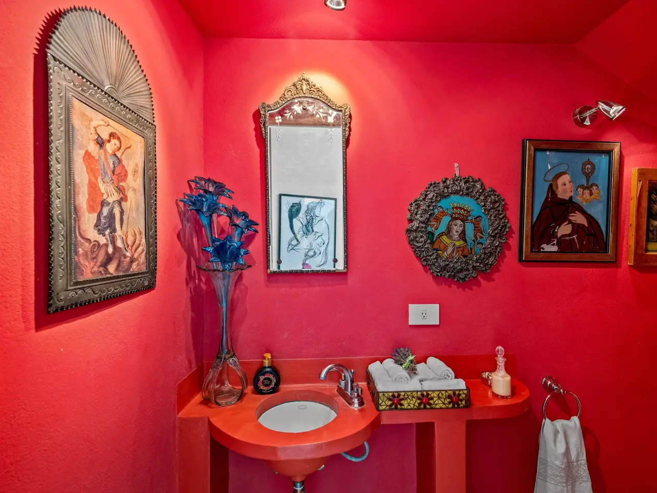Welcome to Ca’rossa Where Mexican Colonial charm meets Italian elegance in San Miguel de Allende’s Centro. From the moment you arrive, the striking red façade framed with cantera surrounds on every window, the front door, and garage sets the tone for this exceptional residence. Step inside through a thoughtfully designed corridor that opens to the dining area, where arched French doors perfectly frame the outdoor living space. Whitewashed Saltillo tile floors and stenciled ceilings create an airy, light-filled atmosphere that immediately feels both refined and welcoming. The heart of the home is its interior patio, a serene space visible from both the dining and living areas. With its “inspiration wall” fountain, it invites moments of gardening, al fresco dining, or quiet relaxation. Just off the dining area, the galley-style kitchen delights with granite countertops, generous cabinetry, and handcrafted mosaics in cheerful tones of yellow, white, and blue—an inspiring setting for cooking and entertaining. A cozy library nook, guest half-bath, and an elegant living room painted in warm tones complete the first floor. Here, a carved cantera fireplace with floral relief takes center stage, complemented by a stone accent wall, light well, and a second fountain. A private garage offers convenience at this level as well. Second Level Up the graceful staircase, the Saltillo tile continues. The primary suite is a retreat unto itself with a cantera fireplace, a view over the patio, and a spacious en suite bath featuring custom wood cabinetry, double sinks, a bathtub, and shower. True to European tradition, the W.C. is set apart from the bathing area. An adjacent office or den—finished with a striking mosaic floor—offers versatility as a workspace or even a smaller bedroom. Down the hall, the guest suite enchants with another carved wood fireplace surround and a beautifully tiled bathroom. Like the primary suite, this room also overlooks the tranquil patio. Third Level & Rooftop On the third floor, discover a third bedroom with en suite bath, a laundry room, and direct access to the expansive rooftop terrace. Bursting with greenery, this terrace is anchored by a charming glass gazebo—perfect for dining, reading, or creating art. A shaded loggia with vines and foliage evokes the romance of dining al fresco in Italy. One level above, a second sun terrace offers breathtaking 360° views of San Miguel. From here, admire the iconic Parroquia, San Francisco, the Oratorio, and Las Monjas churches, along with panoramic sunsets over the city skyline. The Opportunity Ca’rossa is more than a home—it’s a lifestyle. With its seamless blend of Colonial Mexican architecture and European sophistication, it offers charm, comfort, and character at every turn. Don’t miss this exquisite opportunity—schedule your private showing today. This unique opportunity is significantly reduced to allow current 90 year-old owner lifetime use of home. So if your timing is flexible, this is an amazing deal for you!