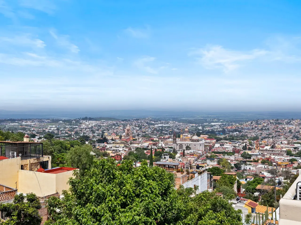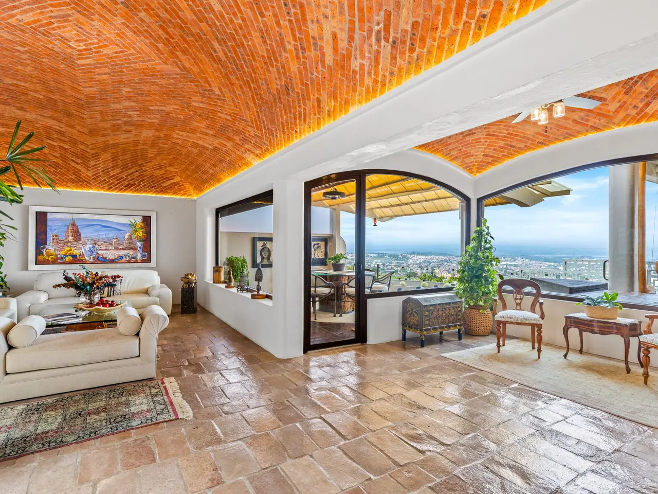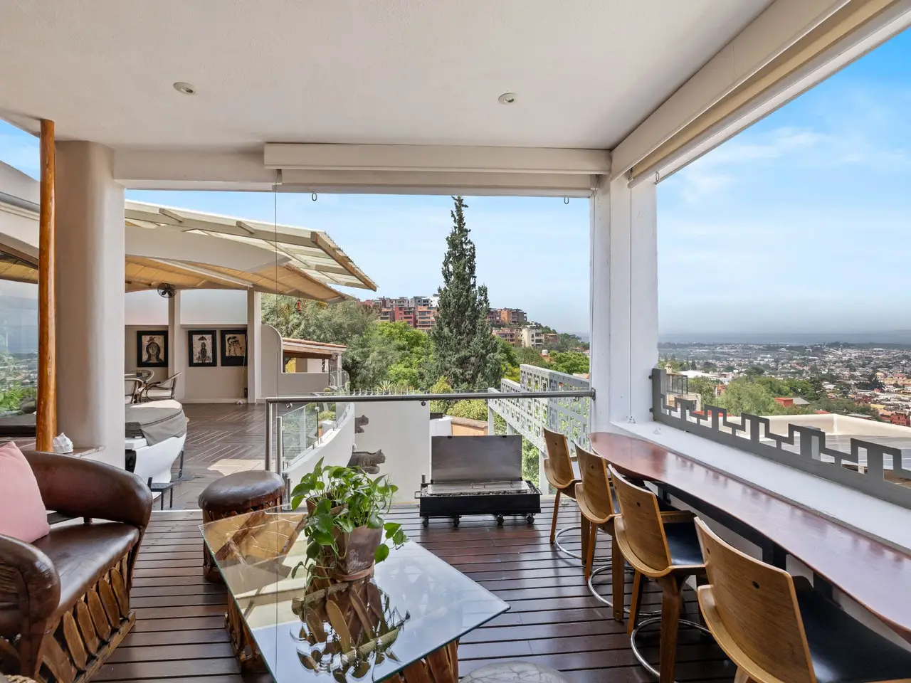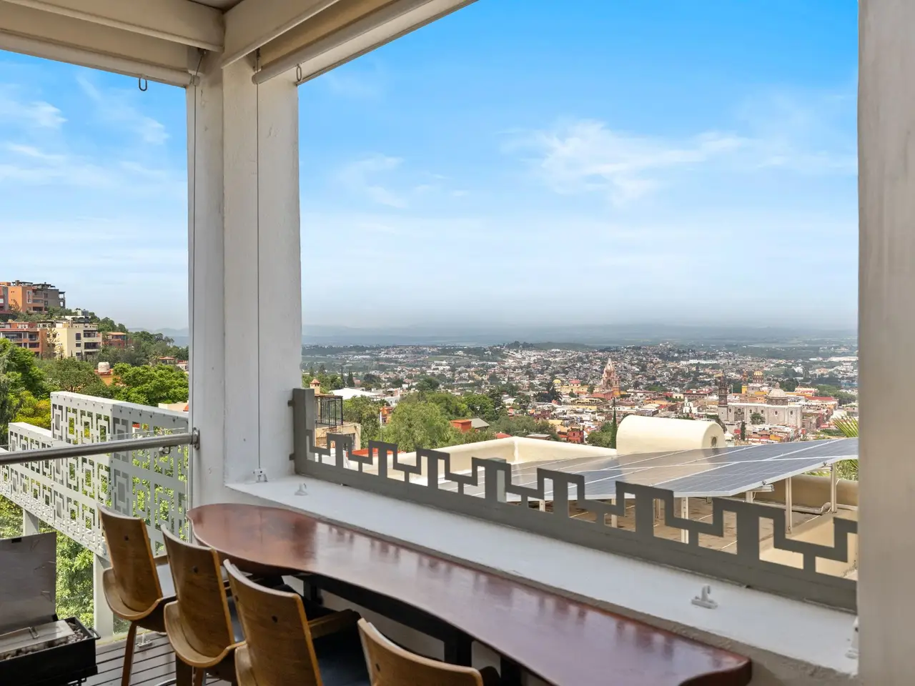 Prepare to be stunned when you enter Casa del Foro. Perched on a hillside overlooking all of downtown San Miguel de Allende and far beyond, this recently remodeled luxury house offers elegant living spaces, once-in-a-lifetime views and all of the amenities you’d expect to find in this desirable neighborhood. No detail has been overlooked, from the unique boveda ceilings and hand-carved doors to the casual dining nook in the kitchen that still manages to take advantage of the views of Centro. The open floor plan maximizes the incredible vistas to the South, the West and the North. You will enjoy indoor/outdoor living, complete with a cozy high tech bar and two dining areas, powered sun-blocking shades and more. The main house features a gracious entry courtyard with a remarkable sculpture by a renown artist. To the left are two separate guest bedrooms with gorgeous boveda ceilings and ensuite bathrooms. One you enter the main indoor sala, you can easily access the kitchen, the guest bathroom, the indoor and outdoor dining areas and a covered terrazzo that will take your breath away. Everywhere you look, the thoughtful design is evident. The intimate indoor/outdoor bar is right next to a private jacuzzi which has some of the best views in the house. Downstairs is a beautifully appointed two-bedroom apartment with its own kitchen and sala that can be used for guests or even rented out, thanks to the discreet separate entrance. Climb the gracefully dramatic wooden staircase and you will arrive at the luxurious master bedroom suite with views, motorized blackout drapes, an attached gym and a comfortable office. With whole house water purification, solar water heating and more bells and whistles than can fit in this description, Casa del Foro is one of San Miguel’s most luxurious properties today. The house features a lot of elegant handmade furniture and is offered turnkey with some exceptions, and the owners are also willing to consider an additional art package which would include much of the outstanding art collection. Amenities Garage 5 bedrooms 6 bathrooms Separate casita/apartment Views Solar water heating Furnished with exceptions Whole house water purification Personal gym Office Outdoor bar and entertaining area Hot tub Boveda Ceilings