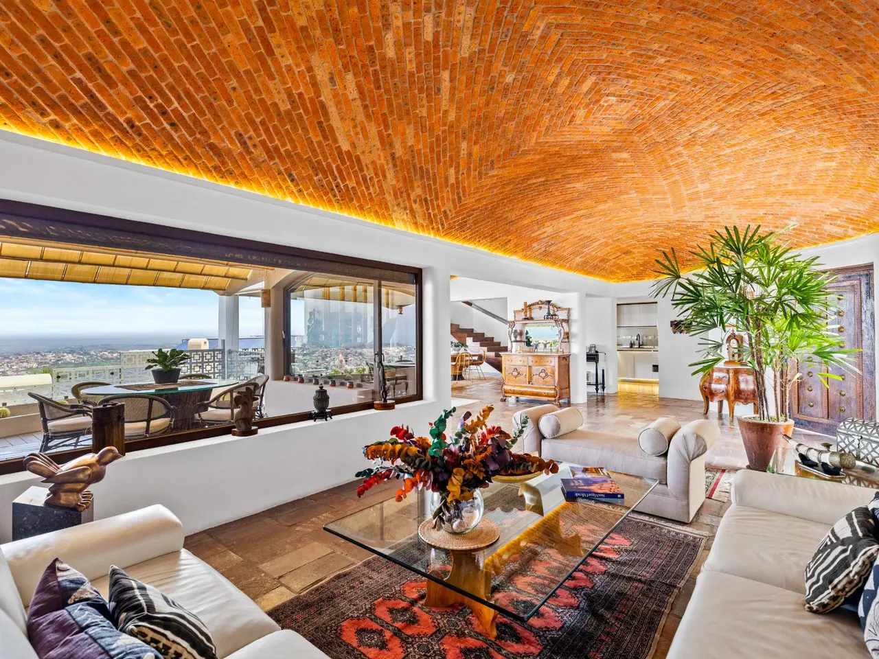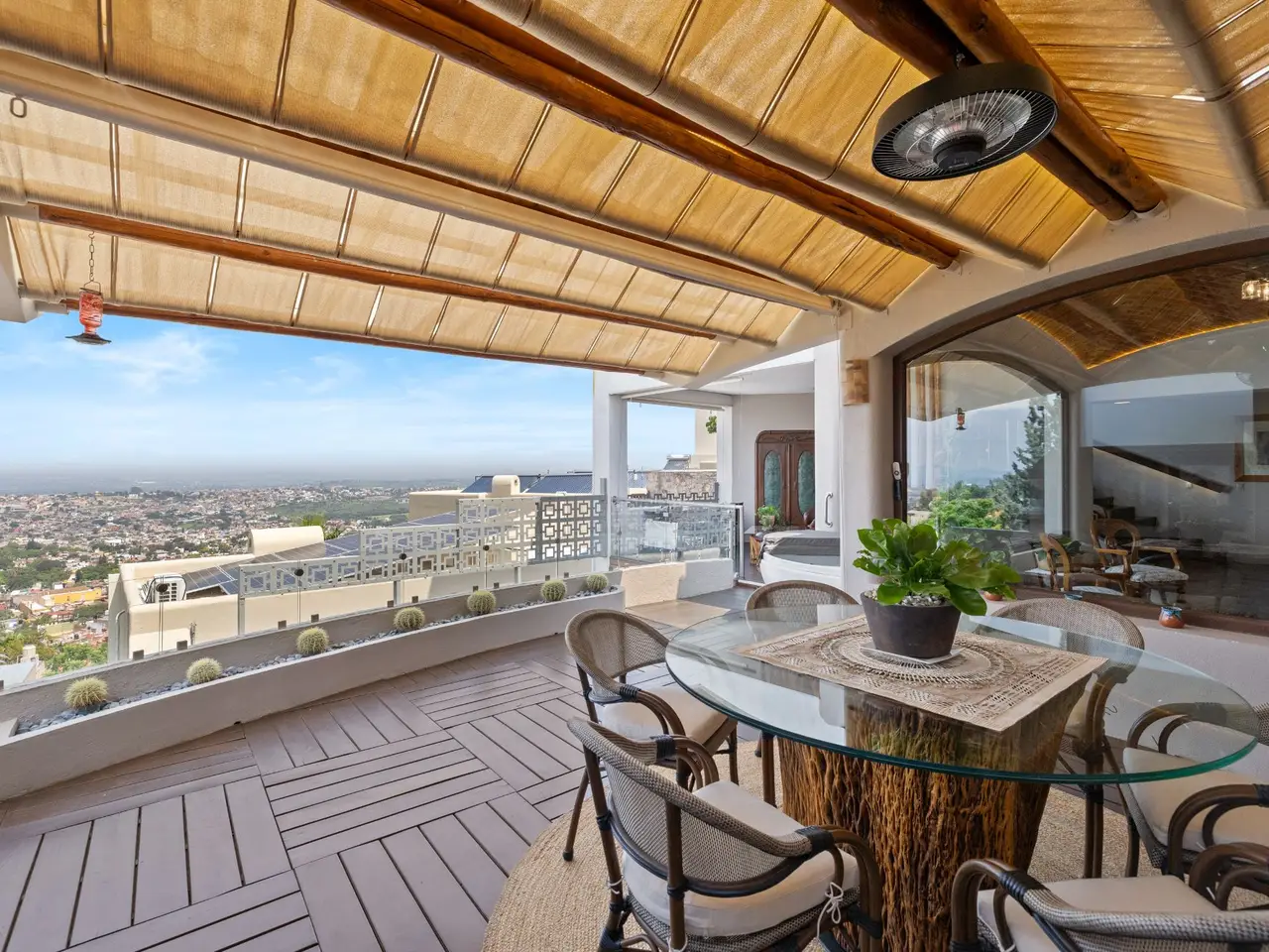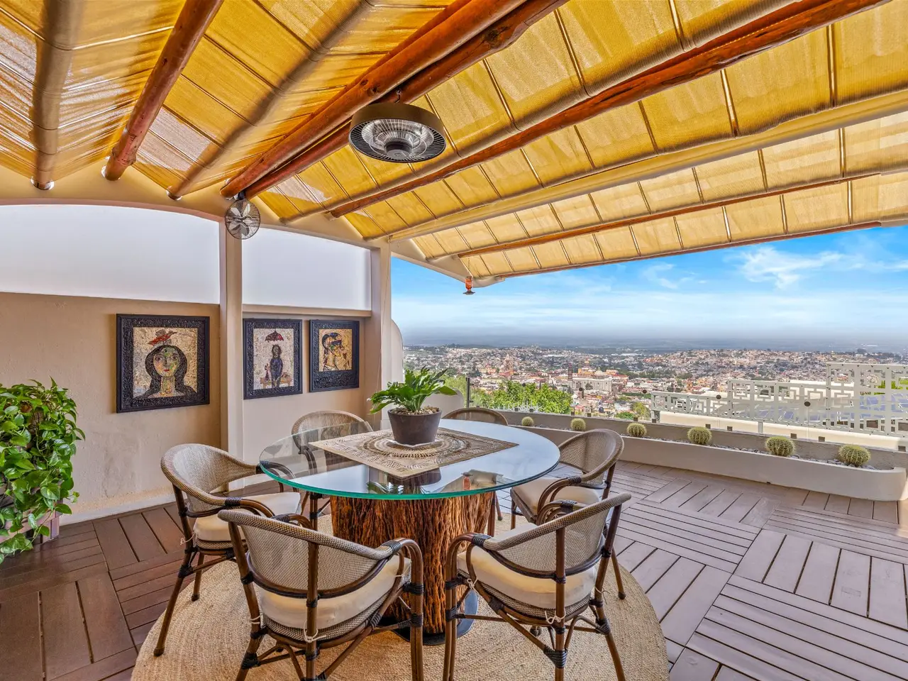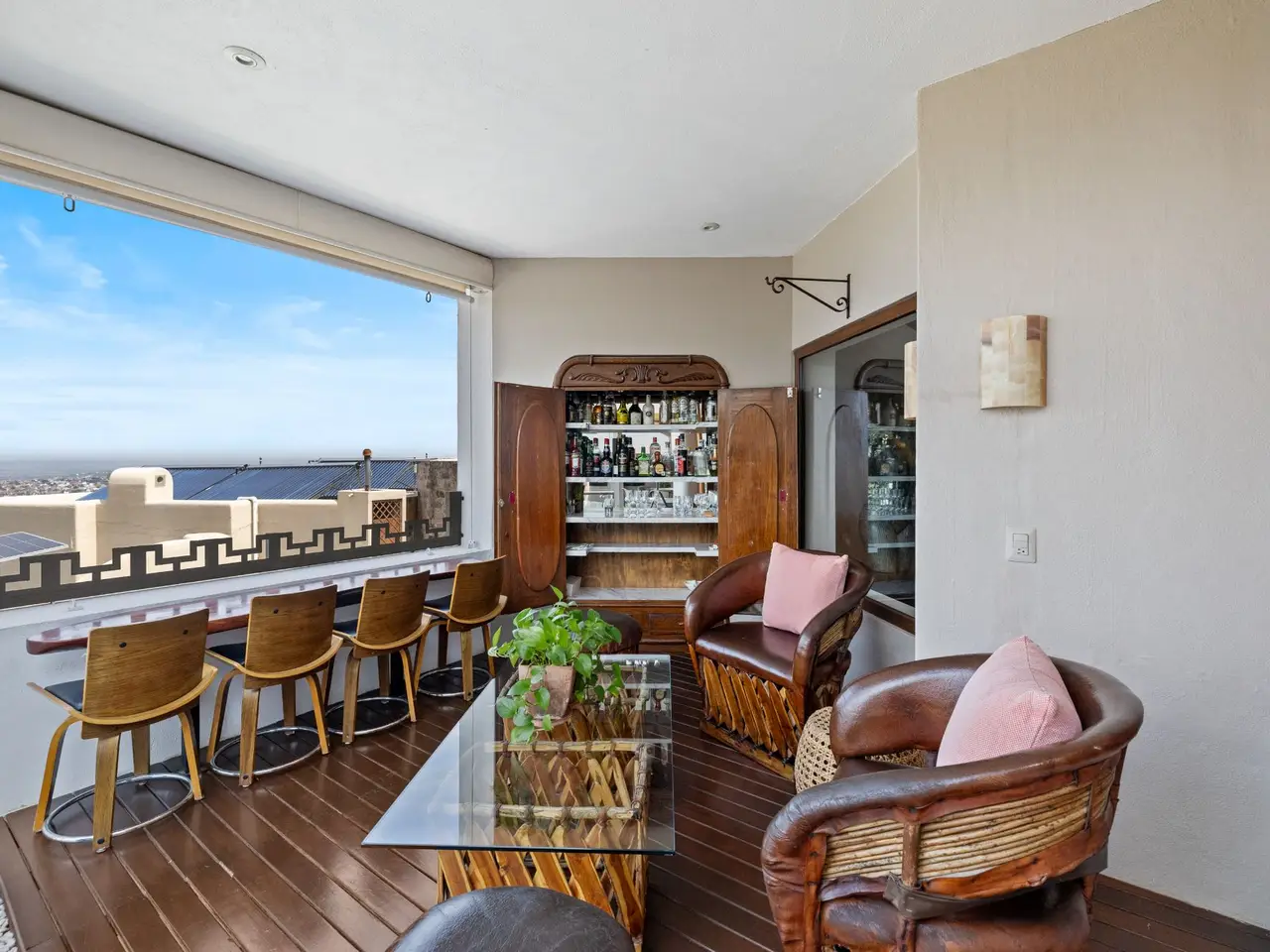 Prepare to be stunned when you enter Casa del Foro. Perched on a hillside overlooking all of downtown San Miguel de Allende and far beyond, this recently remodeled luxury house offers elegant living spaces, once-in-a-lifetime views and all of the amenities you’d expect to find in this desirable neighborhood. No detail has been overlooked, from the unique boveda ceilings and hand-carved doors to the casual dining nook in the kitchen that still manages to take advantage of the views of Centro. The open floor plan maximizes the incredible vistas to the South, the West and the North. You will enjoy indoor/outdoor living, complete with a cozy high tech bar and two dining areas, powered sun-blocking shades and more. The main house features a gracious entry courtyard with a remarkable sculpture by a renown artist. To the left are two separate guest bedrooms with gorgeous boveda ceilings and ensuite bathrooms. One you enter the main indoor sala, you can easily access the kitchen, the guest bathroom, the indoor and outdoor dining areas and a covered terrazzo that will take your breath away. Everywhere you look, the thoughtful design is evident. The intimate indoor/outdoor bar is right next to a private jacuzzi which has some of the best views in the house. Downstairs is a beautifully appointed two-bedroom apartment with its own kitchen and sala that can be used for guests or even rented out, thanks to the discreet separate entrance. Climb the gracefully dramatic wooden staircase and you will arrive at the luxurious master bedroom suite with views, motorized blackout drapes, an attached gym and a comfortable office. With whole house water purification, solar water heating and more bells and whistles than can fit in this description, Casa del Foro is one of San Miguel’s most luxurious properties today. The house features a lot of elegant handmade furniture and is offered turnkey with some exceptions, and the owners are also willing to consider an additional art package which would include much of the outstanding art collection. Amenities Garage 5 bedrooms 6 bathrooms Separate casita/apartment Views Solar water heating Furnished with exceptions Whole house water purification Personal gym Office Outdoor bar and entertaining area Hot tub Boveda Ceilings