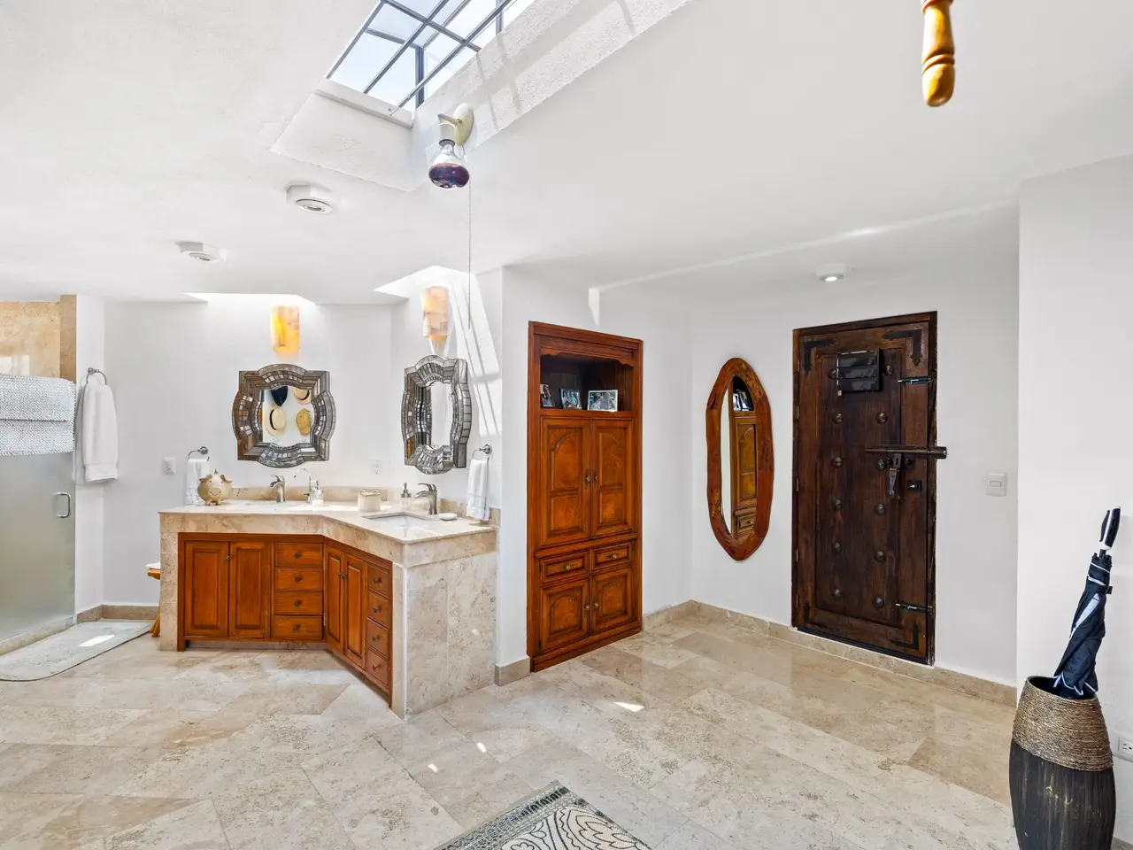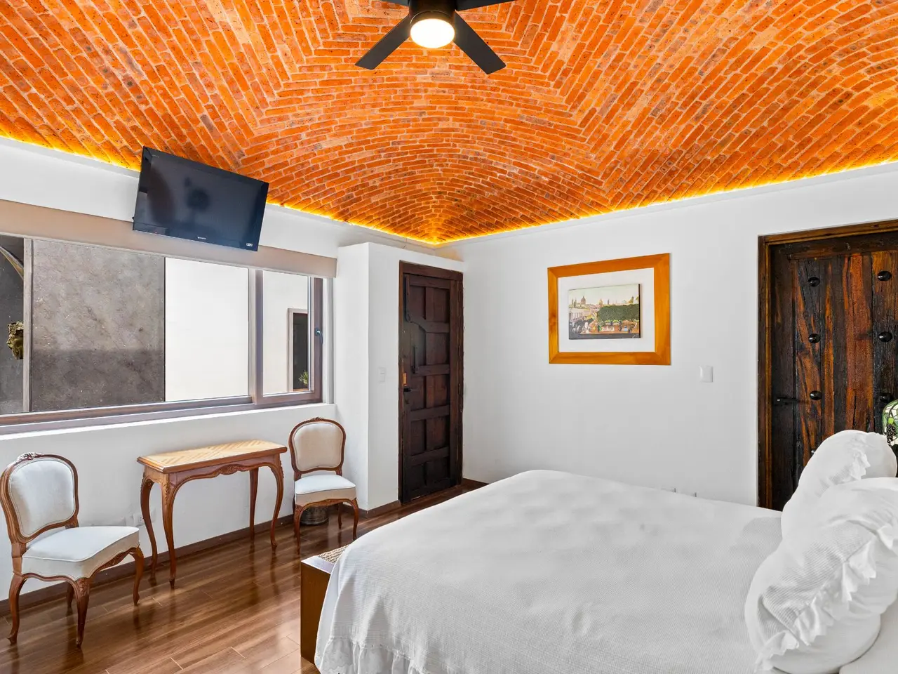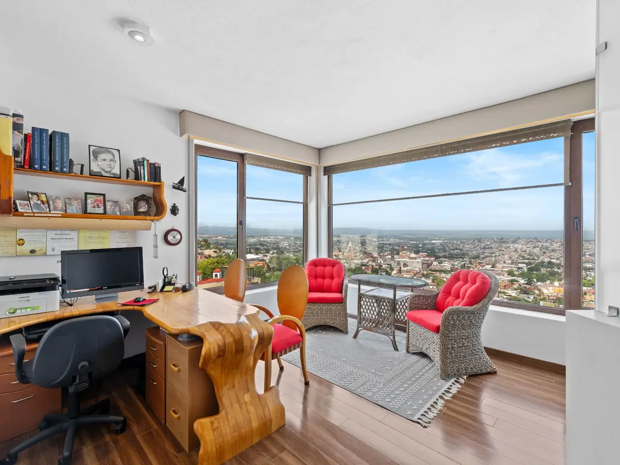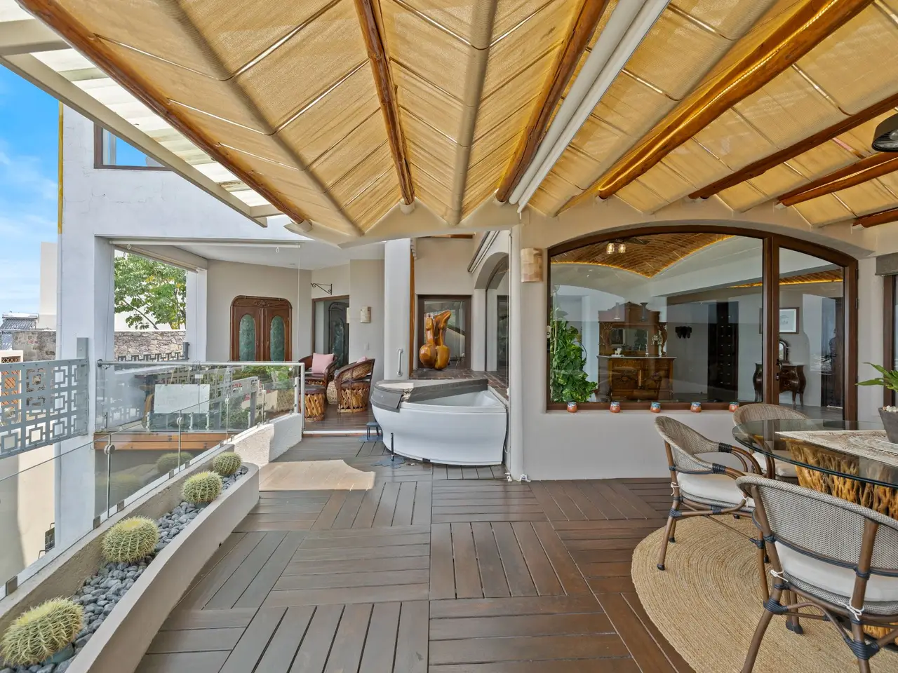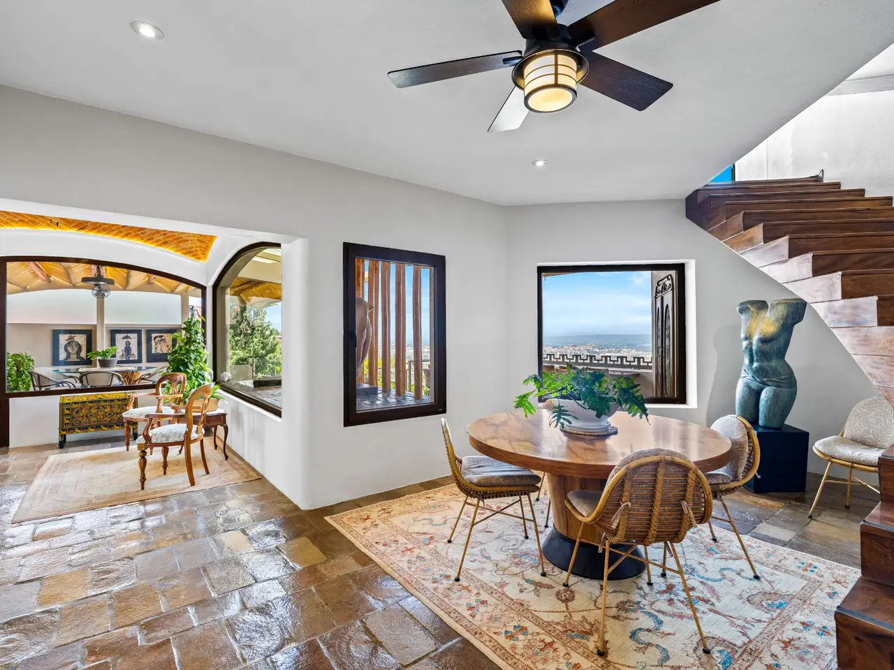 Prepare to be stunned when you enter Casa del Foro. Perched on a hillside overlooking all of downtown San Miguel de Allende and far beyond, this recently remodeled luxury house offers elegant living spaces, once-in-a-lifetime views and all of the amenities you’d expect to find in this desirable neighborhood. No detail has been overlooked, from the unique boveda ceilings and hand-carved doors to the casual dining nook in the kitchen that still manages to take advantage of the views of Centro. The open floor plan maximizes the incredible vistas to the South, the West and the North. You will enjoy indoor/outdoor living, complete with a cozy high tech bar and two dining areas, powered sun-blocking shades and more. The main house features a gracious entry courtyard with a remarkable sculpture by a renown artist. To the left are two separate guest bedrooms with gorgeous boveda ceilings and ensuite bathrooms. One you enter the main indoor sala, you can easily access the kitchen, the guest bathroom, the indoor and outdoor dining areas and a covered terrazzo that will take your breath away. Everywhere you look, the thoughtful design is evident. The intimate indoor/outdoor bar is right next to a private jacuzzi which has some of the best views in the house. Downstairs is a beautifully appointed two-bedroom apartment with its own kitchen and sala that can be used for guests or even rented out, thanks to the discreet separate entrance. Climb the gracefully dramatic wooden staircase and you will arrive at the luxurious master bedroom suite with views, motorized blackout drapes, an attached gym and a comfortable office. With whole house water purification, solar water heating and more bells and whistles than can fit in this description, Casa del Foro is one of San Miguel’s most luxurious properties today. The house features a lot of elegant handmade furniture and is offered turnkey with some exceptions, and the owners are also willing to consider an additional art package which would include much of the outstanding art collection. Amenities Garage 5 bedrooms 6 bathrooms Separate casita/apartment Views Solar water heating Furnished with exceptions Whole house water purification Personal gym Office Outdoor bar and entertaining area Hot tub Boveda Ceilings