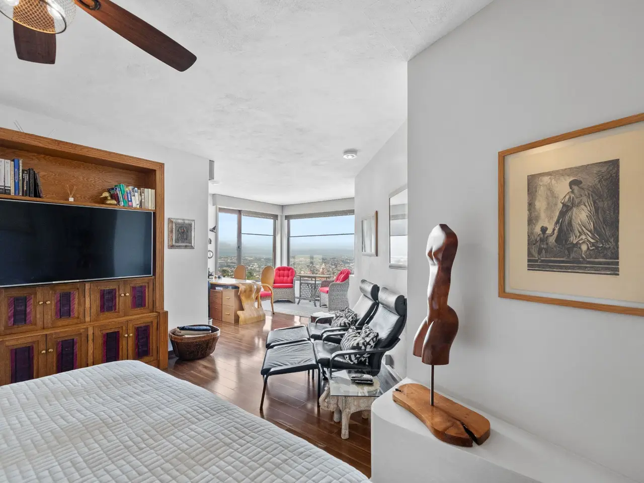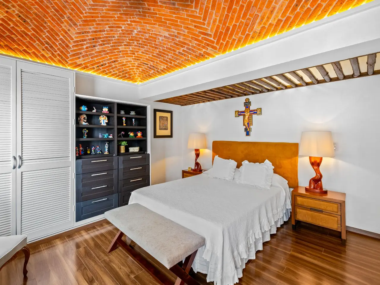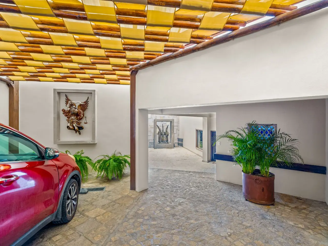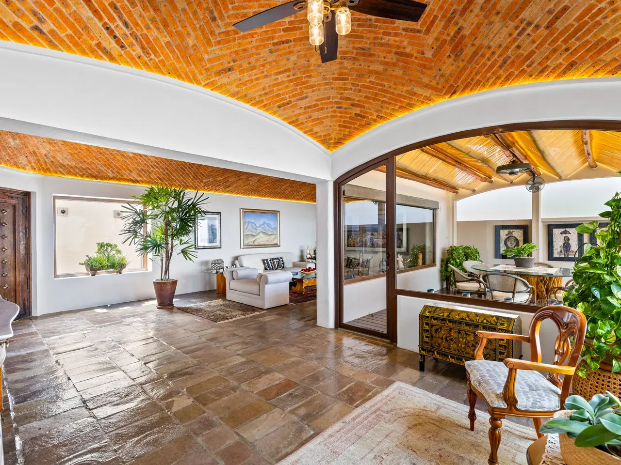 Prepare to be stunned when you enter Casa del Foro. Perched on a hillside overlooking all of downtown San Miguel de Allende and far beyond, this recently remodeled luxury house offers elegant living spaces, once-in-a-lifetime views and all of the amenities you’d expect to find in this desirable neighborhood. No detail has been overlooked, from the unique boveda ceilings and hand-carved doors to the casual dining nook in the kitchen that still manages to take advantage of the views of Centro. The open floor plan maximizes the incredible vistas to the South, the West and the North. You will enjoy indoor/outdoor living, complete with a cozy high tech bar and two dining areas, powered sun-blocking shades and more. The main house features a gracious entry courtyard with a remarkable sculpture by a renown artist. To the left are two separate guest bedrooms with gorgeous boveda ceilings and ensuite bathrooms. One you enter the main indoor sala, you can easily access the kitchen, the guest bathroom, the indoor and outdoor dining areas and a covered terrazzo that will take your breath away. Everywhere you look, the thoughtful design is evident. The intimate indoor/outdoor bar is right next to a private jacuzzi which has some of the best views in the house. Downstairs is a beautifully appointed two-bedroom apartment with its own kitchen and sala that can be used for guests or even rented out, thanks to the discreet separate entrance. Climb the gracefully dramatic wooden staircase and you will arrive at the luxurious master bedroom suite with views, motorized blackout drapes, an attached gym and a comfortable office. With whole house water purification, solar water heating and more bells and whistles than can fit in this description, Casa del Foro is one of San Miguel’s most luxurious properties today. The house features a lot of elegant handmade furniture and is offered turnkey with some exceptions, and the owners are also willing to consider an additional art package which would include much of the outstanding art collection. Amenities Garage 5 bedrooms 6 bathrooms Separate casita/apartment Views Solar water heating Furnished with exceptions Whole house water purification Personal gym Office Outdoor bar and entertaining area Hot tub Boveda Ceilings