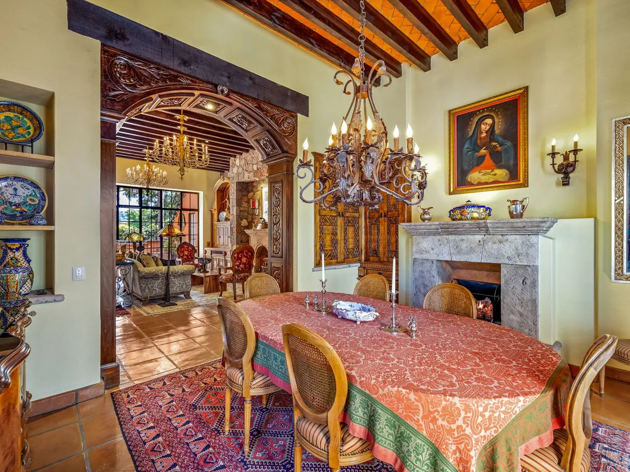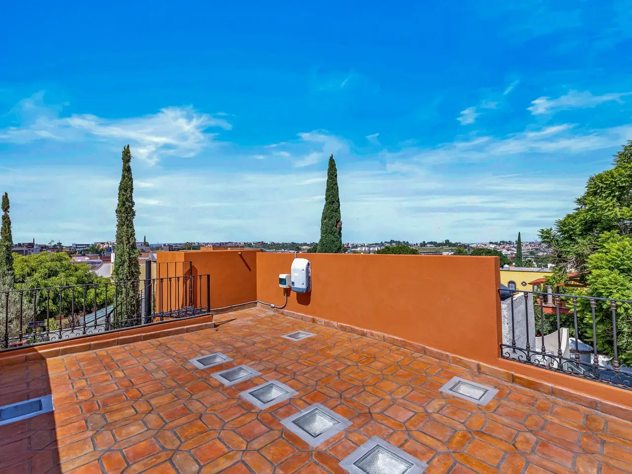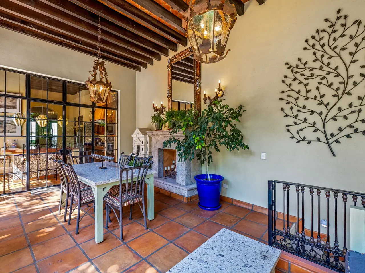You enter Casa Flora through a graceful foyer, where a stone fountain and hand-crafted details set the tone for the home. From here, an anteroom provides access to the private quarters. The master suite is especially impressive, with carved wood accents, a cantera fireplace, and air conditioning for year-round comfort. Glass doors open to a garden and patio with another fountain and a covered seating area — ideal for enjoying the outdoors in privacy. The en-suite bathroom features high end finishes, including matching circular mirrors over dual sinks, and a spacious walk-in closet. Abundant natural light fills the space throughout the day. The guest bedroom offers its own en-suite bathroom and bright windows, making it comfortable for family or visitors. A laundry room is conveniently located off the anteroom. From the anteroom, a short staircase leads up to the main living level. The kitchen features granite countertops, high-end appliances, a large island, and hand-carved cabinetry. Adjacent is a terrace perfect for dining al fresco or enjoying evening cocktails. The formal living room centers around a grand cantera fireplace, complemented by a impressive custom cabinet built by a local master craftsman, two elegant chandeliers, and a grand piano. A formal dining room extends from the living area, offering a refined space for entertaining. From the kitchen terrace, stairs lead down to the back garden, where the sound of the fountain carries through the air. This level also includes a guest bathroom. Another short flight of stairs brings you to a second terrace with a sitting area and sweeping views. On this level you’ll also find a thoughtfully designed office with custom cabinetry and its own full bath. The office opens to yet another patio and could easily serve as a third bedroom if desired. From the upper terrace, a spiral staircase leads to a rooftop with panoramic views of the Parroquia and the surrounding hills. Casa Flora also offers modern conveniences and upgrades that enhance its livability. The home is equipped with eight solar panels for energy efficiency, a whole-house water purification and pressurization system, and mini-split air conditioning units. Casa Flora is offered with a carefully curated furniture package, including fine furnishings and antiques of exceptional quality. This turnkey offering allows new owners to step directly into a beautifully finished home, ready to be enjoyed from day one.