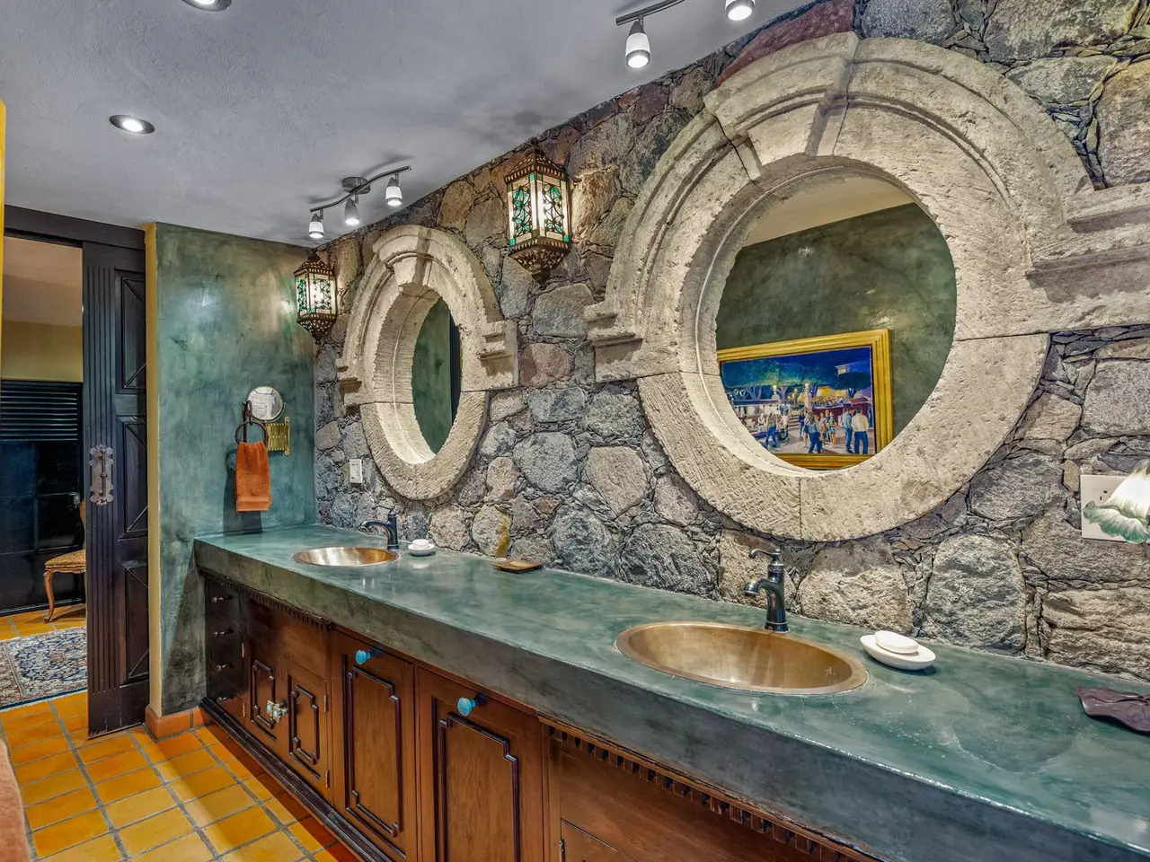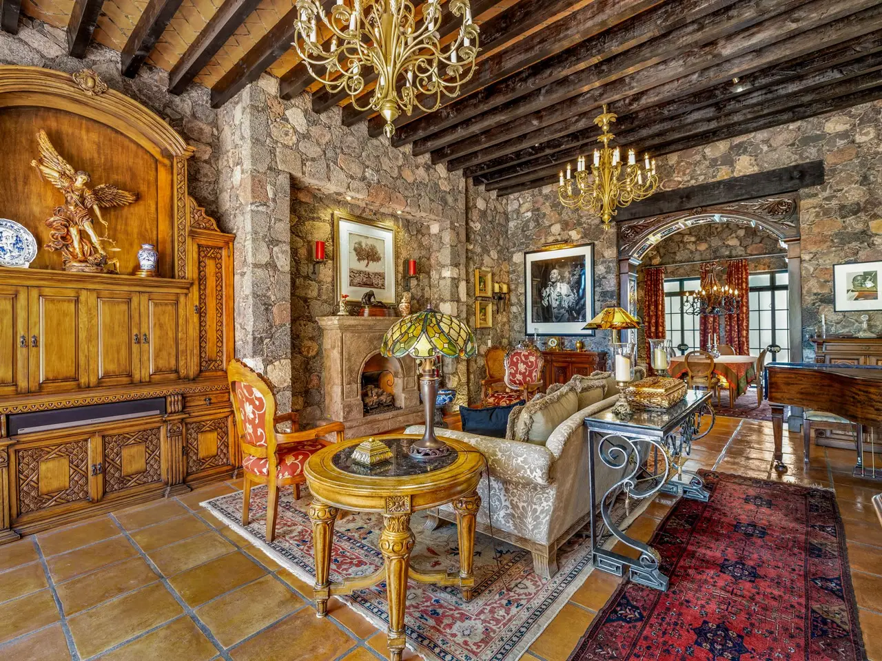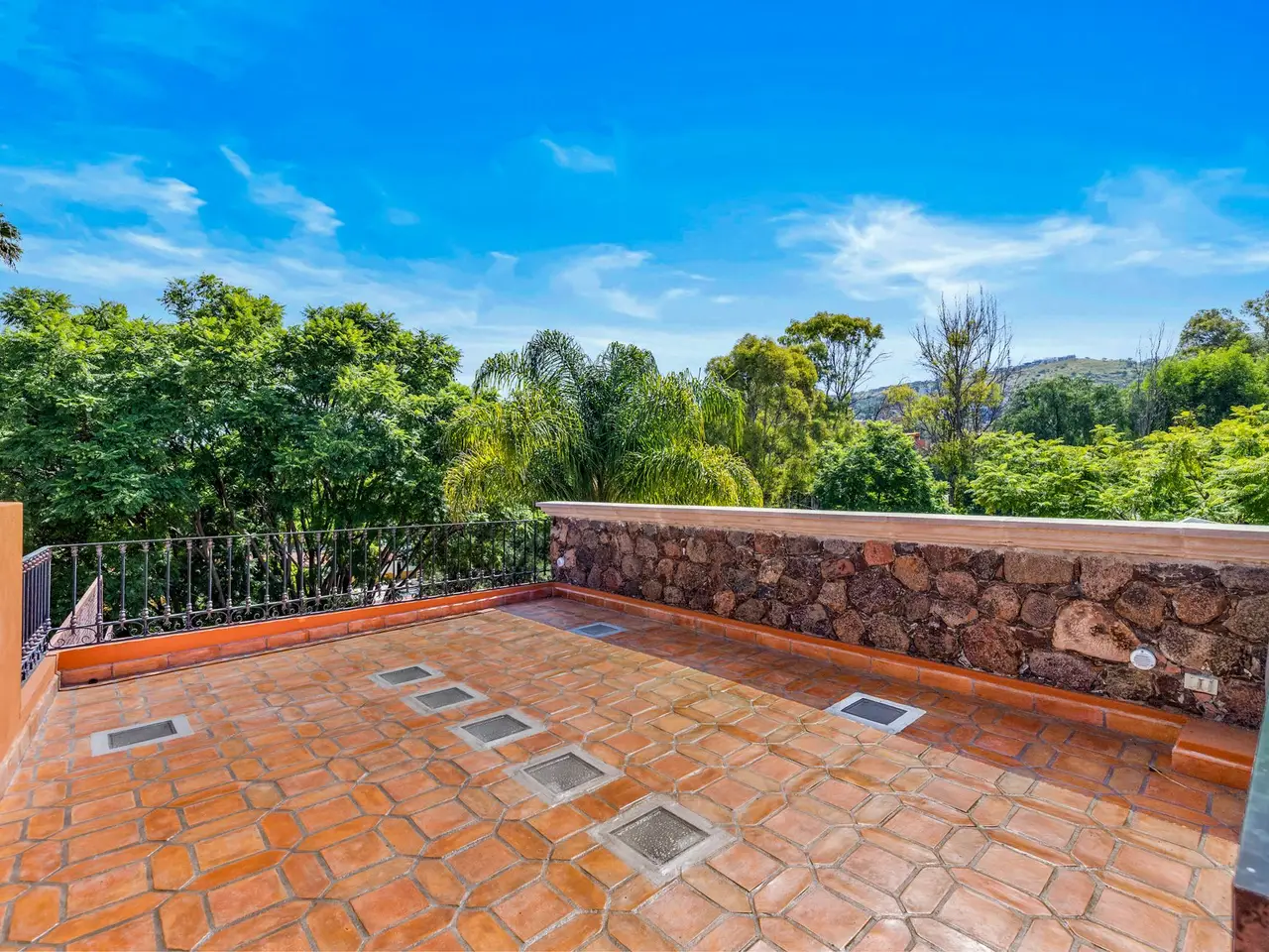 You enter Casa Flora through a graceful foyer, where a stone fountain and hand-crafted details set the tone for the home. From here, an anteroom provides access to the private quarters. The master suite is especially impressive, with carved wood accents, a cantera fireplace, and air conditioning for year-round comfort. Glass doors open to a garden and patio with another fountain and a covered seating area — ideal for enjoying the outdoors in privacy. The en-suite bathroom features high end finishes, including matching circular mirrors over dual sinks, and a spacious walk-in closet. Abundant natural light fills the space throughout the day. The guest bedroom offers its own en-suite bathroom and bright windows, making it comfortable for family or visitors. A laundry room is conveniently located off the anteroom. From the anteroom, a short staircase leads up to the main living level. The kitchen features granite countertops, high-end appliances, a large island, and hand-carved cabinetry. Adjacent is a terrace perfect for dining al fresco or enjoying evening cocktails. The formal living room centers around a grand cantera fireplace, complemented by a impressive custom cabinet built by a local master craftsman, two elegant chandeliers, and a grand piano. A formal dining room extends from the living area, offering a refined space for entertaining. From the kitchen terrace, stairs lead down to the back garden, where the sound of the fountain carries through the air. This level also includes a guest bathroom. Another short flight of stairs brings you to a second terrace with a sitting area and sweeping views. On this level you’ll also find a thoughtfully designed office with custom cabinetry and its own full bath. The office opens to yet another patio and could easily serve as a third bedroom if desired. From the upper terrace, a spiral staircase leads to a rooftop with panoramic views of the Parroquia and the surrounding hills. Casa Flora also offers modern conveniences and upgrades that enhance its livability. The home is equipped with eight solar panels for energy efficiency, a whole-house water purification and pressurization system, and mini-split air conditioning units. Casa Flora is offered with a carefully curated furniture package, including fine furnishings and antiques of exceptional quality. This turnkey offering allows new owners to step directly into a beautifully finished home, ready to be enjoyed from day one.