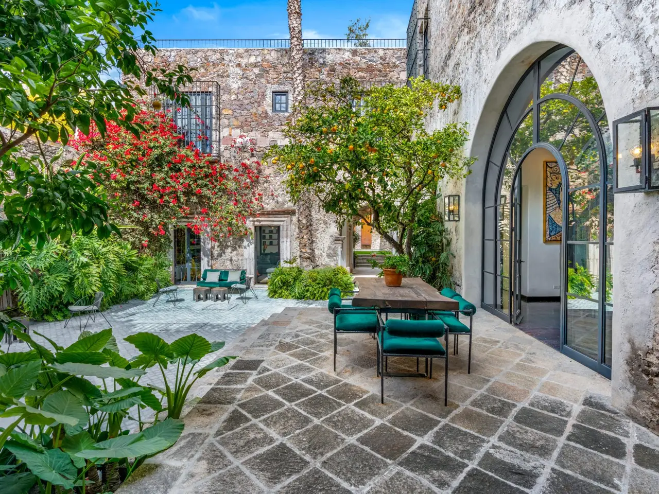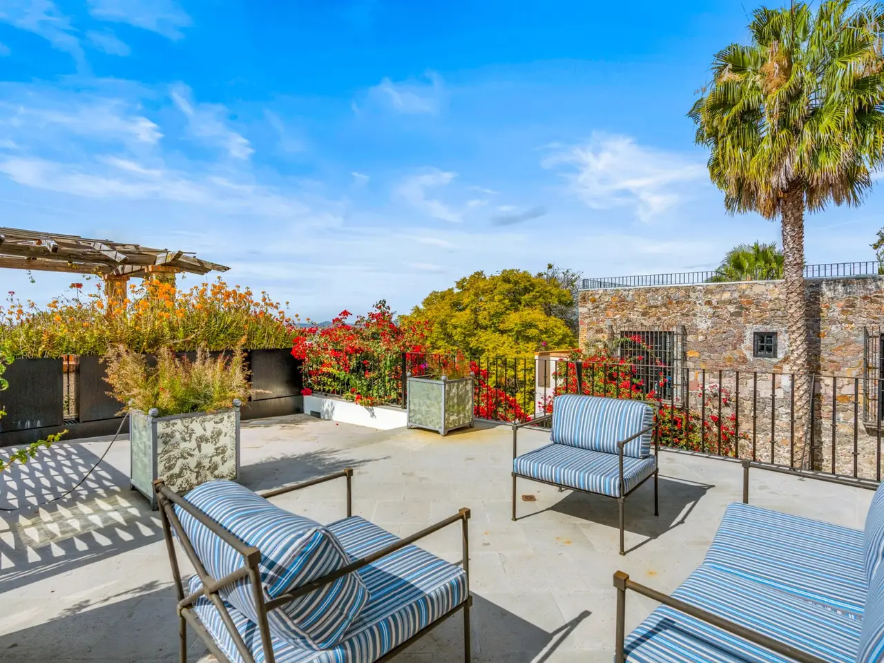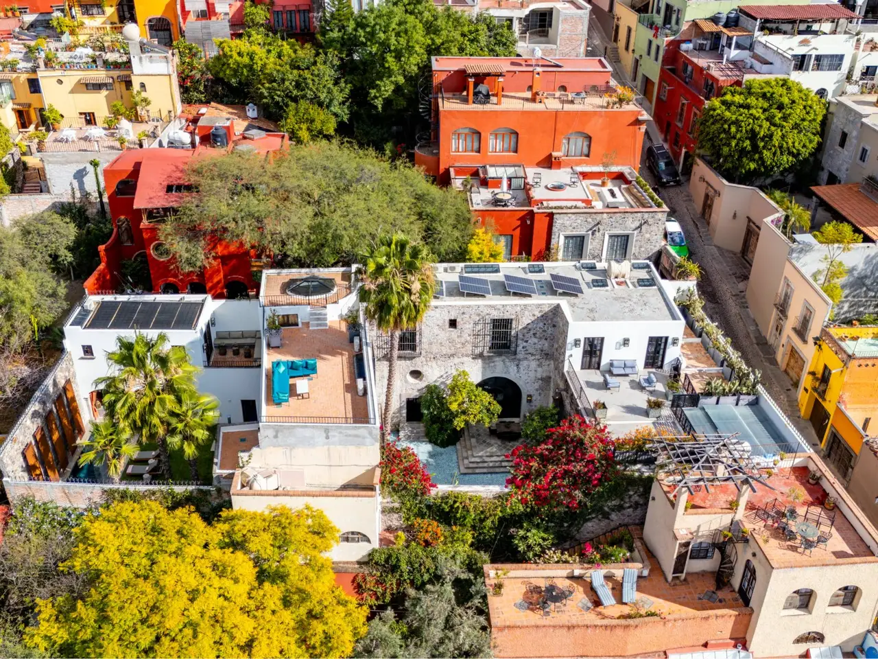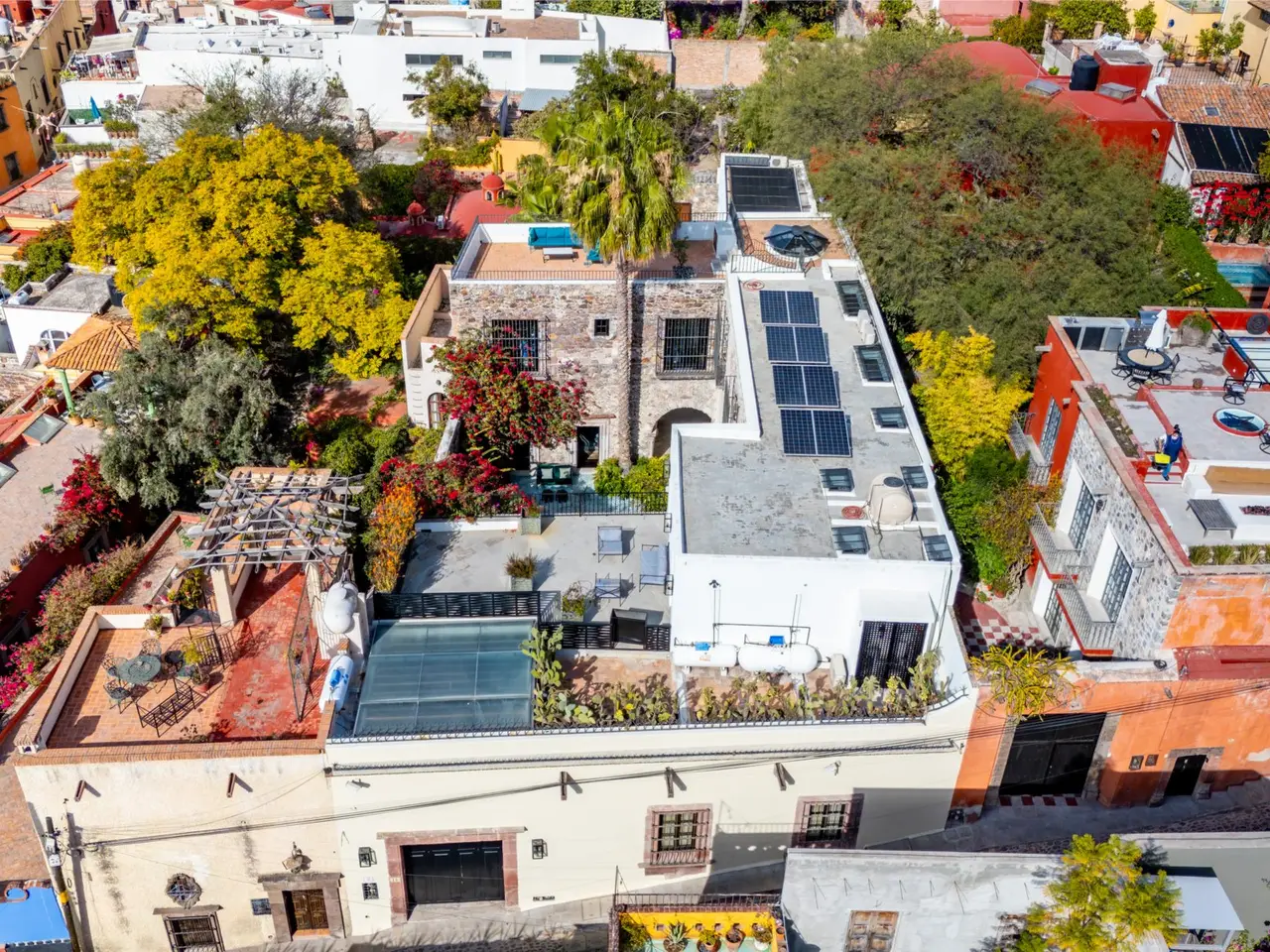 Villa Garita: A Historic Jewel in the Heart of San Miguel de Allende Experience the pinnacle of luxury living at Villa Garita, a masterfully restored historic property nestled in the heart of San Miguel de Allende’s enchanting Centro Histórico. Designed by renowned interior designer Rachel Horn, this exquisite Colonial treasure exudes elegance and sophistication, blending timeless architectural details with modern comforts. Boasting five spacious bedrooms and five-and-a-half bathrooms, Villa Garita captivates with its soaring ceilings, intricate architectural features, and impeccable attention to detail. The expansive verdant courtyard, complete with a charming water feature, sets the tone for serenity, while the multiple outdoor spaces invite relaxation and refined entertaining. The chef’s kitchen is a culinary masterpiece, equipped with state-of-the-art appliances, silver-leaf cabinets, and luxurious marble countertops. For wellness enthusiasts, an exercise studio with views of the lush back garden provides the perfect retreat. The property’s thoughtfully designed living spaces include formal living and dining areas, a cozy den, and a spacious media room located at the heart of the home. Whether hosting a lively gathering or enjoying a quiet evening, these spaces cater to every occasion. Upstairs, the five beautifully appointed bedrooms offer privacy and comfort. Three feature en suite bathrooms, while the remaining two share a stylishly designed bathroom. The crown jewel of Villa Garita is its rooftop terrace, offering panoramic views of San Miguel’s iconic churches—a perfect spot to enjoy breathtaking sunsets or festive celebrations. Step outside into the lush rear garden, where a sparkling swimming pool awaits alongside a fully equipped indoor/outdoor living room. This inviting space features a sitting area, fireplace, full bathroom, wet bar, and game area, making it ideal for year-round enjoyment. A true oasis in the heart of the city, Villa Garita is offered fully furnished, with select exclusions. Don’t miss this extraordinary opportunity to own one of San Miguel de Allende’s most coveted properties. Discover Villa Garita—where historic charm meets modern luxury.