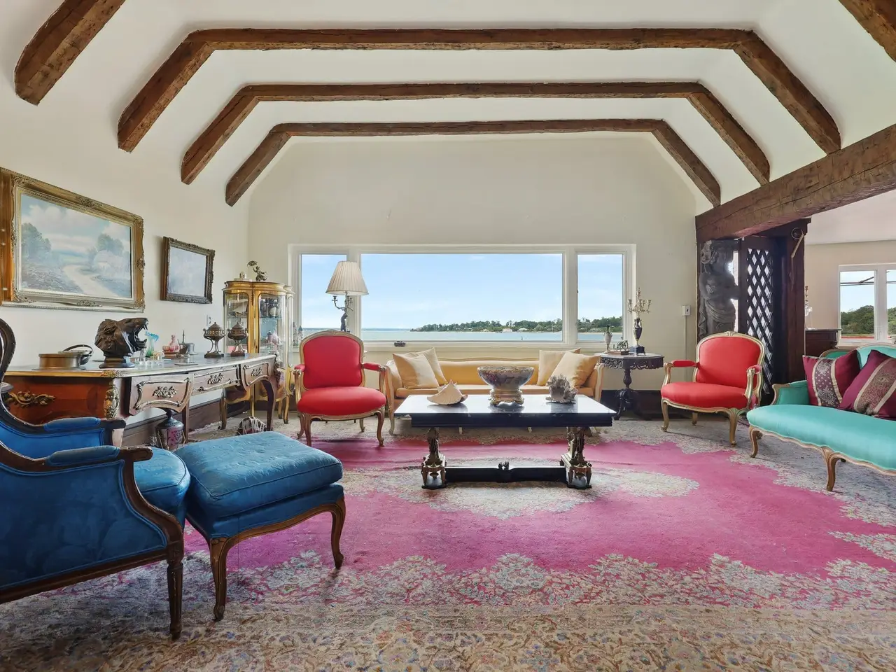 Open floor plan, Preached high above with panoramic water views from every room, this exceptional waterfront ranch offers an unparalleled lifestyle in one of Sands Point's most prestigious and private enclaves. Nestled on over an acre of lush, landscaped grounds, the property exudes serenity and grandeur. This historic estate has been meticulously reimagined into a bespoke masterpiece, where timeless architecture meets sophisticated modern design. Every detail has been thoroughly curated to preserve classic charm while while incorporating today's most elegant finishes. This open and expansive layout, offers versatile spaces ideal for both everyday living and grand entertaining - all oriented to capture the home's sweeping water views. water front, beach, Featuring 5 bedrooms, 3 full baths and a powder room, Library, Deck the main residence offers beautifully proportioned rooms filled with natural light and framed by expensive windows that showcase sweeping panoramic views. Inground Pool fenced in with Pool House with Full Bathroom. This property is inspired by the architecture of Falaise, the Henry F. Guggenheim estate which is now Sands Point Preserve.