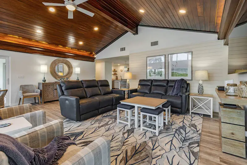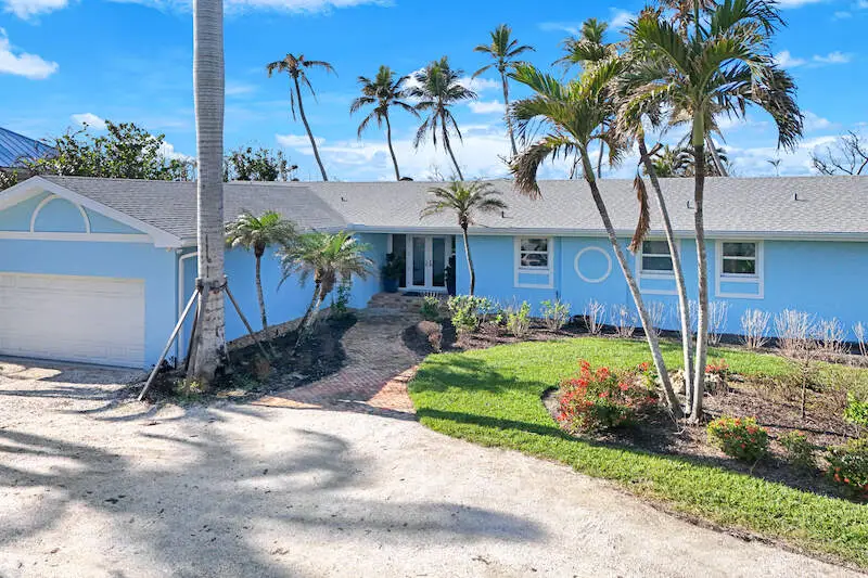 Gulf frontage. This coastal oasis with a mid-century modern feel boasts an acre of tranquil privacy in a garden-like setting with a meandering path to the water's edge to play in the warm sand or enjoy the gulf waters. The rear chateau like elevation is complimented by a large patio area providing room for outdoor dining/seating, a sparkling pool and spa perfect for a cooling swim, sunbathing poolside, or spending the evening in the spa soaking up the warmth and breathtaking sunset views. This home has been completely remodeled down to the studs and features a newer roof, impact glass windows and doors, pool scheduled to be resurfaced in Summer 2025 and much more. Ideal setting for entertaining, you will appreciate the inviting main gathering area with vaulted cypress tongue and groove ceiling, new flooring, three arches in the home, sliding doors from each room with western exposure and chic furnishings to compliment the ultimate Island retreat. This stately neighborhood of Chateau Sur Mer offers just 70 home sites, casual elegance and privacy. Exterior images are pre-Milton and landscaping is in the process of being nurtured or replaced. Great rental; future bookings to be honored.
