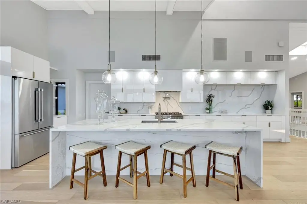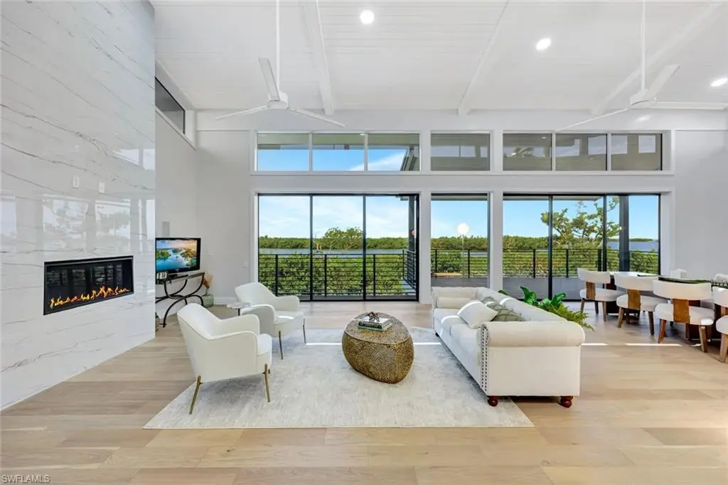 PRICE REDUCTION Please Bring Your Offers! Set within the serene enclave of Heron's Landing along the unspoiled waters of Clam Bayou, this extraordinary waterfront residence is a true architectural gem with furnishings negotiable. Originally envisioned in the spirit of Frank Lloyd Wright's Prairie-style design, the home reflects a deep connection to its natural surroundings through clean horizontal lines, expansive overhangs, and thoughtfully framed views that invite the outdoors in. Elegantly spanning over 3,000 square feet, the main level features four beautifully appointed bedrooms, three full bathrooms, and a powder room, offering both refined comfort and effortless flow. The primary suite is a sanctuary of its own, complete with dual walk-in closets, a spa-like soaking tub, and a luxurious dual-head shower. Two guest suites each enjoy private en suite baths, while a fourth bedroom provides double closets and serene treetop views. Graceful soaring ceilings and walls of glass allow natural light to cascade through the interiors, highlighting the architectural artistry and drawing focus to the lush mangroves and tranquil waters beyond. A private elevator ensures seamless movement between levels, adding ease and elegance to daily living. The heart of the home the chef's kitchen combines striking aesthetics with culinary functionality. Outfitted with a waterfall-edge quartz island, sleek gloss cabinetry, top-tier Thermador appliances, and a pot filler faucet, it's as well suited for quiet mornings as it is for lavish entertaining. Nearby, the laundry room offers abundant built-in storage and a deep utility sink for added practicality. The lower level features a 2-car garage and three versatile bonus rooms, one with an en suite bathùperfect as a studio, fitness room, or guest retreat. Outdoors, a saltwater pool and spa invite restful afternoons and al fresco evenings beneath the stars, framed by the natural beauty of Sanibel Island. Tucked along the peaceful edge of Clam Bayou, this residence captures enchanting views at every turnùimagine sipping coffee as herons glide across the water, or launching your kayak from the shoreline for an afternoon paddle through protected waters. This is more than a homeùit is an experience in graceful coastal living, where architectural sophistication and nature exist in perfect harmony. Opportunities like this are rare; schedule your private showing and discover the soul of Sanibel living.