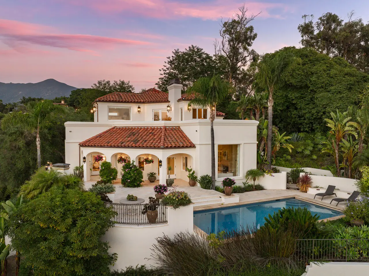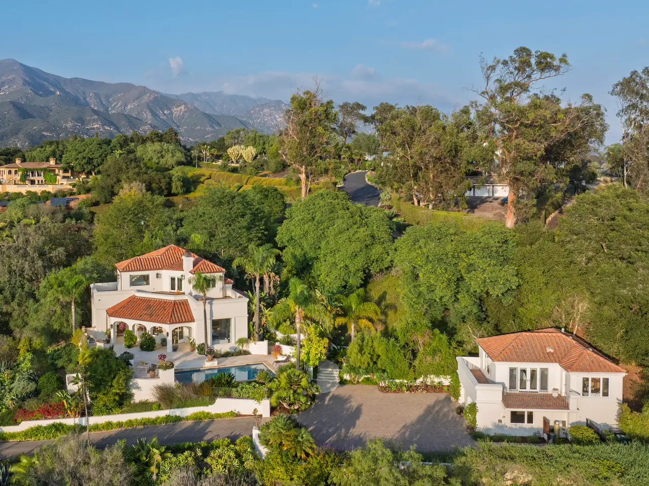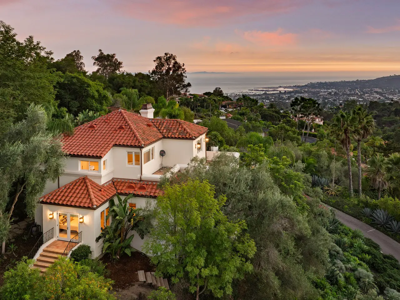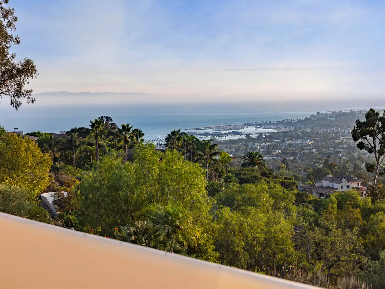 Behind private gates on Calle Elegante, a world of serenity and beauty unfolds on 1.7 lush acres. The moment you step inside, walls of glass reveal sweeping views of the ocean, islands, harbor, and mountains--reminders that this is no ordinary home, but a sanctuary elevated by nature itself. The story begins in the heart of the house, where soaring ceilings, stone floors, and a fireplace anchor the formal living room. Light pours in, filling the space with warmth, while the dining and family rooms blend seamlessly with the kitchen, creating an open, effortless flow for gatherings both large and small. Upstairs, the primary suite continues the story of retreat and renewal. With its own sitting room, private fireplace, and adjoining office, it's a place to wake slowly to the sunrise or wind down as the evening light paints the horizon. Two additional en-suite bedrooms carry the story further: one with doors that open directly to a secret garden hideaway, and the other framing the drama of the mountains. Step outside, and the home transforms into a private resort carved into the hillside. Inspired by the love of the Bacara Resort, the current owner designed the pool terrace to rival the luxury of a five-star retreat without ever leaving home. A sparkling pool shimmers in the sunlight, anchored by a covered patio with outdoor fireplace, a fully equipped outdoor kitchen, and multiple lounge areas. Here, mornings begin with quiet coffee overlooking the coastline, and evenings end with golden sunsets shared among friends. For visitors, a private guest suite above the garage offers decks, views, and independence a retreat within a retreat. Surrounding it all are lovely gardens, a koi pond, and mature trees that have grown into characters of their own, wrapping the home in shade, color, and year-round beauty.This is a home designed not just to live in, but to live well. Located in the sought-after Cold Spring School District, it blends elegance with comfort, privacy with welcome, and luxury with nature an everyday escape on Calle Elegante.