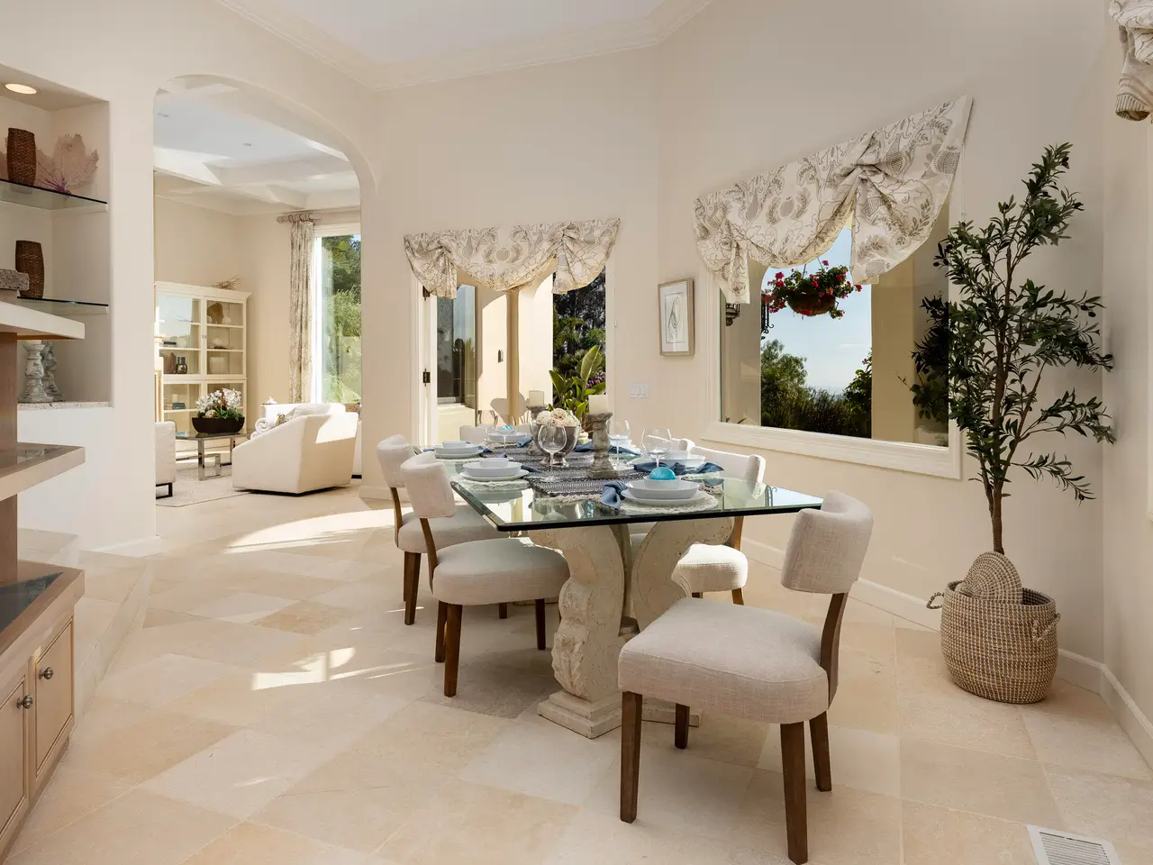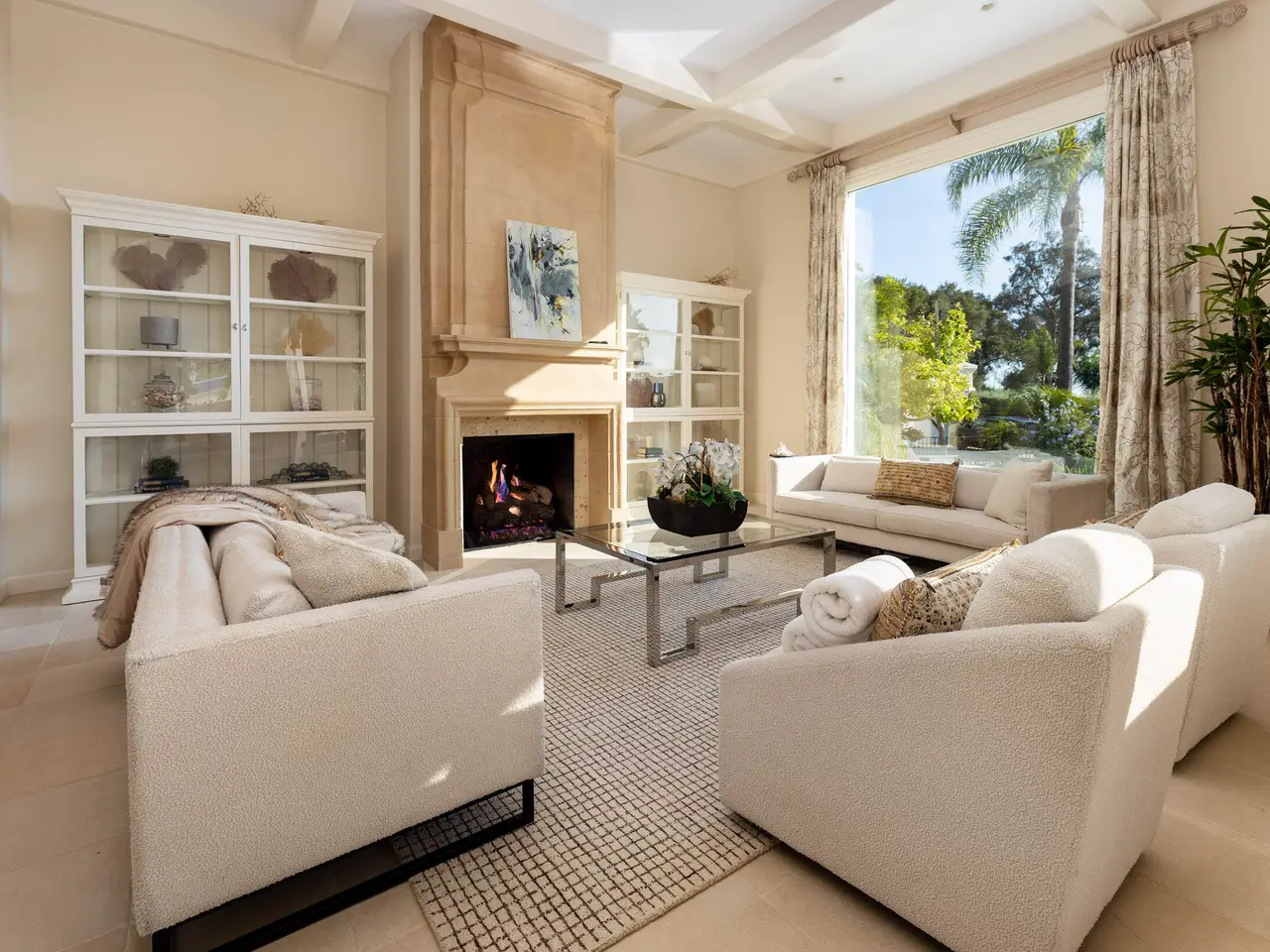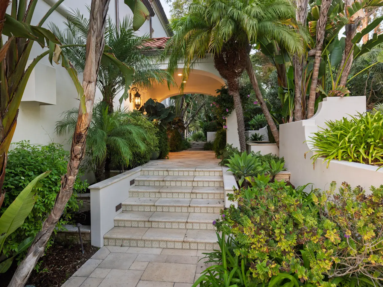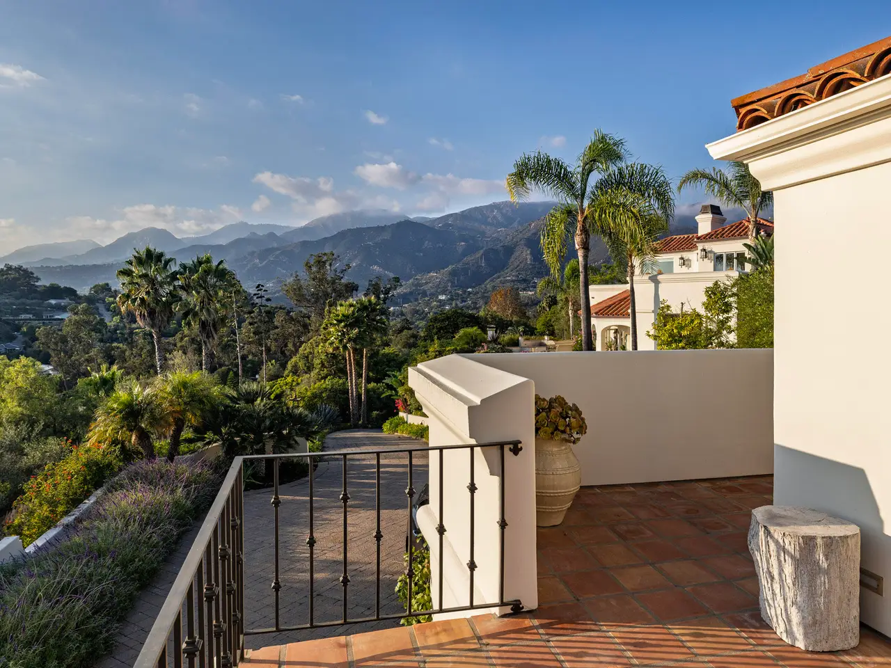 Behind private gates on Calle Elegante, a world of serenity and beauty unfolds on 1.7 lush acres. The moment you step inside, walls of glass reveal sweeping views of the ocean, islands, harbor, and mountains--reminders that this is no ordinary home, but a sanctuary elevated by nature itself. The story begins in the heart of the house, where soaring ceilings, stone floors, and a fireplace anchor the formal living room. Light pours in, filling the space with warmth, while the dining and family rooms blend seamlessly with the kitchen, creating an open, effortless flow for gatherings both large and small. Upstairs, the primary suite continues the story of retreat and renewal. With its own sitting room, private fireplace, and adjoining office, it's a place to wake slowly to the sunrise or wind down as the evening light paints the horizon. Two additional en-suite bedrooms carry the story further: one with doors that open directly to a secret garden hideaway, and the other framing the drama of the mountains. Step outside, and the home transforms into a private resort carved into the hillside. Inspired by the love of the Bacara Resort, the current owner designed the pool terrace to rival the luxury of a five-star retreat without ever leaving home. A sparkling pool shimmers in the sunlight, anchored by a covered patio with outdoor fireplace, a fully equipped outdoor kitchen, and multiple lounge areas. Here, mornings begin with quiet coffee overlooking the coastline, and evenings end with golden sunsets shared among friends. For visitors, a private guest suite above the garage offers decks, views, and independence a retreat within a retreat. Surrounding it all are lovely gardens, a koi pond, and mature trees that have grown into characters of their own, wrapping the home in shade, color, and year-round beauty.This is a home designed not just to live in, but to live well. Located in the sought-after Cold Spring School District, it blends elegance with comfort, privacy with welcome, and luxury with nature an everyday escape on Calle Elegante.