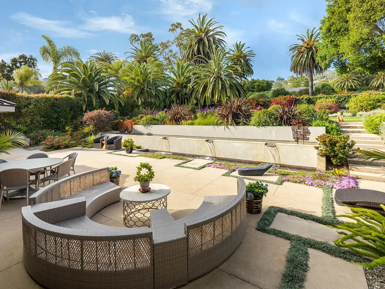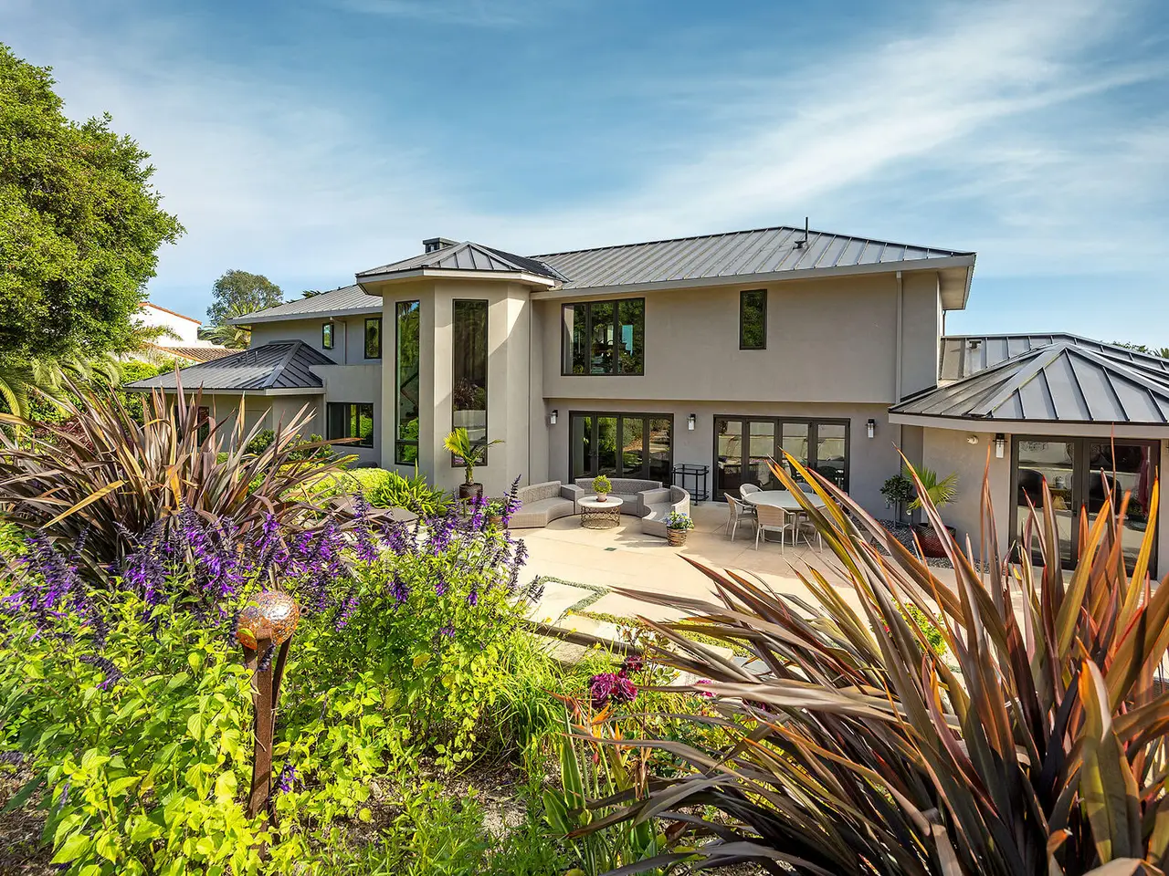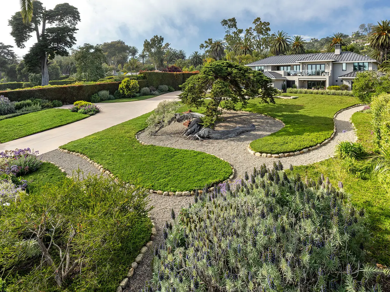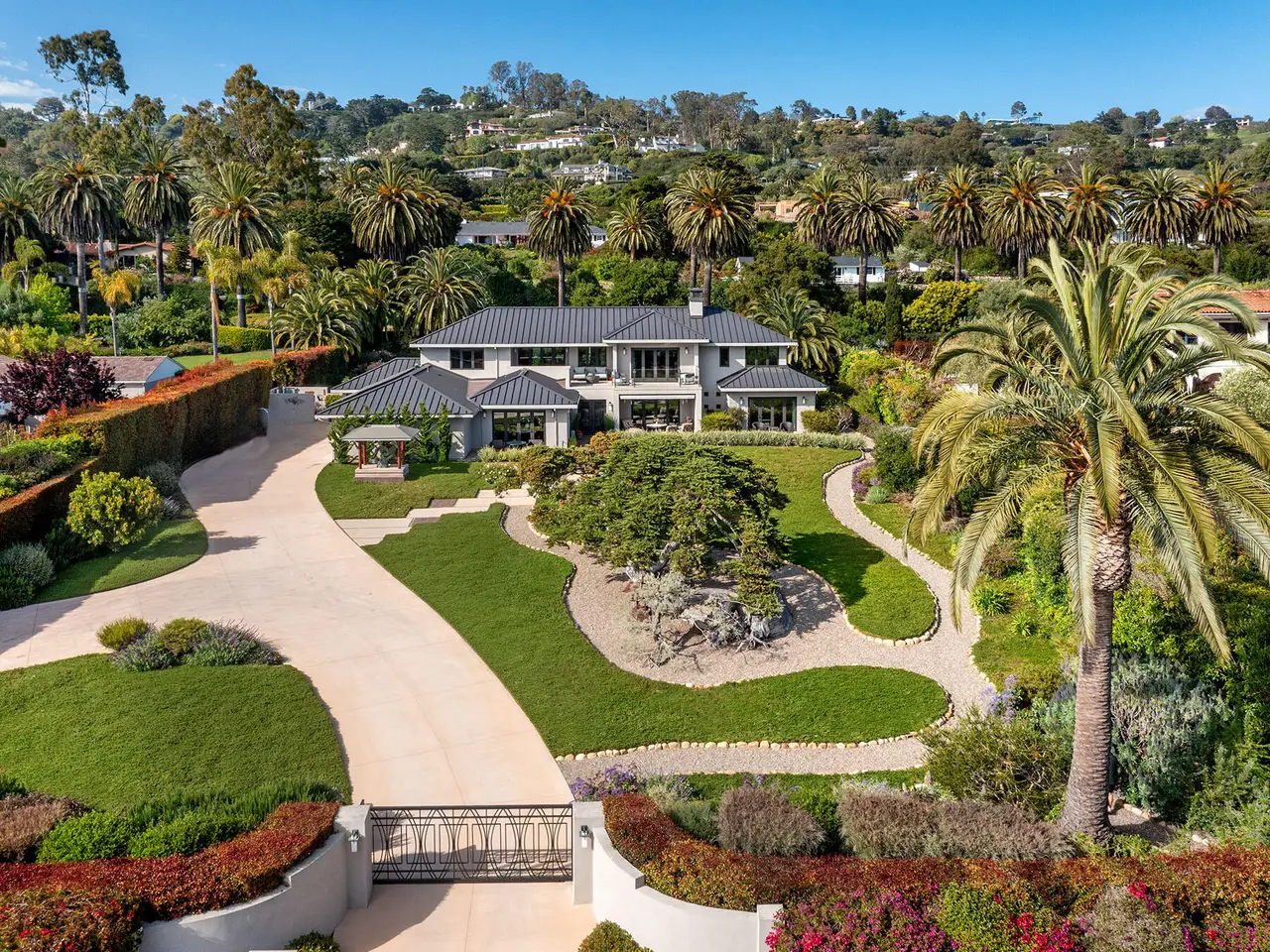 Sophisticated contemporary located on one of the premier streets in Hope Ranch. Gated drive winds past a magnificent Cypress tree which is the centerpiece of the manicured yard. A thorough remodel and impeccable maintenance by the owners presents a no apology home. The five bedrooms (four ensuite) and open concept floor plan allows for many lifestyle options. Rear yard area features a striking architectural fountain, large entertaining patio and elevated putting green. Three bedrooms downstairs are ideal for guests, family or office plus family room. Upstairs is reached either by a beautiful floating staircase or glass elevator. The primary bedroom suite is here with a large sunny ocean view sitting room plus wet bar and fourth ensuite bedroom. Amenities too numerous to mention; come see for yourself!