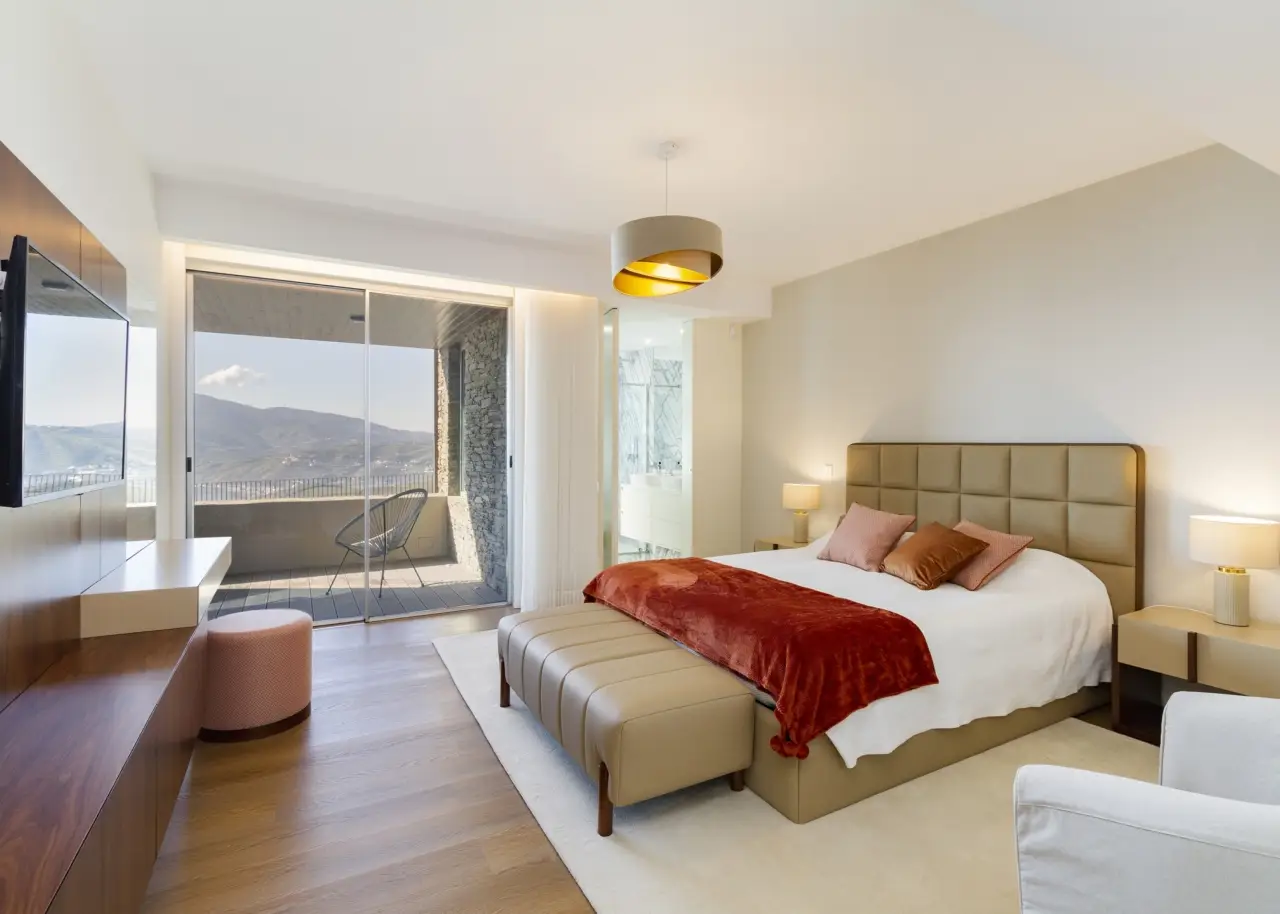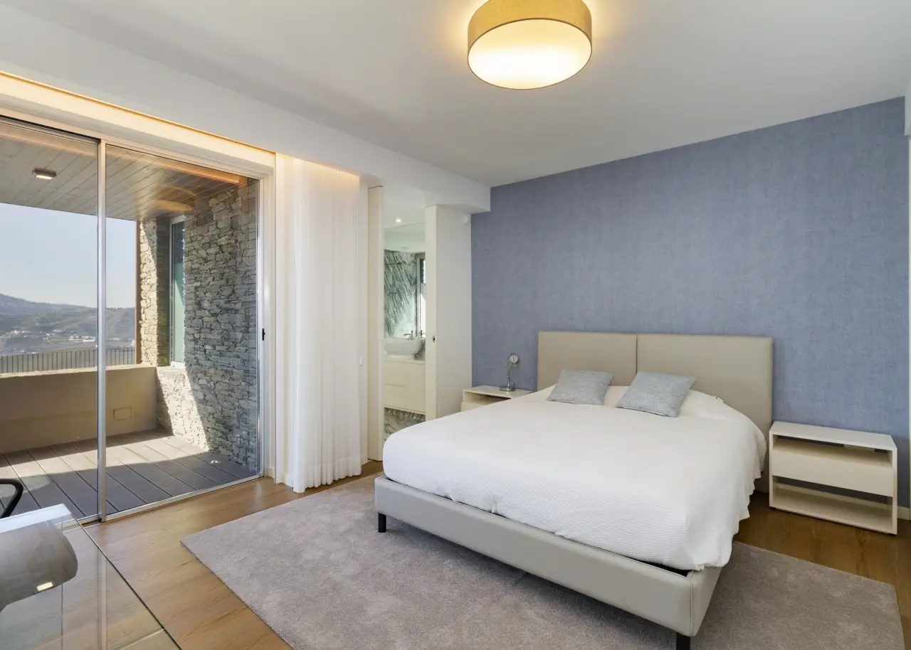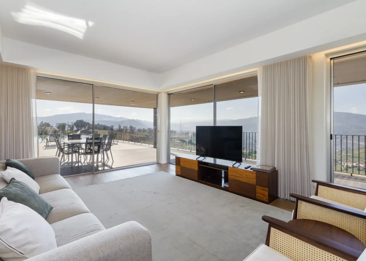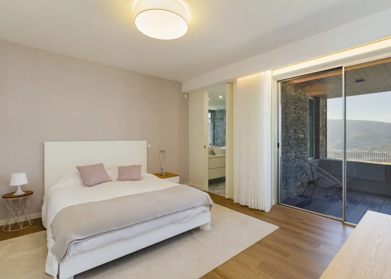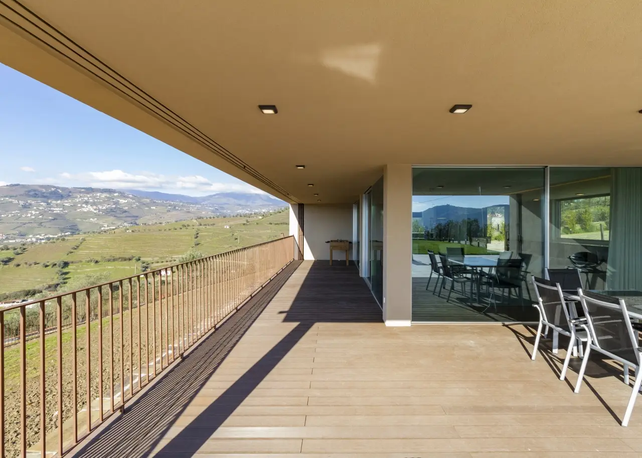 A stunning farm in the Douro Demarcated Region, in Santa Marta de Penaguião. It combines contemporary architecture with elements typical of the Douro region, such as schist exterior walls, iron railings, and Portuguese pavement at the house's entrances. It is located in a safe and quiet neighborhood and offers a unique panoramic view of the Douro Valley's majesty, including the river, vineyards, and mountains. The rooms are spacious, and the luxury finishes are in keeping with an elegant decoration and perfectly framed in a rural space with neutral tones, forming a balanced and cozy space with elements that combine the simplicity of contemporary architectural elegance, framed in the Douro wine estates' tradition. The living room on the ground level is filled with natural light thanks to huge windows and balconies that enhance the passage of light and frame the Douro landscape. The living room is connected to a modern kitchen, which is completely outfitted with Bosch appliances, creating a wide and functional space of more than 80 m2. To support the pool, the ground floor also includes a changing room with direct access to the outside and a laundry. On the bottom floor, four bedrooms, all en-suite, are designed with simple lines to create an intimate and quiet ambiance while respecting the slope of the vineyard terraces. The bedrooms feature built-in wardrobes and exquisite marble baths with natural light. The master suite also has a walk-in closet. Every accommodation has a balcony with views of the vineyard or the Douro River. The exterior offers a sequence of experiences provided by the various leisure areas, such as the eating area, the infinity salt pool, the balcony, the garden, and the vineyard, in a noise-free setting. The exterior features various fruit trees, archpriests, and an olive grove that produces olive oil. The property has a small agricultural support home with a bathroom. A home automation system, multiple surveillance cameras, an alarm, a water hole, and a swimming pool with a heat pump and electric cover are all included. Parking for ten automobiles. Excellent access, 1.5 kilometers from the A24 motorway. Régua is 2 kilometers away, while Porto is an hour away. CHARACTERISTICS: Plot Area: 15 258 m2 | 164 236 sq ft Deployment Area: 267 m2 | 2 874 sq ft Building Area: 375 m2 | 4 036 sq ft Bedrooms: 4 Bathrooms: 6 Garage: 10 Energy efficiency: B