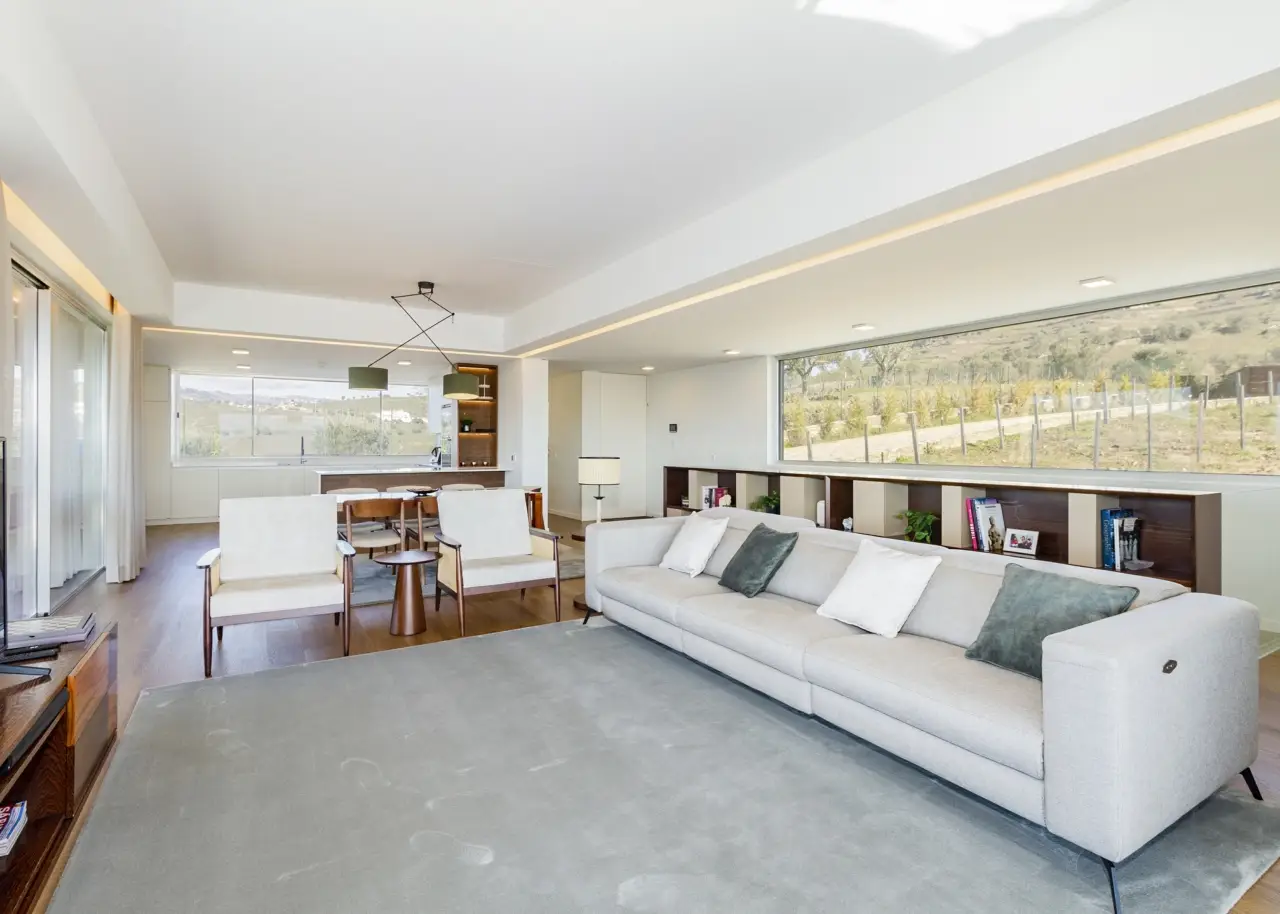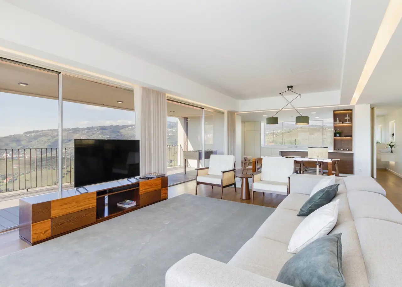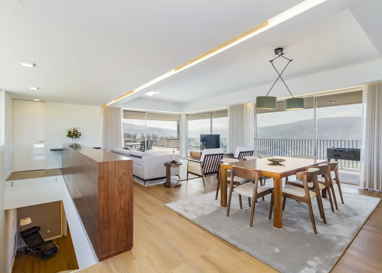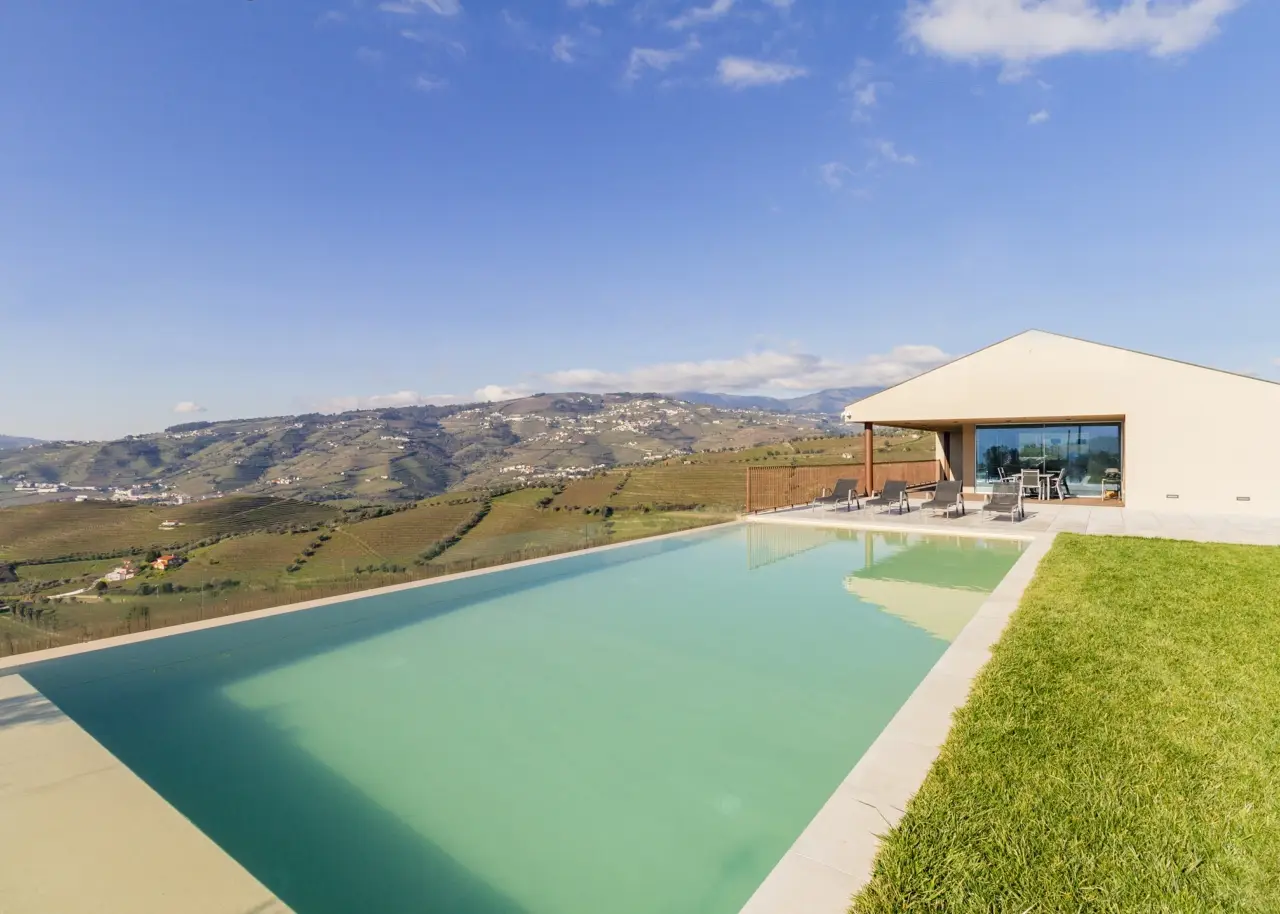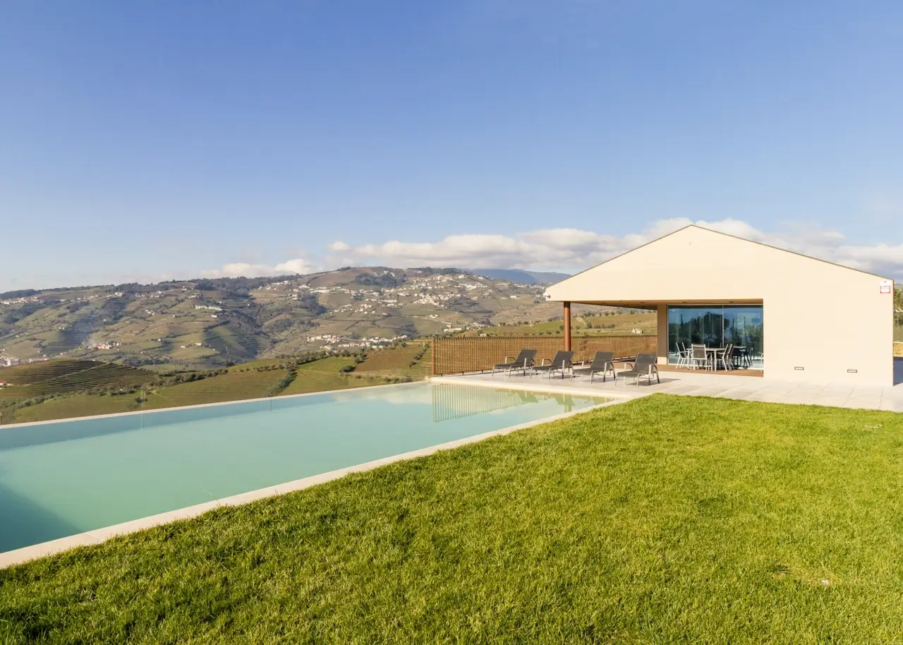 A stunning farm in the Douro Demarcated Region, in Santa Marta de Penaguião. It combines contemporary architecture with elements typical of the Douro region, such as schist exterior walls, iron railings, and Portuguese pavement at the house's entrances. It is located in a safe and quiet neighborhood and offers a unique panoramic view of the Douro Valley's majesty, including the river, vineyards, and mountains. The rooms are spacious, and the luxury finishes are in keeping with an elegant decoration and perfectly framed in a rural space with neutral tones, forming a balanced and cozy space with elements that combine the simplicity of contemporary architectural elegance, framed in the Douro wine estates' tradition. The living room on the ground level is filled with natural light thanks to huge windows and balconies that enhance the passage of light and frame the Douro landscape. The living room is connected to a modern kitchen, which is completely outfitted with Bosch appliances, creating a wide and functional space of more than 80 m2. To support the pool, the ground floor also includes a changing room with direct access to the outside and a laundry. On the bottom floor, four bedrooms, all en-suite, are designed with simple lines to create an intimate and quiet ambiance while respecting the slope of the vineyard terraces. The bedrooms feature built-in wardrobes and exquisite marble baths with natural light. The master suite also has a walk-in closet. Every accommodation has a balcony with views of the vineyard or the Douro River. The exterior offers a sequence of experiences provided by the various leisure areas, such as the eating area, the infinity salt pool, the balcony, the garden, and the vineyard, in a noise-free setting. The exterior features various fruit trees, archpriests, and an olive grove that produces olive oil. The property has a small agricultural support home with a bathroom. A home automation system, multiple surveillance cameras, an alarm, a water hole, and a swimming pool with a heat pump and electric cover are all included. Parking for ten automobiles. Excellent access, 1.5 kilometers from the A24 motorway. Régua is 2 kilometers away, while Porto is an hour away. CHARACTERISTICS: Plot Area: 15 258 m2 | 164 236 sq ft Deployment Area: 267 m2 | 2 874 sq ft Building Area: 375 m2 | 4 036 sq ft Bedrooms: 4 Bathrooms: 6 Garage: 10 Energy efficiency: B