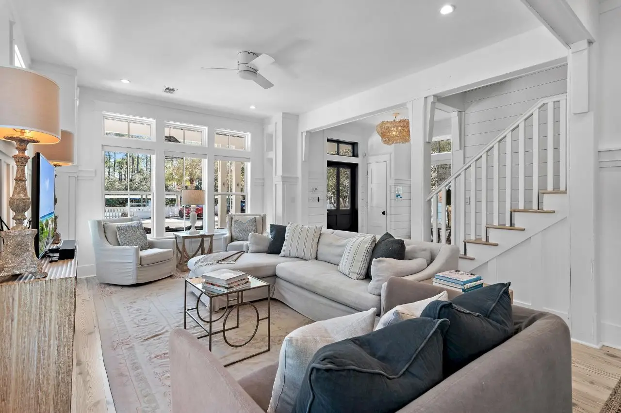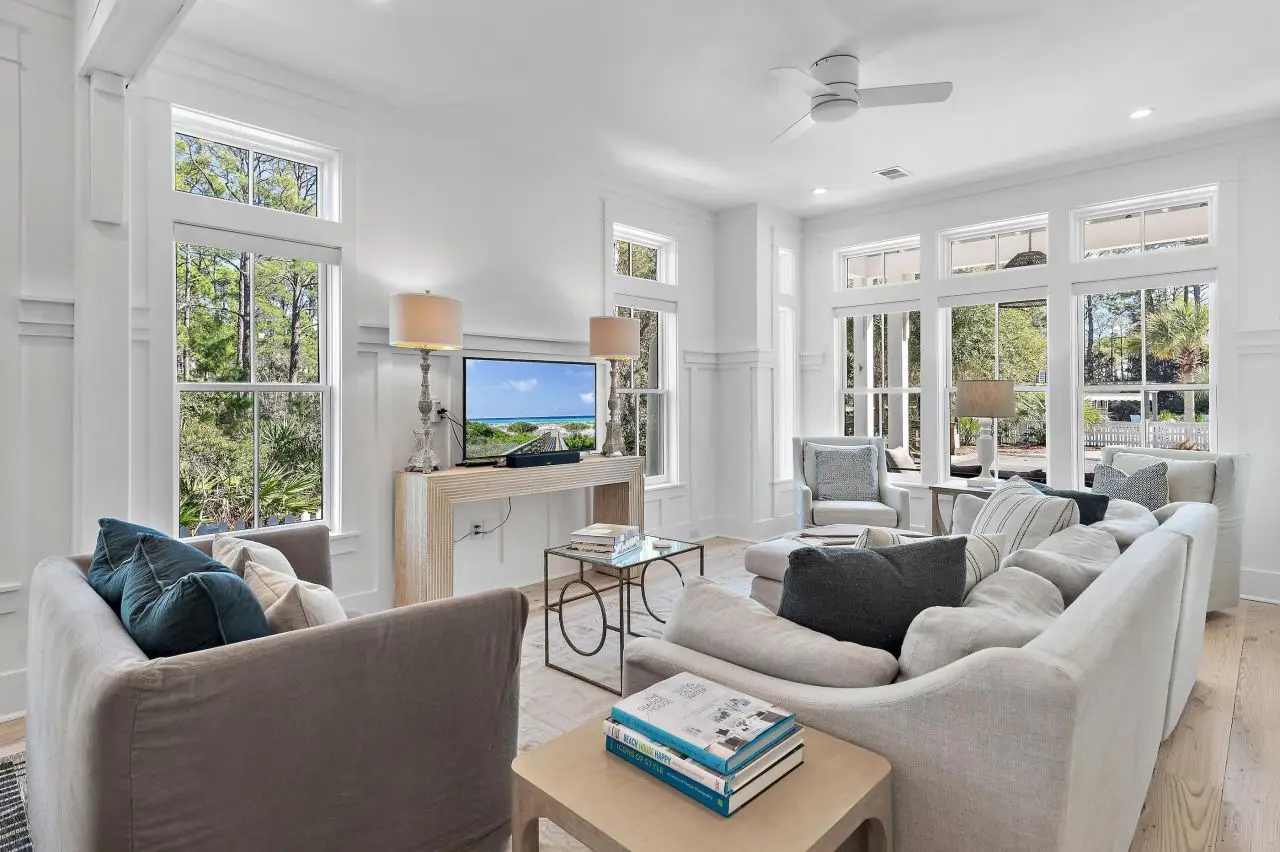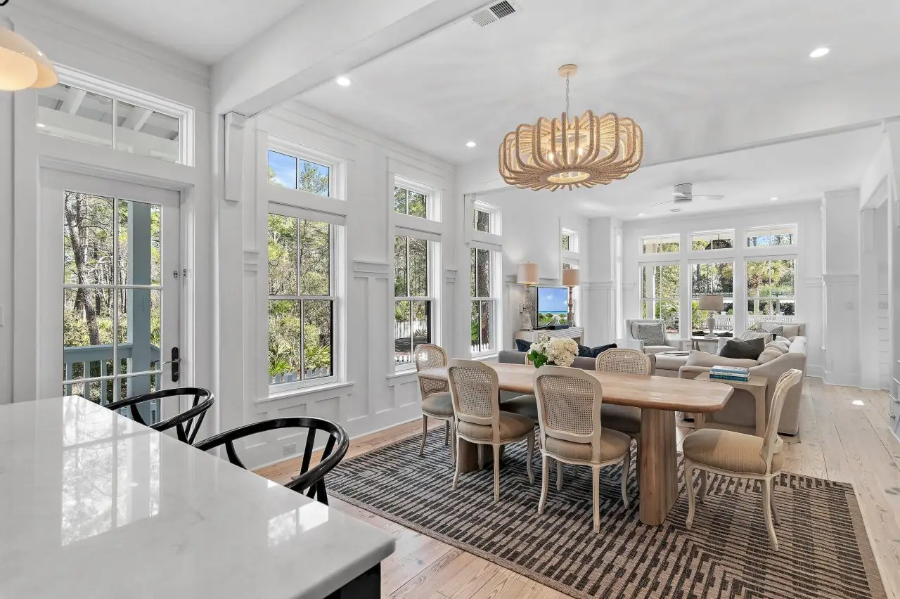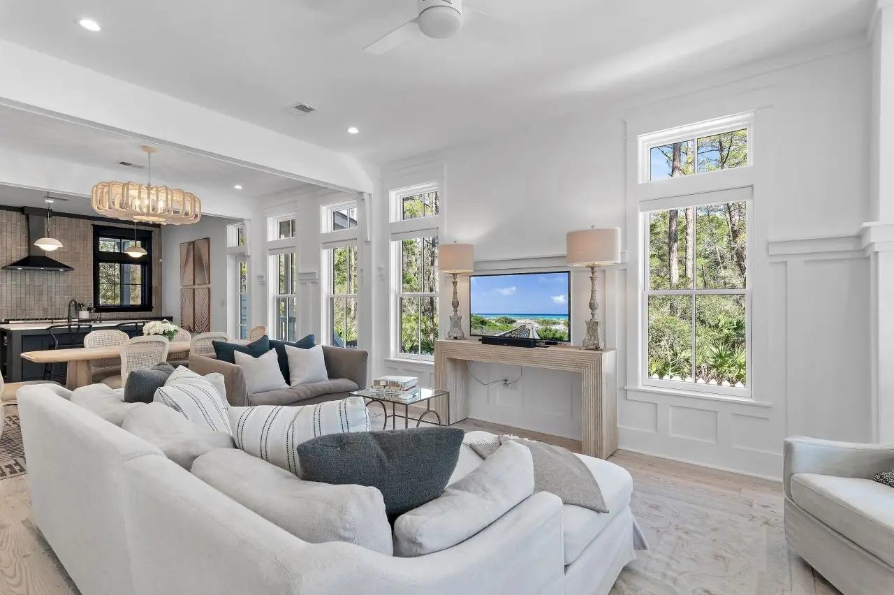 Discover the perfect blend of luxury and coastal living at this stunning home in the sought-after Watersound West Beach community. Nestled along the serene border of Deer Lake State Park, this residence offers a peaceful backdrop of natural beauty adjacent to scenic walking trails leading to the beach. Just steps from the community pool and the beach boardwalk, enjoy effortless access to sugar-white sands and the turquoise waters of the Gulf with no crowds! The open-concept design features spacious living areas, ideal for entertaining or relaxing after a day at the beach. Custom features include true wide planked hardwood flooring, luxury appliances, hand-selected fixtures, as well as extensive wainscoting and wood trim work throughout. Offered fully furnished, this well thought out floor plan showcases an open concept living space on the main level with expansive state park views, a spacious master suite, 2 guest bedrooms suites, a private bunk room plus another bunk space tucked under the stairs, and a third floor den with gulf views that can double as a 4th bedroom. Plenty of storage can be found throughout the home and there is a home office on the main level. High-end luxury finishes, generous porches, and serene outdoor spaces make this home an inviting coastal retreat. With exclusive access to Watersound West Beach amenities, including heated & cooled community pool, multiple parks, trails and boardwalks, manned security gate, fitness center, and private boardwalk to the BEACH with bike parking, this home offers the ultimate 30A lifestyle. Home is located on the most exclusive lot in the neighborhood, so don't miss your chance to own this piece of paradise perfectly positioned in a serene natural setting yet convenient to all 30A has to offer!