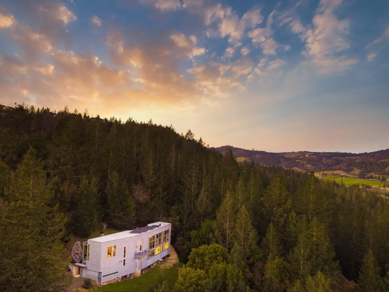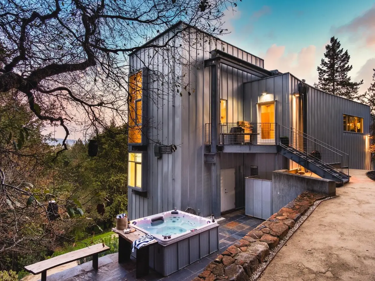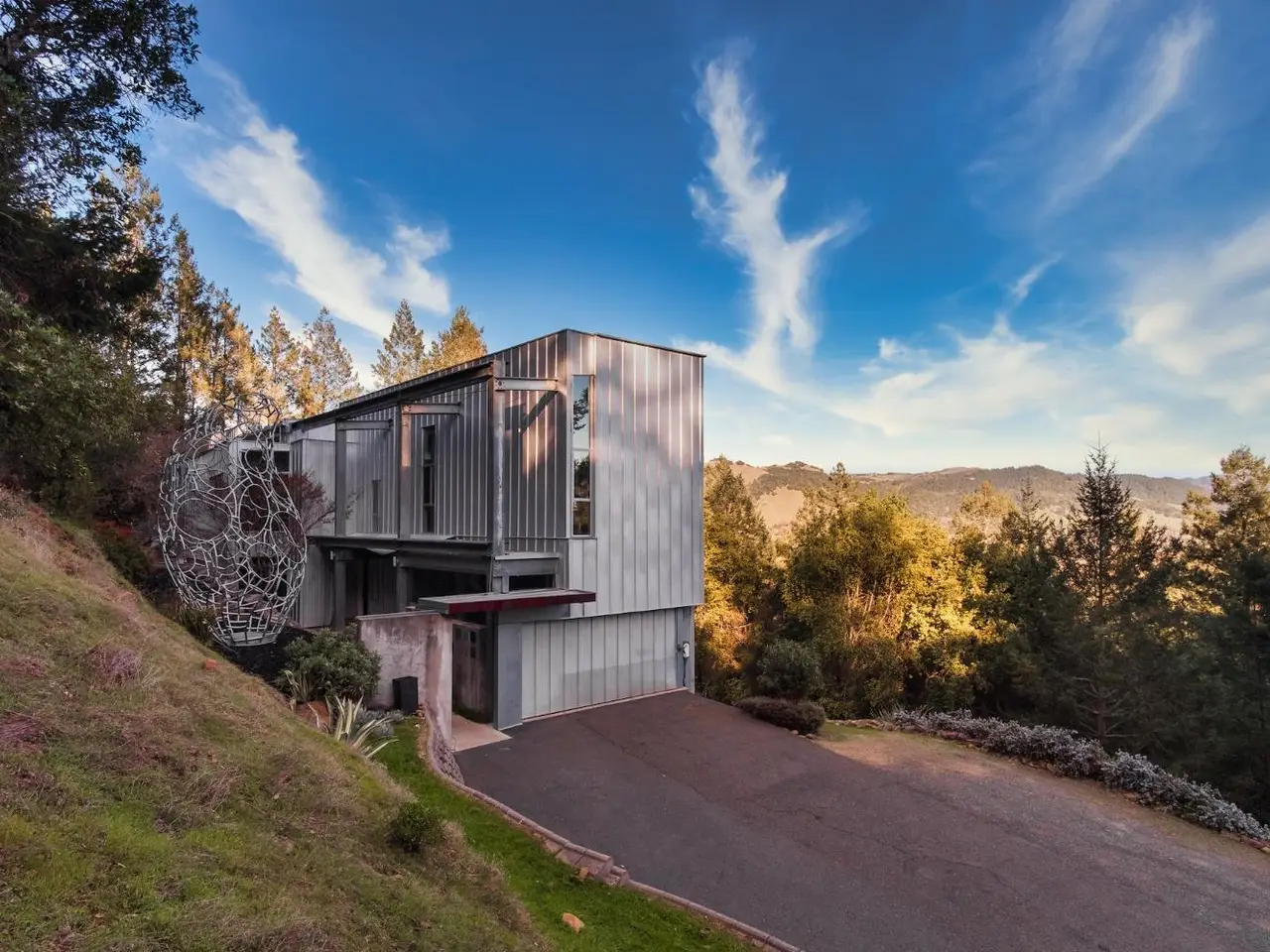 Tucked on 4.3 private acres in Santa Rosa's Woodside Hills, this award-winning contemporary home by Sander Architects stuns with sculptural architecture and panoramic views of the Valley of the Moon. Honored with the AIA/LA Merit Award, the 4 Bedroom/4 Bathroom residence blends metal, wood, and glass into an artful wine country retreat designed for unforgettable entertaining. Enter a soaring, gallery-like foyer with a 22-ft torqued steel wall and floating staircase. Upstairs, a dramatic great room with bamboo floors, exposed steel beams, a 12-ft drop-down movie screen, and French doors to a terrace that feels like your own private overlook. The sleek chef's kitchen features a 6-burner gas cooktop, prep sink, pantry, and direct access to the outdoor chef's deck. The luxe primary suite includes vaulted ceilings, walk-in closet, and a designer shower. Flex spaces includes an office, a gym, and an art studio or possible guest suite. With city services, solar (8kW), elevator, EV charger, landscaping, and proximity to Healdsburg, STS Airport, and world-class dining including French Laundry and SingleThread - this home is ideal as a full-time residence or lock-and-leave getaway. Featured in Dwell, Travel Channel's Amazing Vacation Homes. www.5767trailwood.com