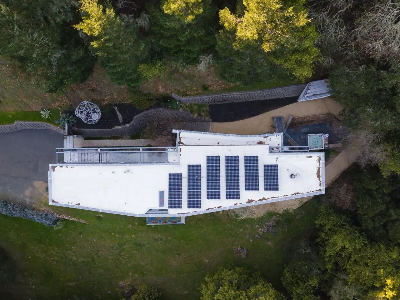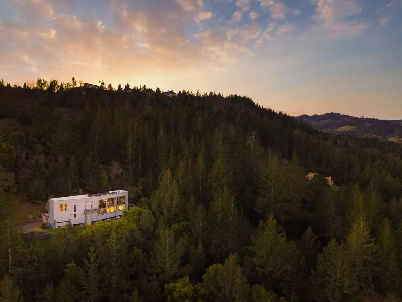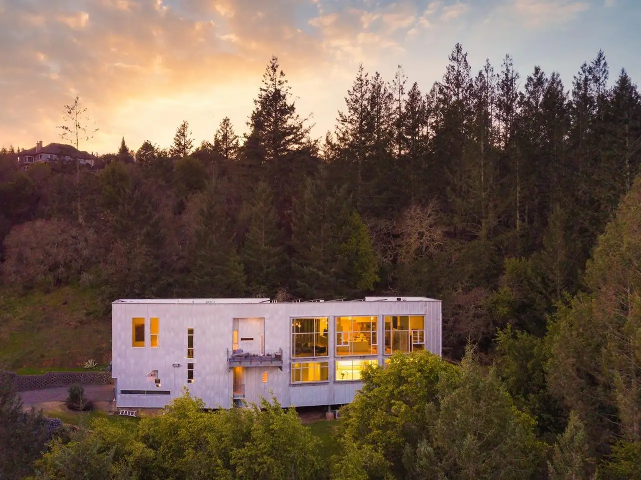 Tucked on 4.3 private acres in Santa Rosa's Woodside Hills, this award-winning contemporary home by Sander Architects stuns with sculptural architecture and panoramic views of the Valley of the Moon. Honored with the AIA/LA Merit Award, the 4 Bedroom/4 Bathroom residence blends metal, wood, and glass into an artful wine country retreat designed for unforgettable entertaining. Enter a soaring, gallery-like foyer with a 22-ft torqued steel wall and floating staircase. Upstairs, a dramatic great room with bamboo floors, exposed steel beams, a 12-ft drop-down movie screen, and French doors to a terrace that feels like your own private overlook. The sleek chef's kitchen features a 6-burner gas cooktop, prep sink, pantry, and direct access to the outdoor chef's deck. The luxe primary suite includes vaulted ceilings, walk-in closet, and a designer shower. Flex spaces includes an office, a gym, and an art studio or possible guest suite. With city services, solar (8kW), elevator, EV charger, landscaping, and proximity to Healdsburg, STS Airport, and world-class dining including French Laundry and SingleThread - this home is ideal as a full-time residence or lock-and-leave getaway. Featured in Dwell, Travel Channel's Amazing Vacation Homes. www.5767trailwood.com