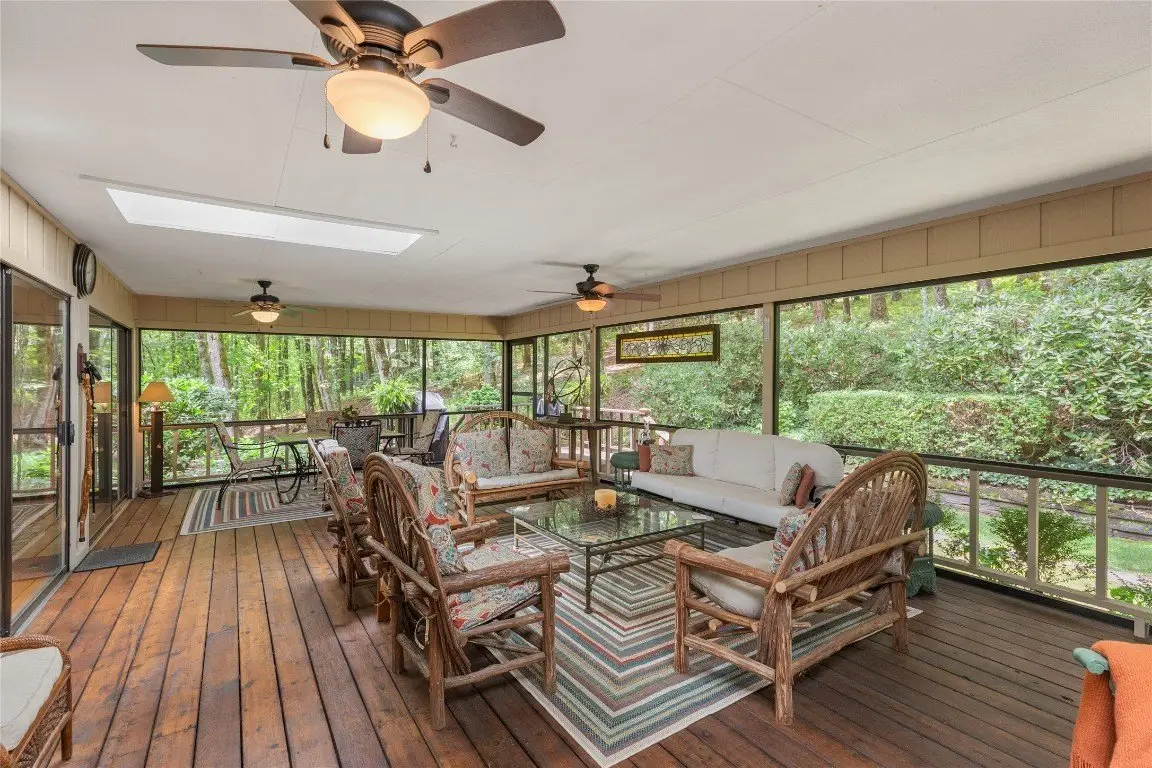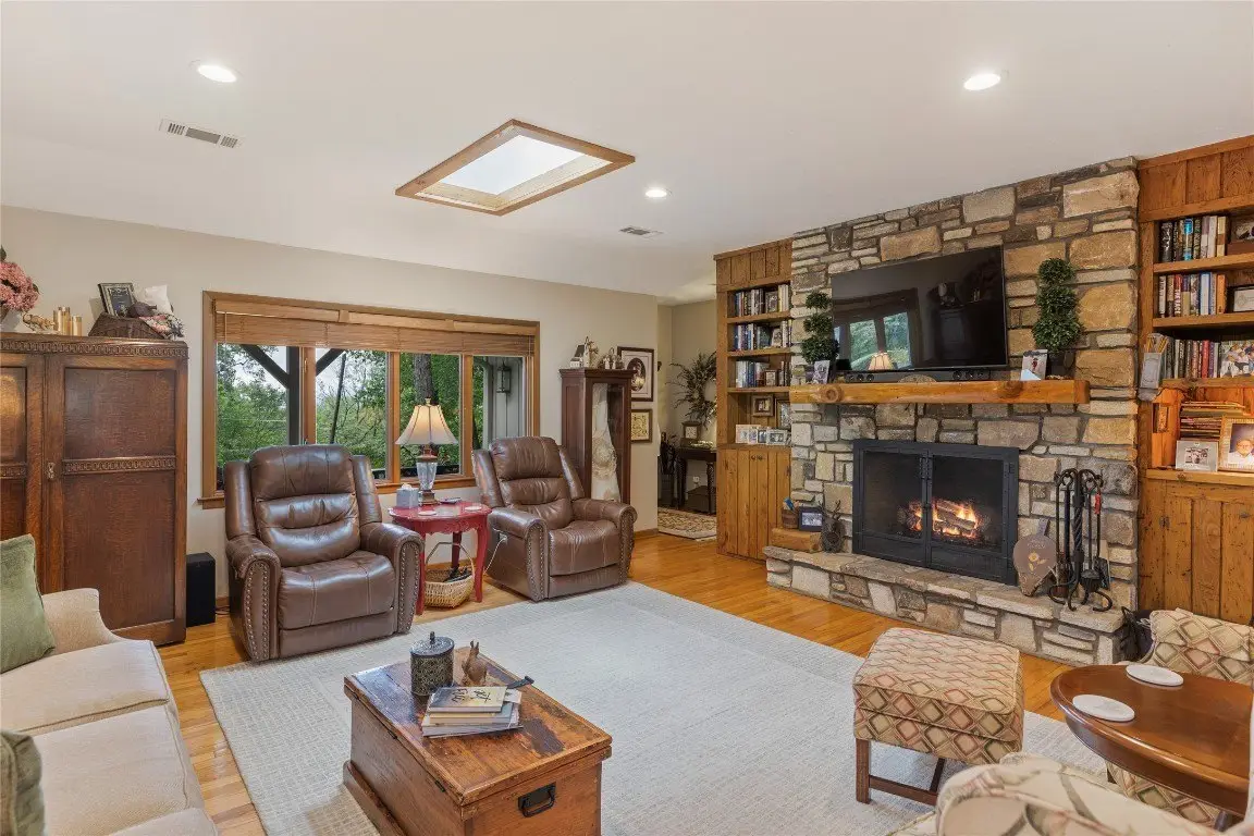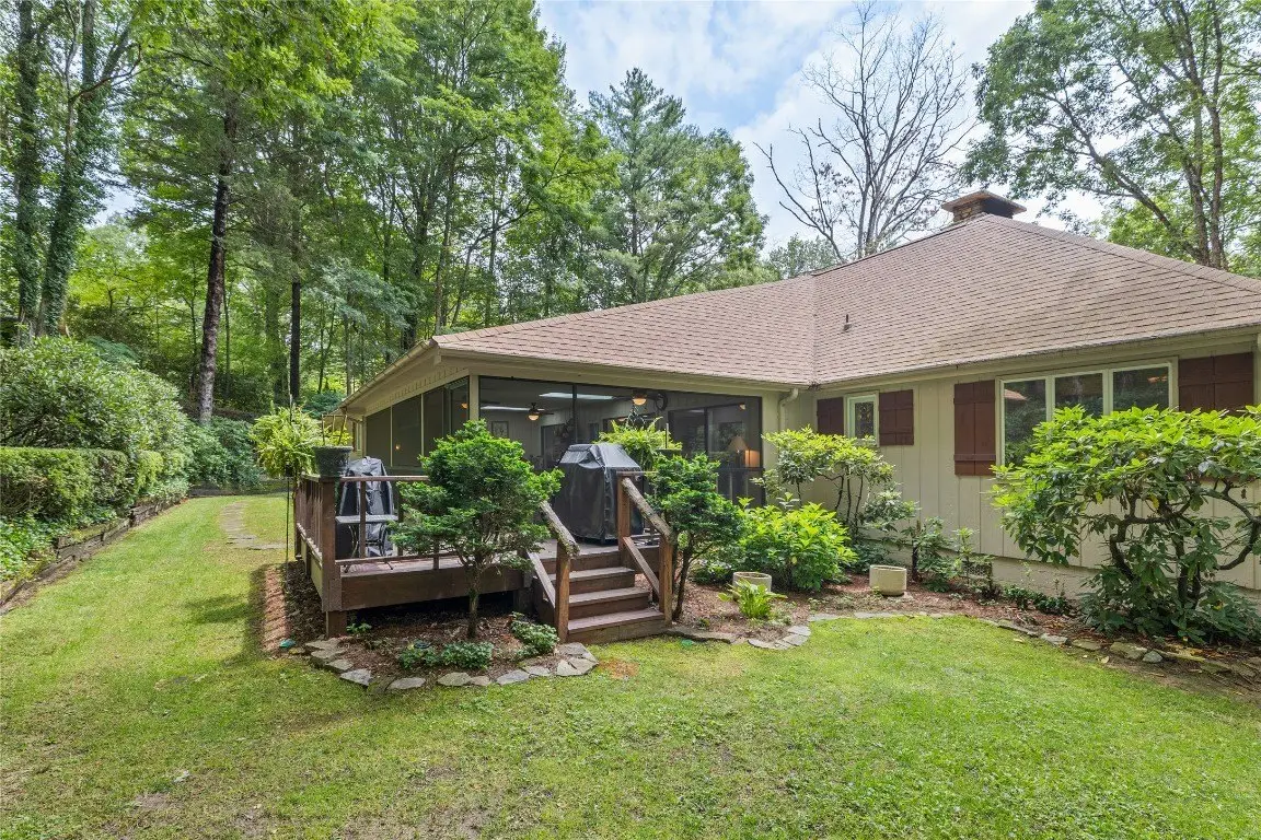 Located in the desirable Round Hill Estates community, this classic single-level home offers generous living spaces, timeless finishes, and a welcoming layout ideal for year-round or seasonal living. Set on a gentle, double lot with lush landscaping and a large grassy area, the nearly flat property is perfect for enjoying the outdoors, with a beautiful stone firepit, shaded gathering spots, and peek-a-boo mountain views from the covered front porch. Inside, rich wood flooring and skylights create a warm, airy atmosphere. The spacious living room features a striking stacked-stone fireplace and flows seamlessly into the dining area and a bright, updated kitchen, designed for easy entertaining and daily comfort. A large screened porch off the main living area extends the indoor-outdoor lifestyle. The well-planned layout includes a den or office just off the living room, two oversized guest bedrooms, and a spacious primary suite. An oversized two-car garage includes a workshop area, a spacious walk-in basement offers additional room for storage and activities, while the driveway offers ample space for parking and turnaround. The home was extensively refreshed over the past 3 years, including the new kitchen, new appliances, 2 new water heaters, new baths, new roof, wiring for a generator and more. Enjoy a convenient location near the Country Club of Sapphire Valley. Residents of Round Hill Estates have the option to enjoy year-round Sapphire Valley Resort amenities, including heated pools, tennis courts, pickleball courts, a fitness center, a dog park, mini-golf facilities, a nine-hole golf course, and Fairfield Lake for swimming and boating. Winter fun abounds with skiing, snow tubing, and snowboarding. Just minutes from Cashiers’ charming shops and dining, Sapphire offers the perfect blend of adventure, leisure, and convenience. Surrounded by friendly neighbors and set in a peaceful, established neighborhood, this charming home offers comfort, convenience, and classic mountain living.