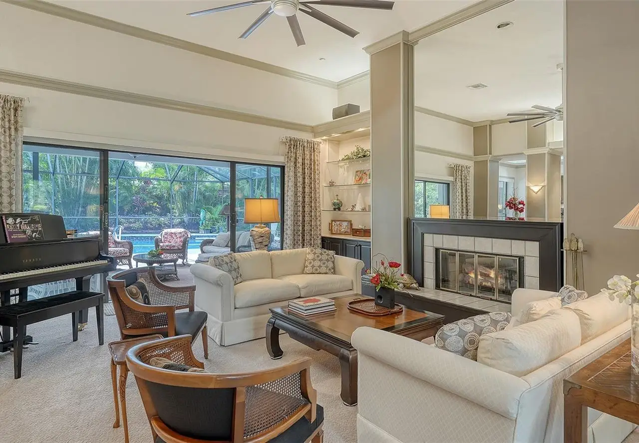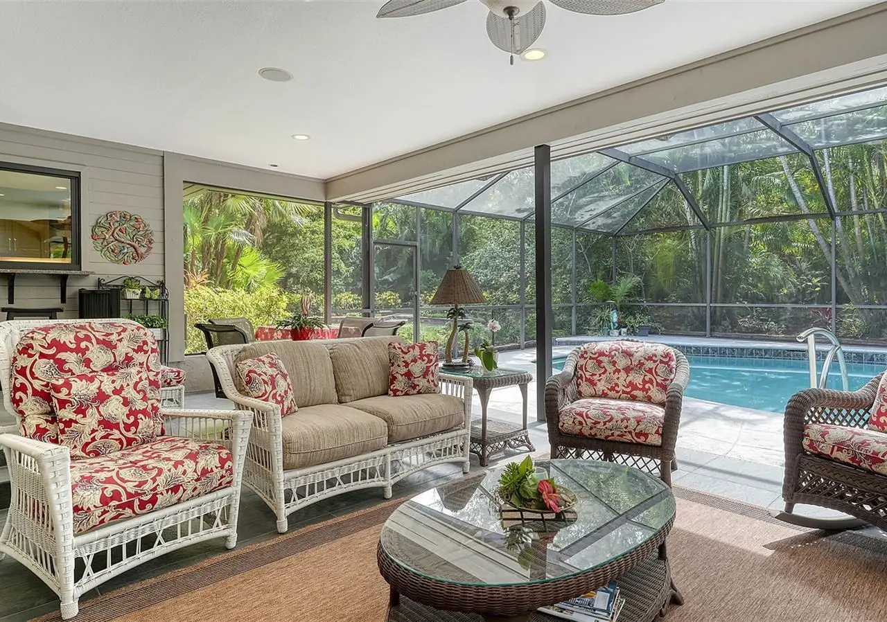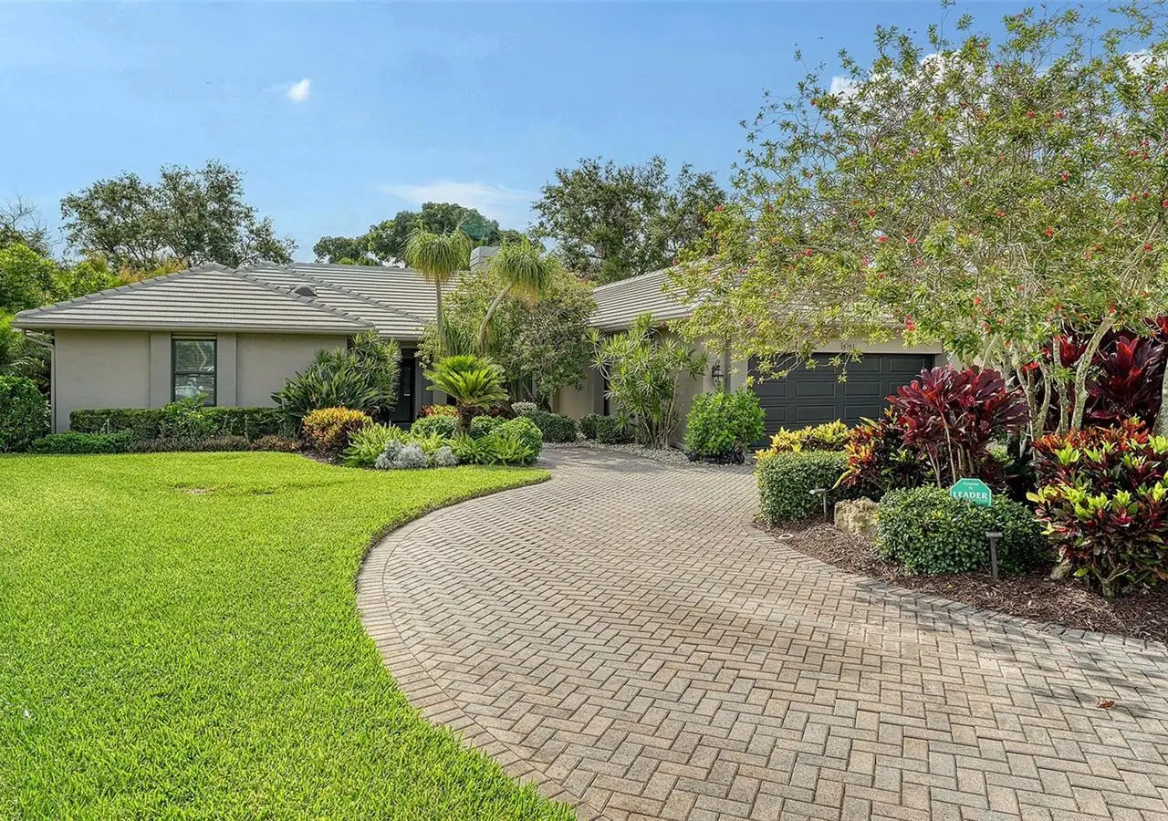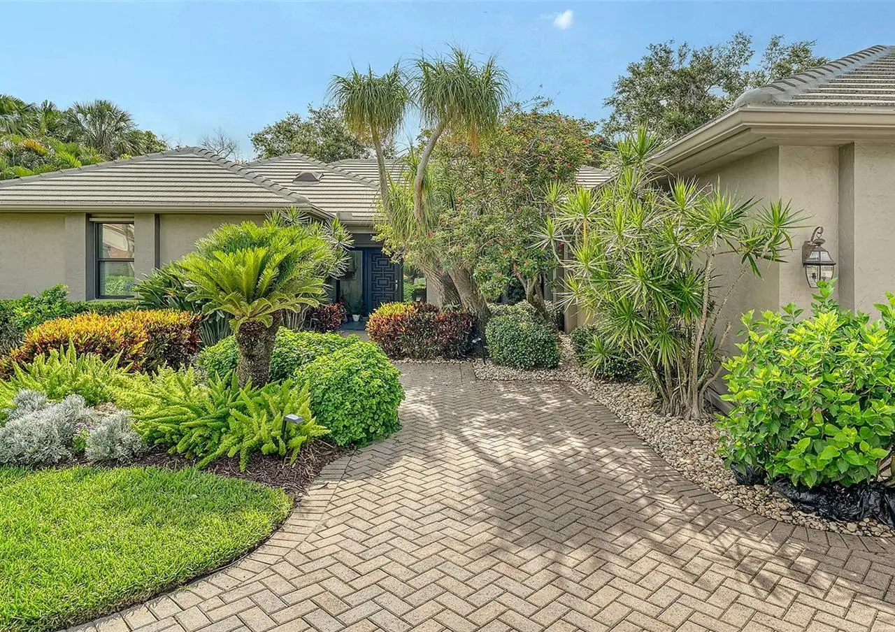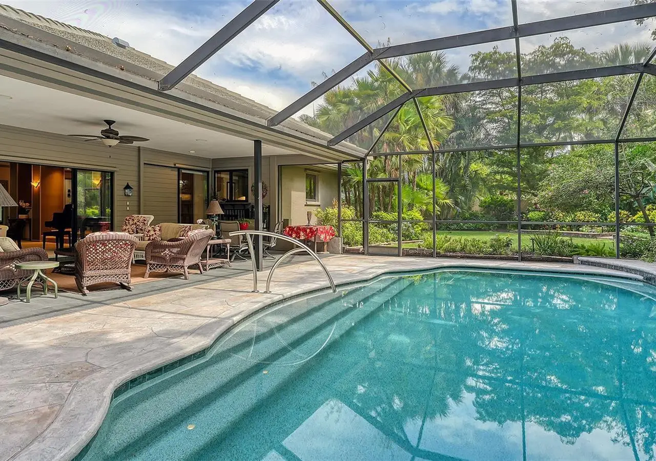 Located in Sarasota’s coveted and 24-hour guard-gated West of Trail community, The Landings, this beautifully reimagined 3-bedroom, 3-bath residence with a bonus room offers refined coastal living and peace of mind through extensive, high-quality updates. Situated on a lushly landscaped lot with mature trees and privacy and not in a flood zone, this 2,921 sf home blends timeless architecture with thoughtful modern improvements, all just minutes from Siesta Key’s world-famous beaches and Downtown Sarasota. Hurricane-impact windows were added in 2023, and the newer roof and updated PVC plumbing offer structural integrity and long-term value. Design upgrades include porcelain tile flooring and beautiful custom wood cabinetry and built-ins. The fully updated kitchen features premium stainless appliances, Silestone counters, stylish cabinetry, a picture frame window overlooking the beautiful garden, a convenient pass thru window to the lanai, and custom walk-in pantry. The adjacent dining room is perfect for entertaining and the formal living room with its high ceiling is anchored by a woodburning fireplace with tiled hearth and built-ins. The split-bedroom floor plan offers privacy and functionality, with all 3 bedrooms, (one currently outfitted as a convenient home office with solid wood built-ins) boasting custom walk-in closets and lovely bathrooms. A spacious bonus room is light and bright and includes a redesigned alcove with floor-to-ceiling custom built-ins to house books, media, or art. Every inch of this home reflects quality, style, and enduring craftsmanship. The interior of the home flows seamlessly to the elegant and serene exterior where you will enjoy the professionally redesigned landscape with exquisite plantings, brick paver driveway, meandering walking path, elevated relaxation area, peaceful fountain, and custom exterior lighting. The spectacular pool area underwent a major renovation in 2020 which included resurfacing with Pebble Tec (lifetime warranty), installation of a new heater and pump, and the addition of a stylish new Italian tile surround. The lanai was rescreened in 2023 and the deck was upgraded with a high-performance Pro Tech surface for durability and beauty. Located behind the gates of The Landings, residents enjoy tree-canopied streets, a nature trail leading to Roberts Bay, and optional membership to the Landings Racquet Club, offering tennis, pickleball, a heated pool, fitness center, and clubhouse. With proximity to A-rated schools, Southside Village, Sarasota Memorial Hospital, and the cultural amenities of downtown Sarasota, this property is a rare opportunity to own a truly move-in-ready home in one of Sarasota’s most sought-after communities
