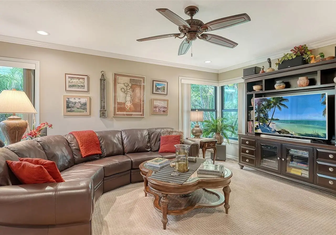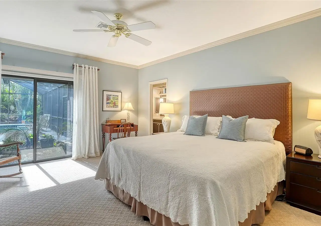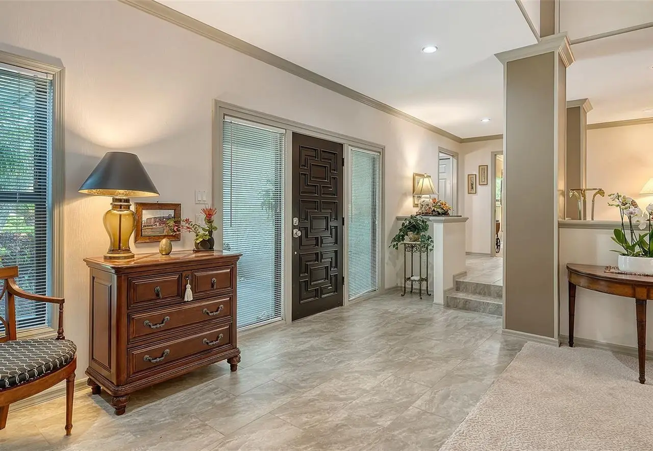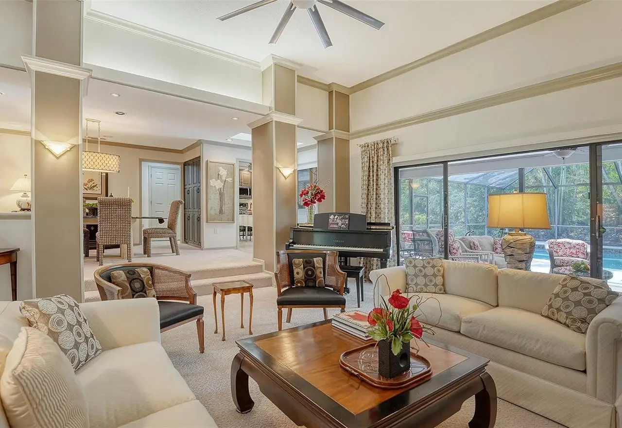 Located in Sarasota’s coveted and 24-hour guard-gated West of Trail community, The Landings, this beautifully reimagined 3-bedroom, 3-bath residence with a bonus room offers refined coastal living and peace of mind through extensive, high-quality updates. Situated on a lushly landscaped lot with mature trees and privacy and not in a flood zone, this 2,921 sf home blends timeless architecture with thoughtful modern improvements, all just minutes from Siesta Key’s world-famous beaches and Downtown Sarasota. Hurricane-impact windows were added in 2023, and the newer roof and updated PVC plumbing offer structural integrity and long-term value. Design upgrades include porcelain tile flooring and beautiful custom wood cabinetry and built-ins. The fully updated kitchen features premium stainless appliances, Silestone counters, stylish cabinetry, a picture frame window overlooking the beautiful garden, a convenient pass thru window to the lanai, and custom walk-in pantry. The adjacent dining room is perfect for entertaining and the formal living room with its high ceiling is anchored by a woodburning fireplace with tiled hearth and built-ins. The split-bedroom floor plan offers privacy and functionality, with all 3 bedrooms, (one currently outfitted as a convenient home office with solid wood built-ins) boasting custom walk-in closets and lovely bathrooms. A spacious bonus room is light and bright and includes a redesigned alcove with floor-to-ceiling custom built-ins to house books, media, or art. Every inch of this home reflects quality, style, and enduring craftsmanship. The interior of the home flows seamlessly to the elegant and serene exterior where you will enjoy the professionally redesigned landscape with exquisite plantings, brick paver driveway, meandering walking path, elevated relaxation area, peaceful fountain, and custom exterior lighting. The spectacular pool area underwent a major renovation in 2020 which included resurfacing with Pebble Tec (lifetime warranty), installation of a new heater and pump, and the addition of a stylish new Italian tile surround. The lanai was rescreened in 2023 and the deck was upgraded with a high-performance Pro Tech surface for durability and beauty. Located behind the gates of The Landings, residents enjoy tree-canopied streets, a nature trail leading to Roberts Bay, and optional membership to the Landings Racquet Club, offering tennis, pickleball, a heated pool, fitness center, and clubhouse. With proximity to A-rated schools, Southside Village, Sarasota Memorial Hospital, and the cultural amenities of downtown Sarasota, this property is a rare opportunity to own a truly move-in-ready home in one of Sarasota’s most sought-after communities