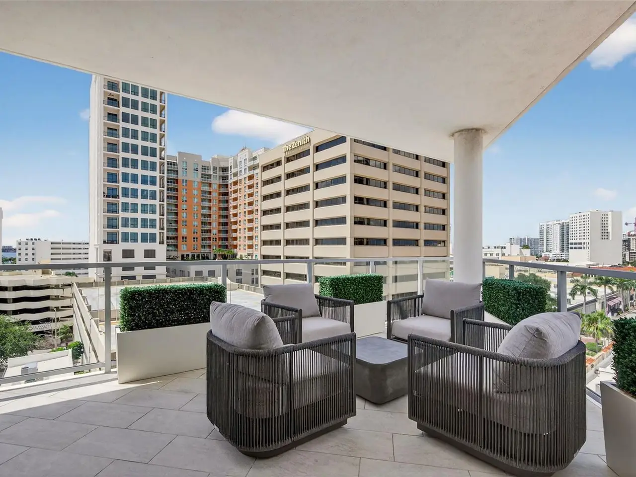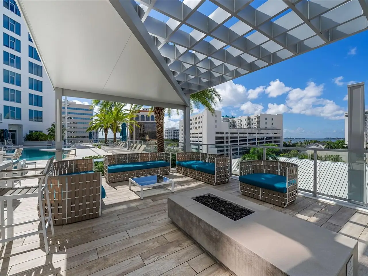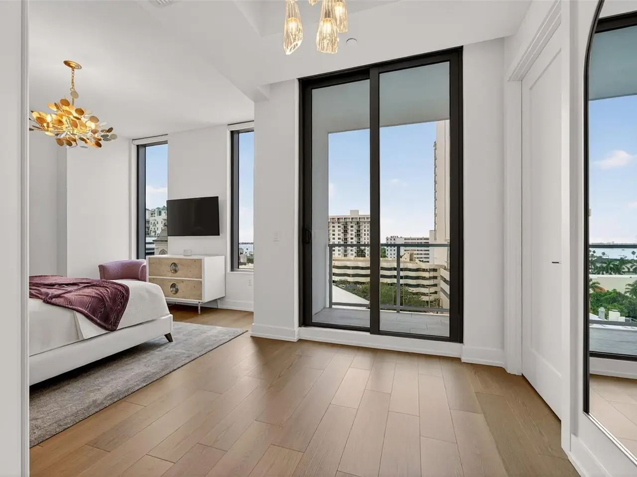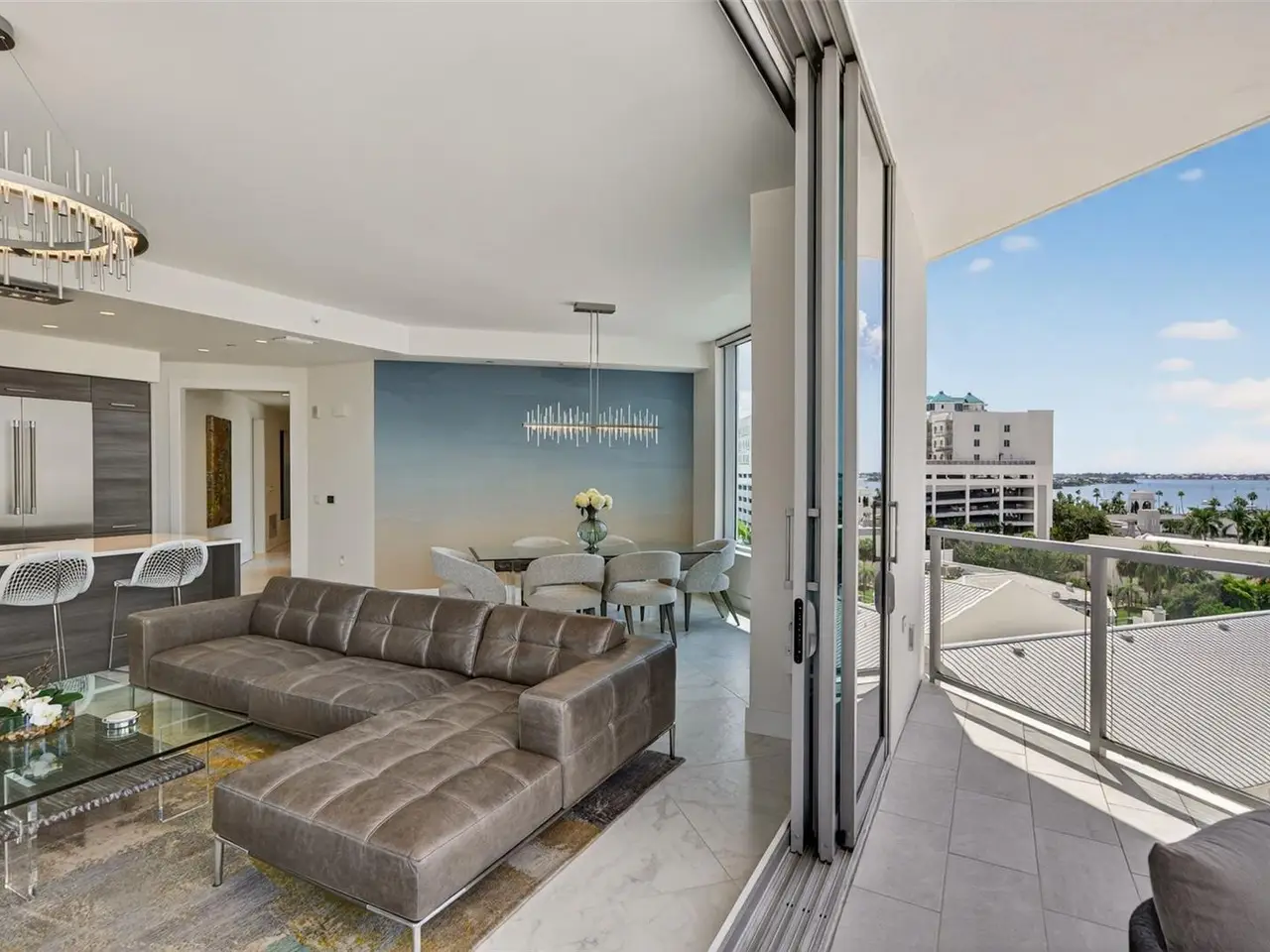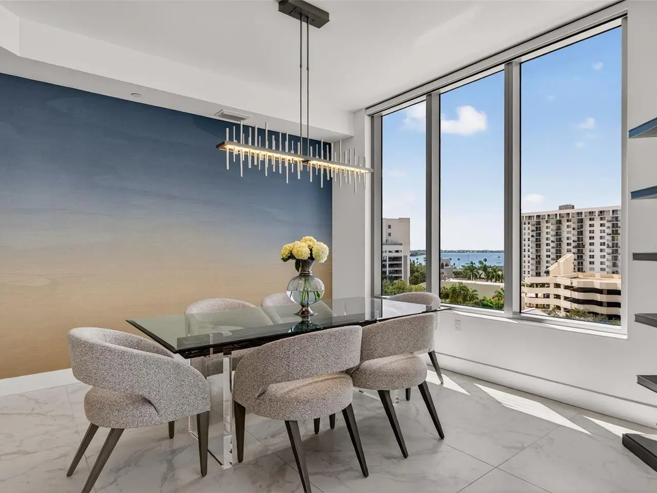 Design perfection at The Mark in this exquisitely designed and impeccably maintained three-bedroom residence with dramatic art gallery entrance. From the moment you step inside, walls of glass frame sweeping vistas of the sparkling city skyline and Sarasota Bay. The home features two private and spacious balconies inviting you to enjoy morning coffee or sunset cocktails. The open living, dining, and kitchen spaces are filled with natural light from full height sliding glass doors that open onto the terrace. Electronic window treatments add a refined touch, allowing you to balance privacy with soft daylight. The sophisticated den with custom shelving and its picturesque view creates the perfect home office or cozy reading nook. The primary suite is a peaceful sanctuary with its own private balcony, custom-designed closet, and spa-like bath featuring dual vanities, lighted mirrors, and a spacious frameless glass shower. Two additional en-suite bedrooms offer comfort and privacy for family and guests. Touches of sophisticated designer wall paper and custom lighting throughout the home. The chef’s kitchen is both stylish and functional, featuring Nolte Premium European cabinets, quartz countertops, Euro Dark/High Gloss soft-close doors, sliding shelves, subway tile backsplash, and Italian-honed porcelain floors. This home is like a brand-new residence with every detail perfectly executed. For convenience and peace of mind, the condo includes a temperature-controlled storage unit on the same floor as residence, two side-by-side gated parking spaces, and access to two electric vehicle charging stations. World class amenities include the 5th floor amenity deck sporting a 65-foot resort style heated saltwater pool and spa, lounge area, fire pit, outdoor grills, high tech fitness center, spin room and a club room with fire place, bar, billiards, catering kitchen and newsroom. The concierge service provides convenience and security. Experience the epitome of urban living in Sarasota. Indulge in the vibrant arts and culture scene, fine dining and upscale shopping, all within walking distance.
