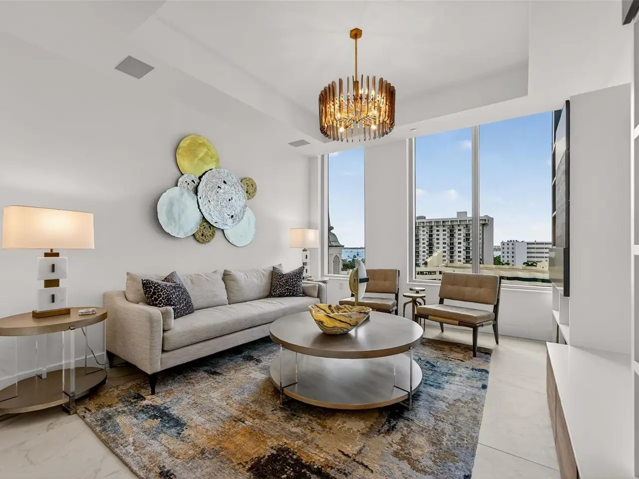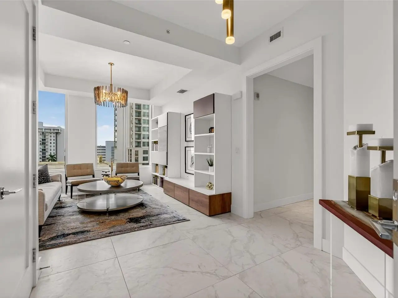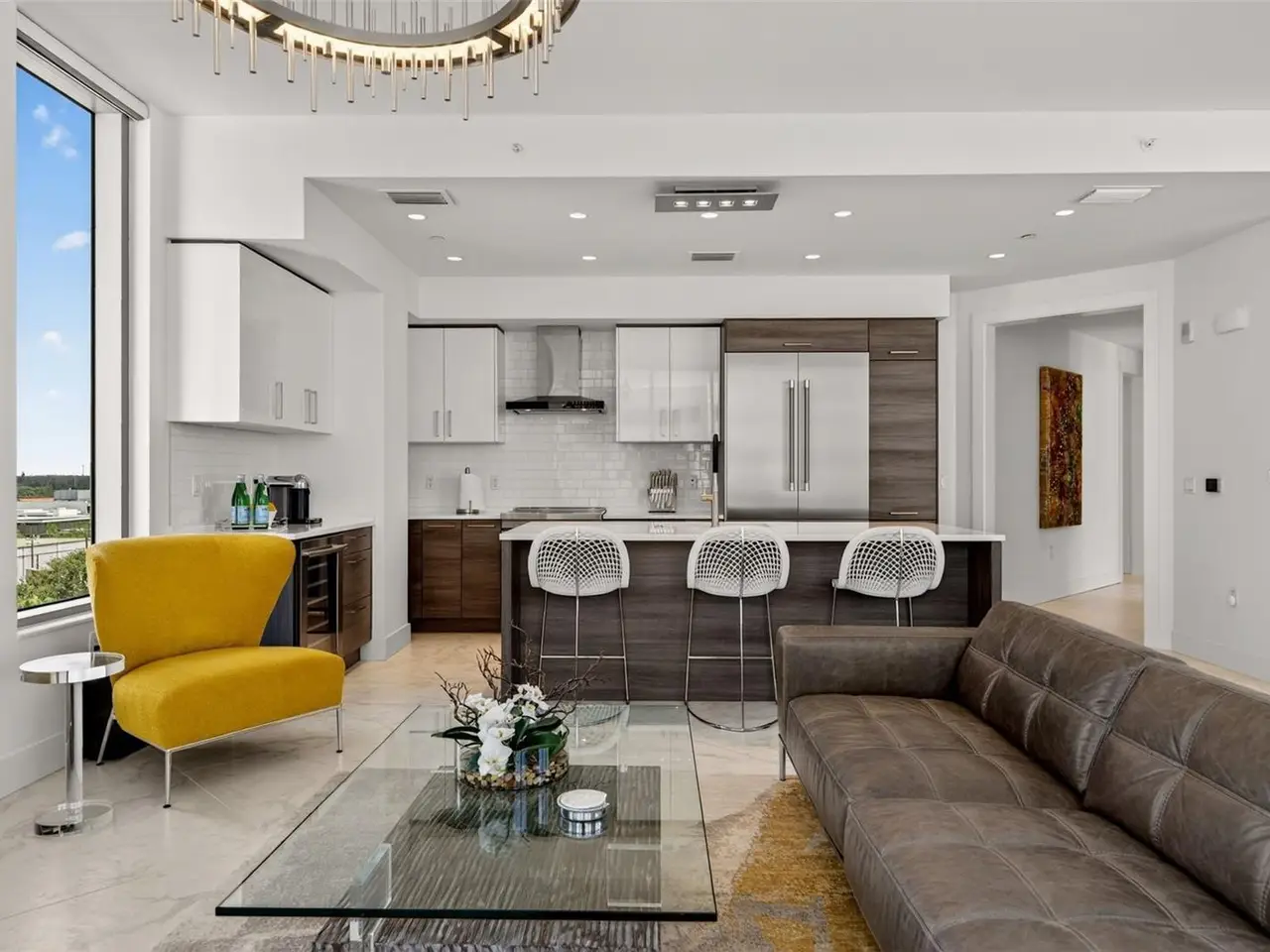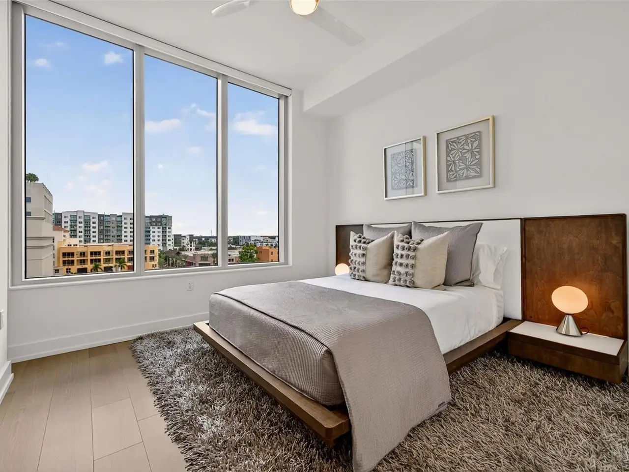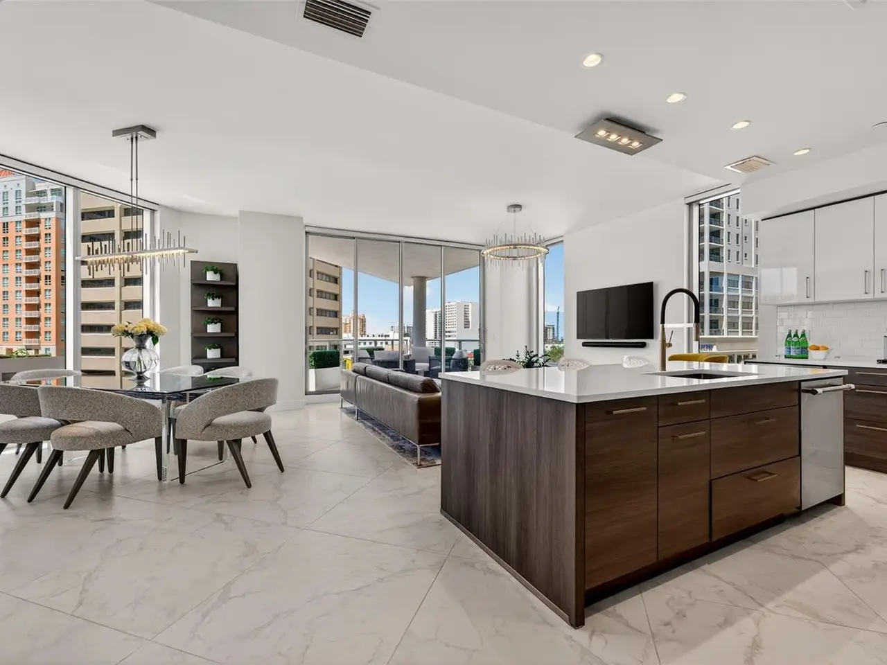 Design perfection at The Mark in this exquisitely designed and impeccably maintained three-bedroom residence with dramatic art gallery entrance. From the moment you step inside, walls of glass frame sweeping vistas of the sparkling city skyline and Sarasota Bay. The home features two private and spacious balconies inviting you to enjoy morning coffee or sunset cocktails. The open living, dining, and kitchen spaces are filled with natural light from full height sliding glass doors that open onto the terrace. Electronic window treatments add a refined touch, allowing you to balance privacy with soft daylight. The sophisticated den with custom shelving and its picturesque view creates the perfect home office or cozy reading nook. The primary suite is a peaceful sanctuary with its own private balcony, custom-designed closet, and spa-like bath featuring dual vanities, lighted mirrors, and a spacious frameless glass shower. Two additional en-suite bedrooms offer comfort and privacy for family and guests. Touches of sophisticated designer wall paper and custom lighting throughout the home. The chef’s kitchen is both stylish and functional, featuring Nolte Premium European cabinets, quartz countertops, Euro Dark/High Gloss soft-close doors, sliding shelves, subway tile backsplash, and Italian-honed porcelain floors. This home is like a brand-new residence with every detail perfectly executed. For convenience and peace of mind, the condo includes a temperature-controlled storage unit on the same floor as residence, two side-by-side gated parking spaces, and access to two electric vehicle charging stations. World class amenities include the 5th floor amenity deck sporting a 65-foot resort style heated saltwater pool and spa, lounge area, fire pit, outdoor grills, high tech fitness center, spin room and a club room with fire place, bar, billiards, catering kitchen and newsroom. The concierge service provides convenience and security. Experience the epitome of urban living in Sarasota. Indulge in the vibrant arts and culture scene, fine dining and upscale shopping, all within walking distance.