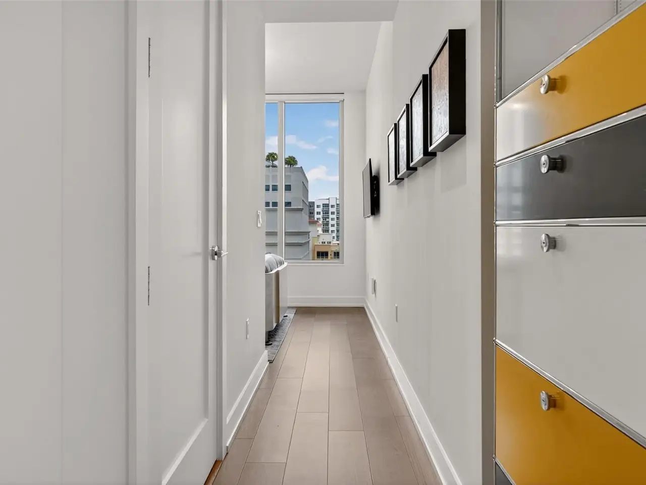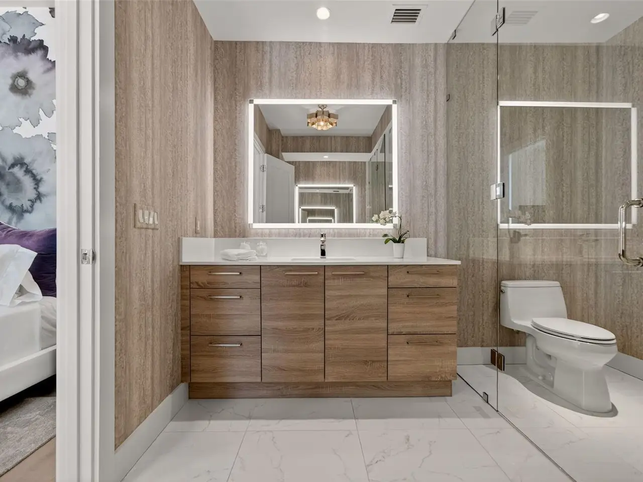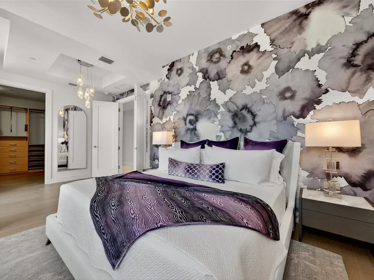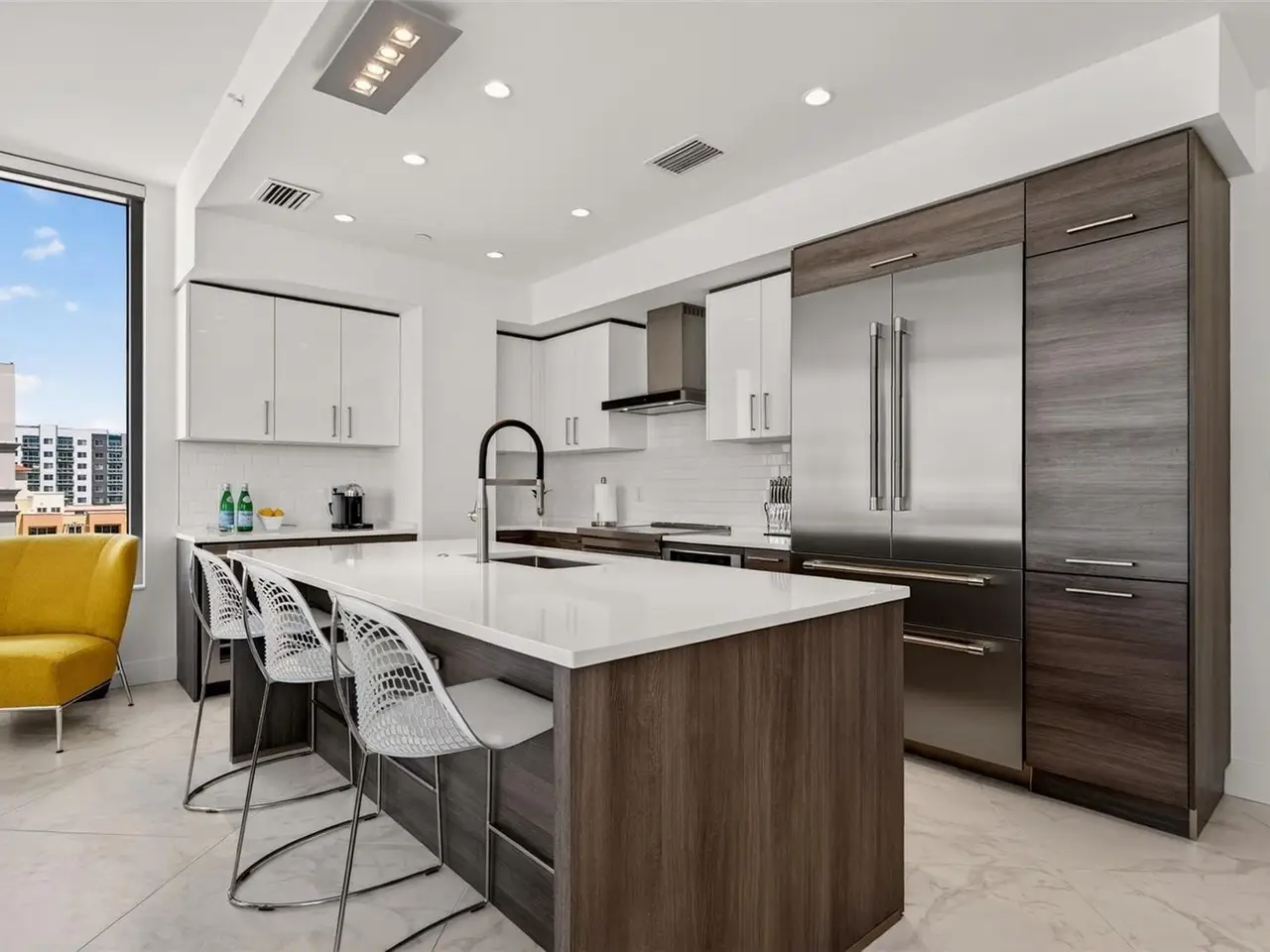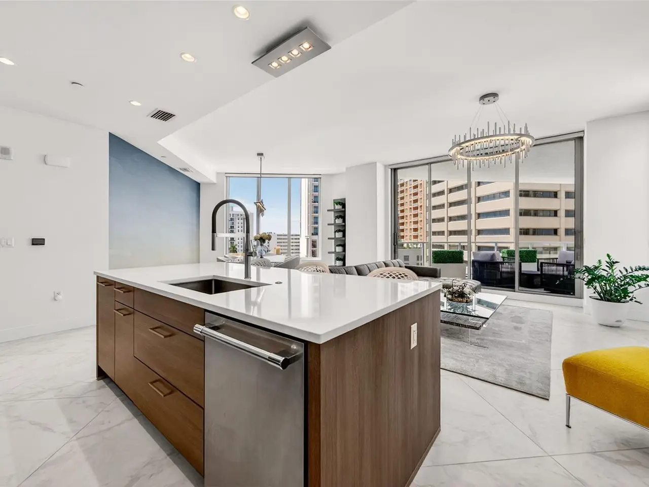 Design perfection at The Mark in this exquisitely designed and impeccably maintained three-bedroom residence with dramatic art gallery entrance. From the moment you step inside, walls of glass frame sweeping vistas of the sparkling city skyline and Sarasota Bay. The home features two private and spacious balconies inviting you to enjoy morning coffee or sunset cocktails. The open living, dining, and kitchen spaces are filled with natural light from full height sliding glass doors that open onto the terrace. Electronic window treatments add a refined touch, allowing you to balance privacy with soft daylight. The sophisticated den with custom shelving and its picturesque view creates the perfect home office or cozy reading nook. The primary suite is a peaceful sanctuary with its own private balcony, custom-designed closet, and spa-like bath featuring dual vanities, lighted mirrors, and a spacious frameless glass shower. Two additional en-suite bedrooms offer comfort and privacy for family and guests. Touches of sophisticated designer wall paper and custom lighting throughout the home. The chef’s kitchen is both stylish and functional, featuring Nolte Premium European cabinets, quartz countertops, Euro Dark/High Gloss soft-close doors, sliding shelves, subway tile backsplash, and Italian-honed porcelain floors. This home is like a brand-new residence with every detail perfectly executed. For convenience and peace of mind, the condo includes a temperature-controlled storage unit on the same floor as residence, two side-by-side gated parking spaces, and access to two electric vehicle charging stations. World class amenities include the 5th floor amenity deck sporting a 65-foot resort style heated saltwater pool and spa, lounge area, fire pit, outdoor grills, high tech fitness center, spin room and a club room with fire place, bar, billiards, catering kitchen and newsroom. The concierge service provides convenience and security. Experience the epitome of urban living in Sarasota. Indulge in the vibrant arts and culture scene, fine dining and upscale shopping, all within walking distance.