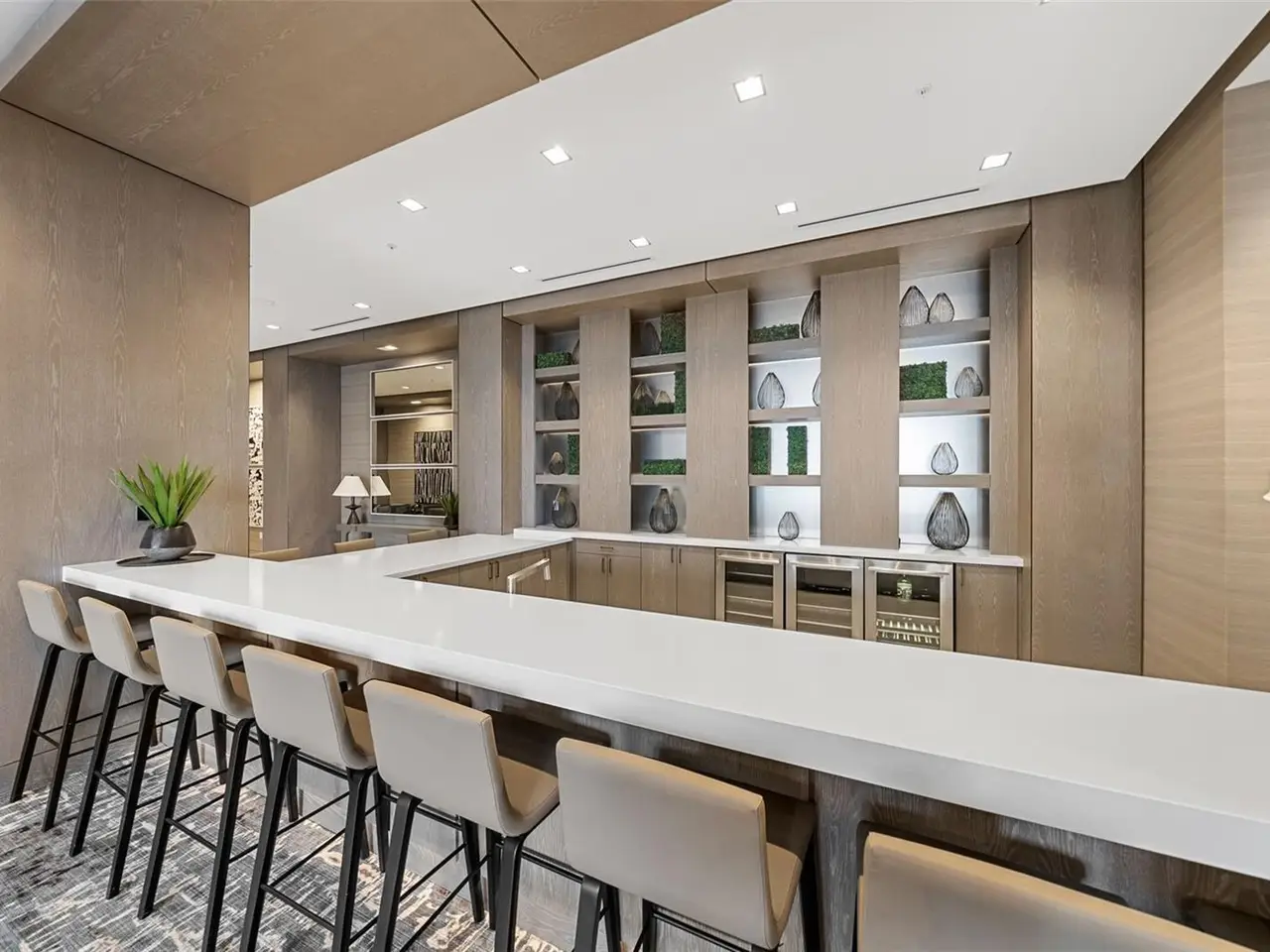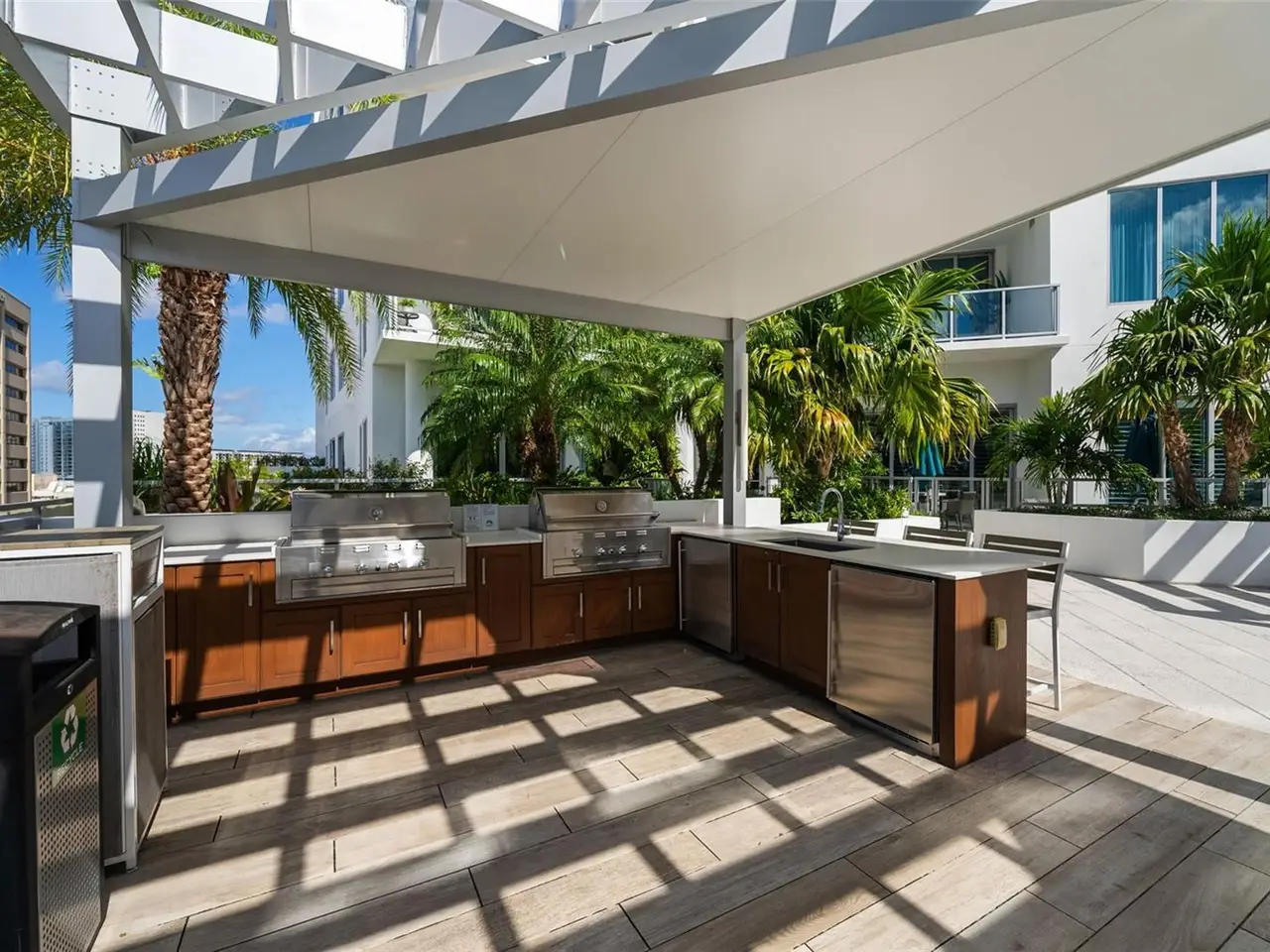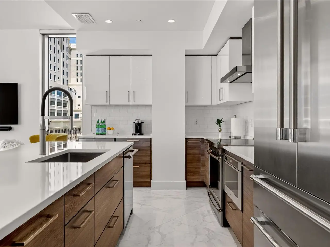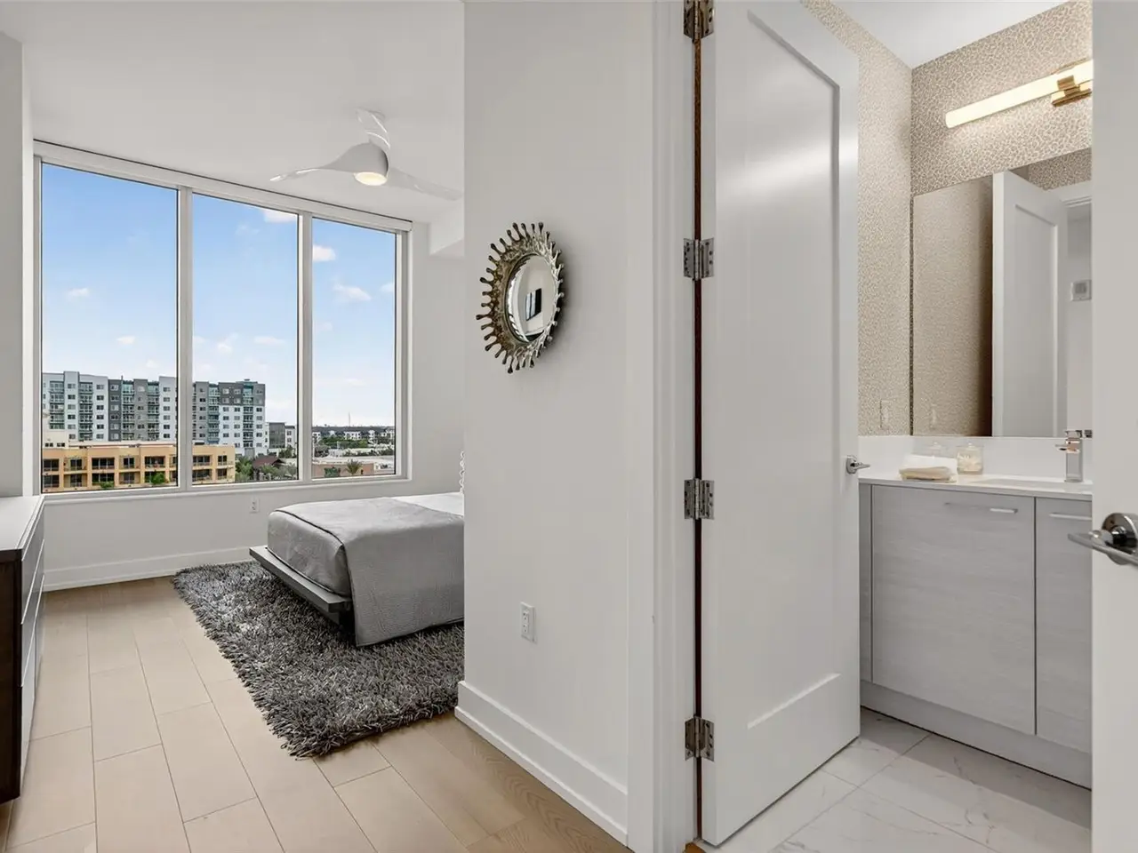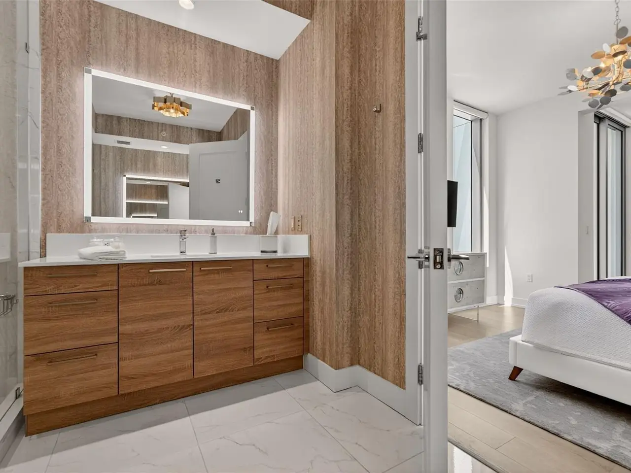 Design perfection at The Mark in this exquisitely designed and impeccably maintained three-bedroom residence with dramatic art gallery entrance. From the moment you step inside, walls of glass frame sweeping vistas of the sparkling city skyline and Sarasota Bay. The home features two private and spacious balconies inviting you to enjoy morning coffee or sunset cocktails. The open living, dining, and kitchen spaces are filled with natural light from full height sliding glass doors that open onto the terrace. Electronic window treatments add a refined touch, allowing you to balance privacy with soft daylight. The sophisticated den with custom shelving and its picturesque view creates the perfect home office or cozy reading nook. The primary suite is a peaceful sanctuary with its own private balcony, custom-designed closet, and spa-like bath featuring dual vanities, lighted mirrors, and a spacious frameless glass shower. Two additional en-suite bedrooms offer comfort and privacy for family and guests. Touches of sophisticated designer wall paper and custom lighting throughout the home. The chef’s kitchen is both stylish and functional, featuring Nolte Premium European cabinets, quartz countertops, Euro Dark/High Gloss soft-close doors, sliding shelves, subway tile backsplash, and Italian-honed porcelain floors. This home is like a brand-new residence with every detail perfectly executed. For convenience and peace of mind, the condo includes a temperature-controlled storage unit on the same floor as residence, two side-by-side gated parking spaces, and access to two electric vehicle charging stations. World class amenities include the 5th floor amenity deck sporting a 65-foot resort style heated saltwater pool and spa, lounge area, fire pit, outdoor grills, high tech fitness center, spin room and a club room with fire place, bar, billiards, catering kitchen and newsroom. The concierge service provides convenience and security. Experience the epitome of urban living in Sarasota. Indulge in the vibrant arts and culture scene, fine dining and upscale shopping, all within walking distance.