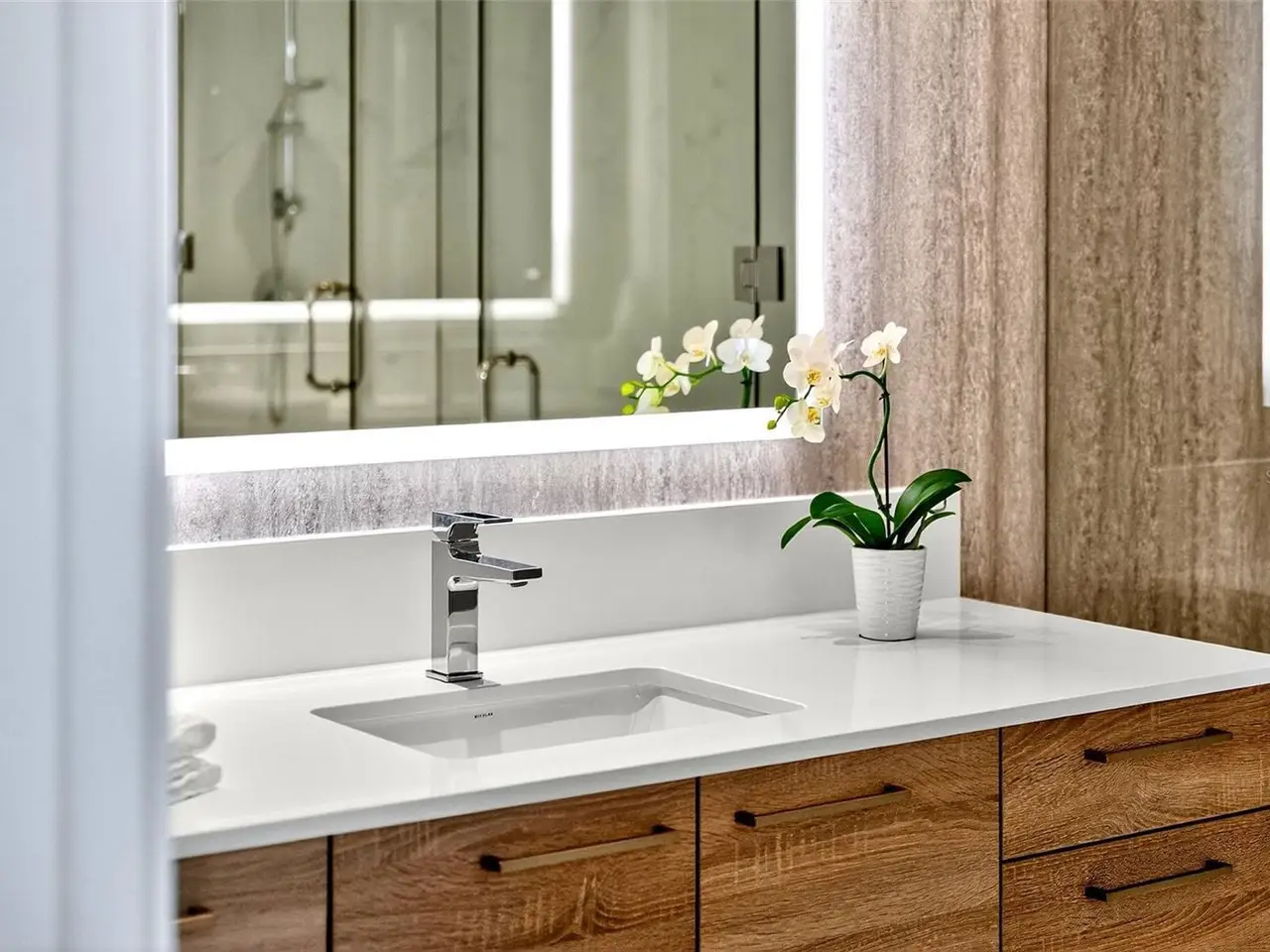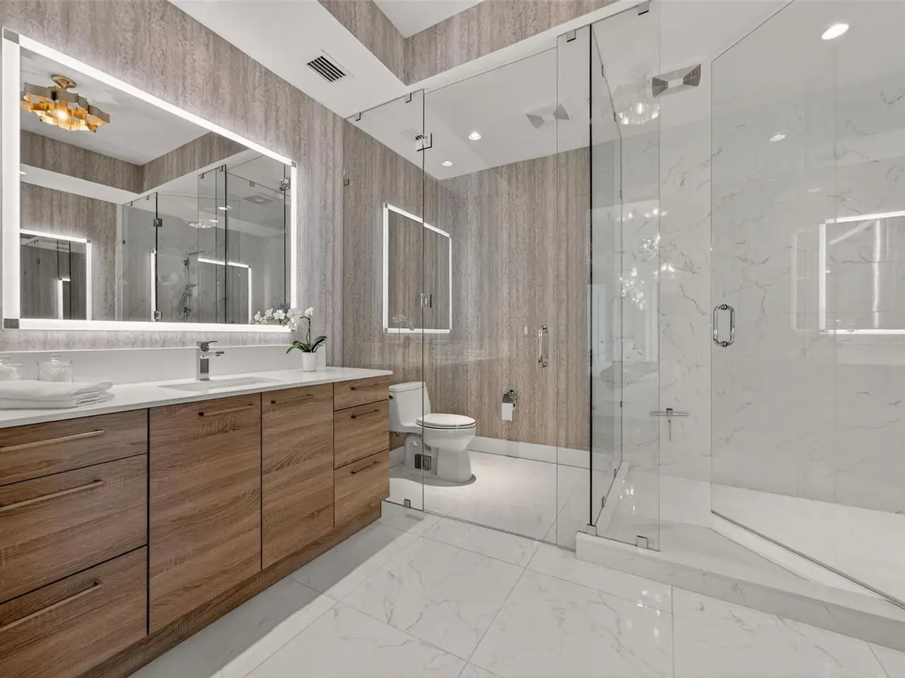Spa-like bath with dual vanities