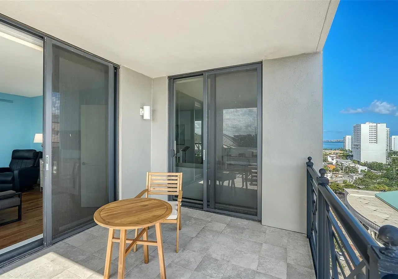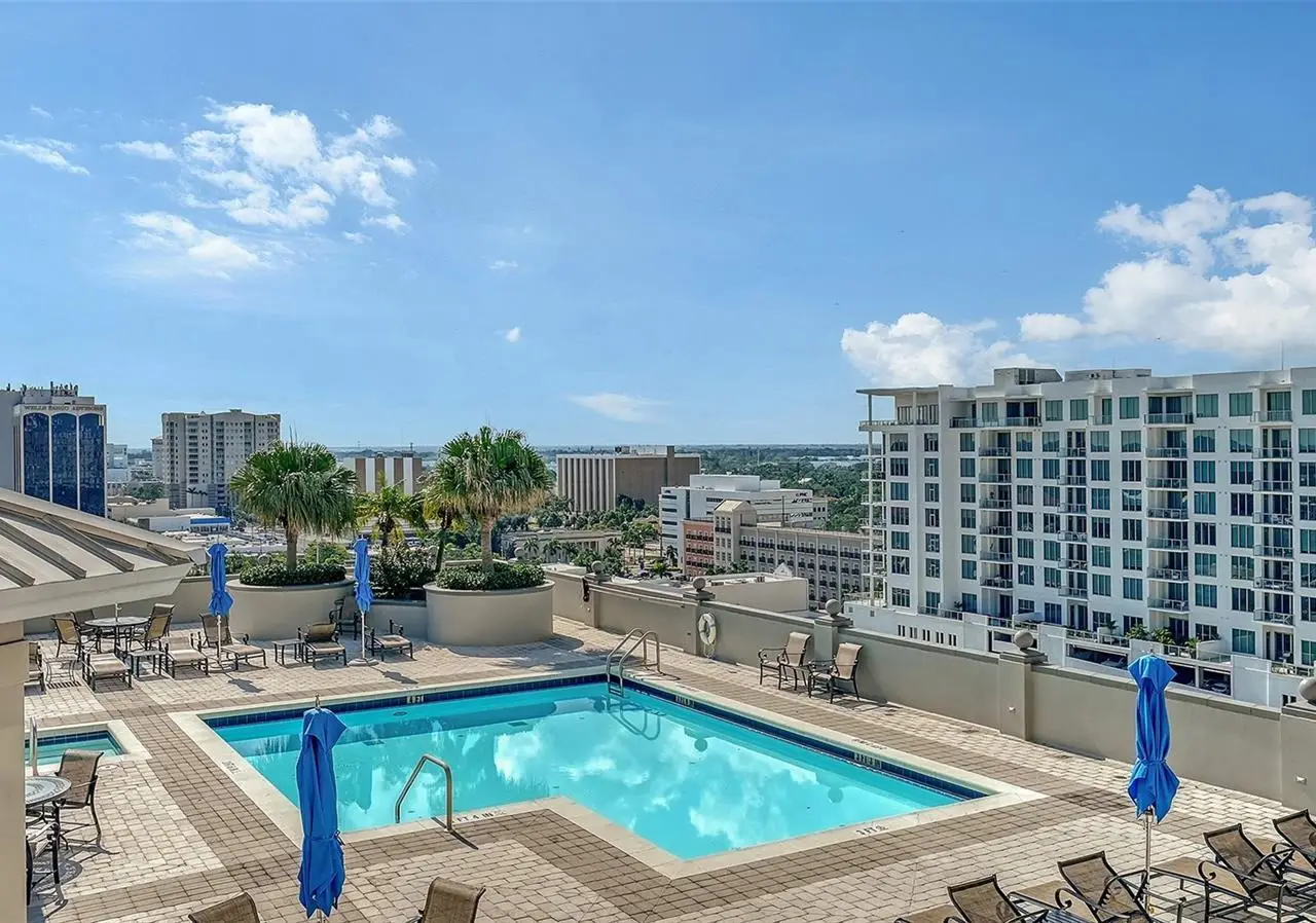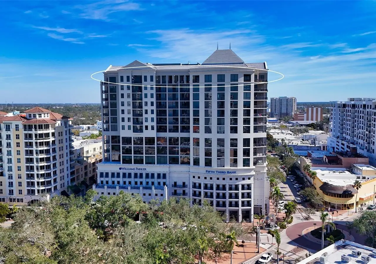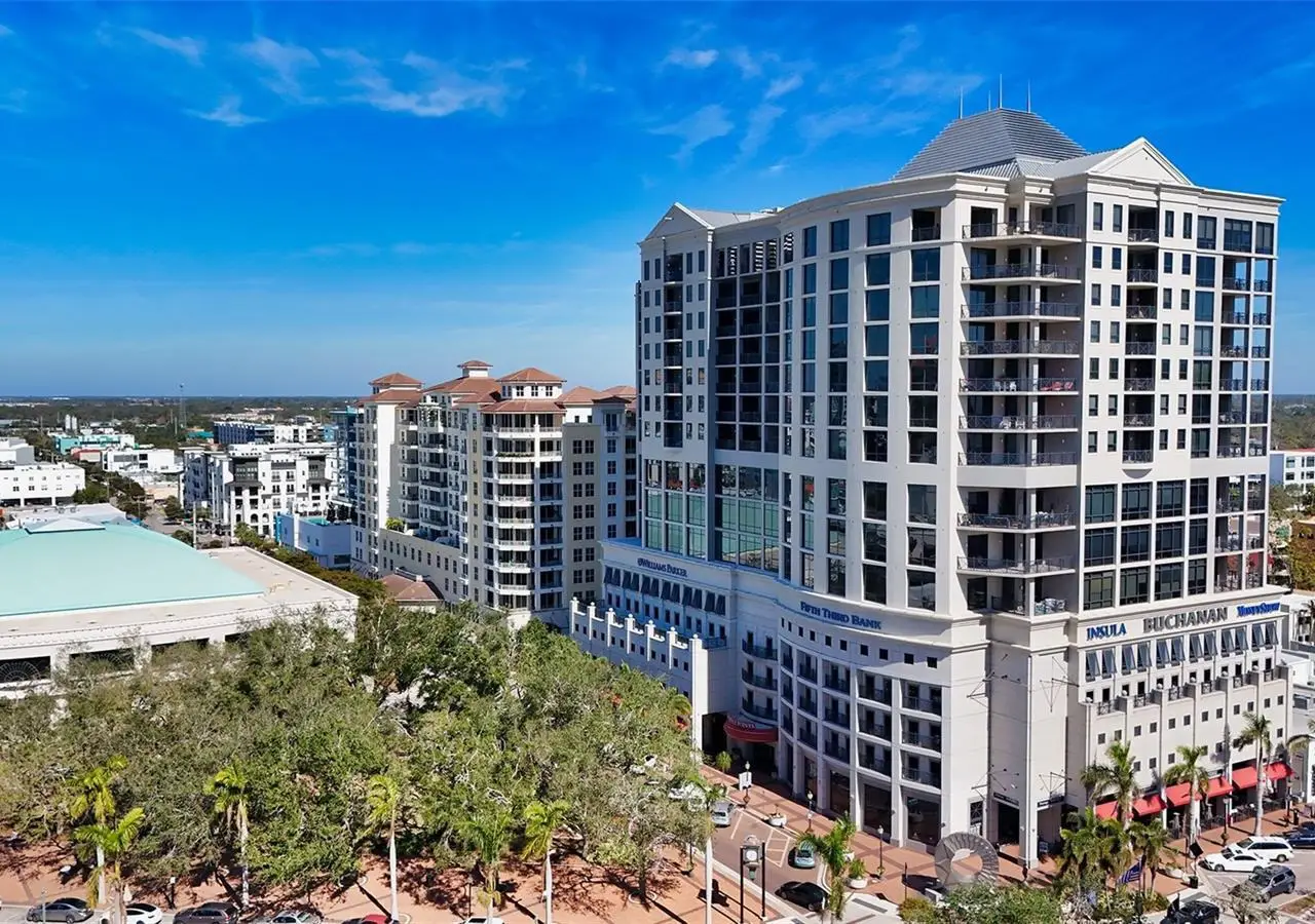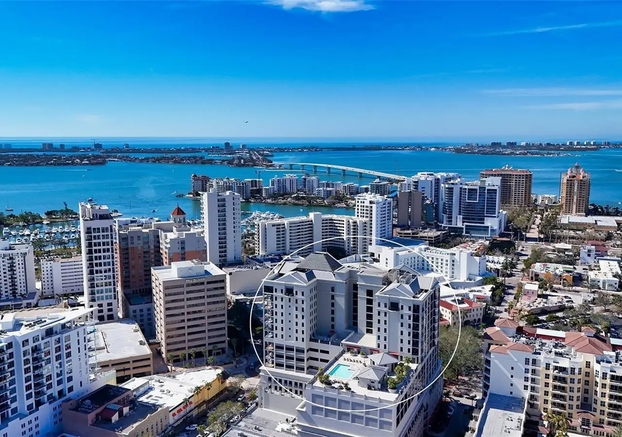 Lavish boutique living in the heart of Downtown Sarasota awaits at the Plaza at Five Points. This tastefully updated, turnkey 2-bedroom, 2-bath condo residence, offers city living with refined style and comfort. A spacious entry foyer with a dedicated office nook provides a practical and welcoming first impression ideal for year-round living or an stress-free seasonal retreat. The kitchen features sleek quartz countertops and newer, high-quality appliances. The primary en-suite bedroom showcases beautiful city views, a California-style walk-in closet, and access to the private lanai. The guest bedroom is generously sized and offers equally charming downtown vistas. The lanai is accessible from both the living room and the primary bedroom, providing a seamless indoor-outdoor flow. Additional features include two deeded garage parking spaces conveniently located near the lobby, and a private storage room. Building security includes controlled access at all entry points and elevators, ensuring peace of mind. Enjoy an elevated lifestyle with luxurious amenities including front desk concierge service, front desk steward, valet parking, rooftop heated pool and spa, outdoor grilling area, cabana with gazebo, a well-equipped fitness center, community room with catering kitchen and fireplace, conference room, and a guest suite available for weekly reservations. Step out of your lobby into Sarasota's vibrant arts and entertainment district. Just a short stroll to the Sarasota Opera House, theaters, live music venues, art galleries, eclectic shopping, and top-rated dining. Whole Foods is around the corner for added convenience. The Bayfront and Marina Jack are just minutes away, offering a variety of boating and waterfront activities. Easy access St. Armands Circle, Lido Beach, Longboat Key, and world-renowned Siesta Key Beach. The Sarasota-Bradenton International Airport, Selby Botanical Gardens, Van Wezel Performing Arts Center, and the Asolo Repertory Theatre are all within a short drive. The building performs like a champ during hurricanes and storms. Residences with this floor plan in 'The Plaza at Five Points' are rarely available schedule your private or virtual showing today. Vacant and easy to show.