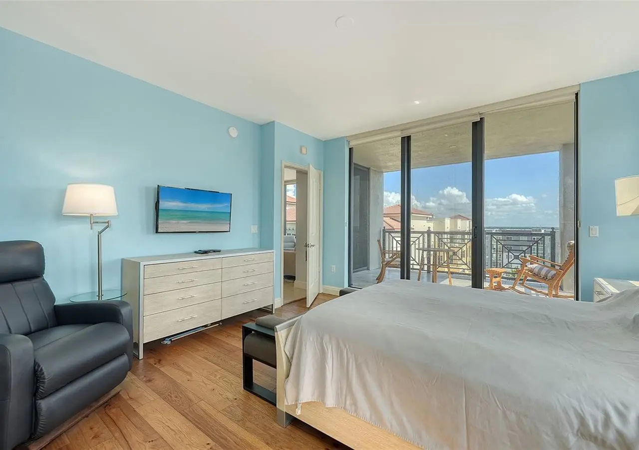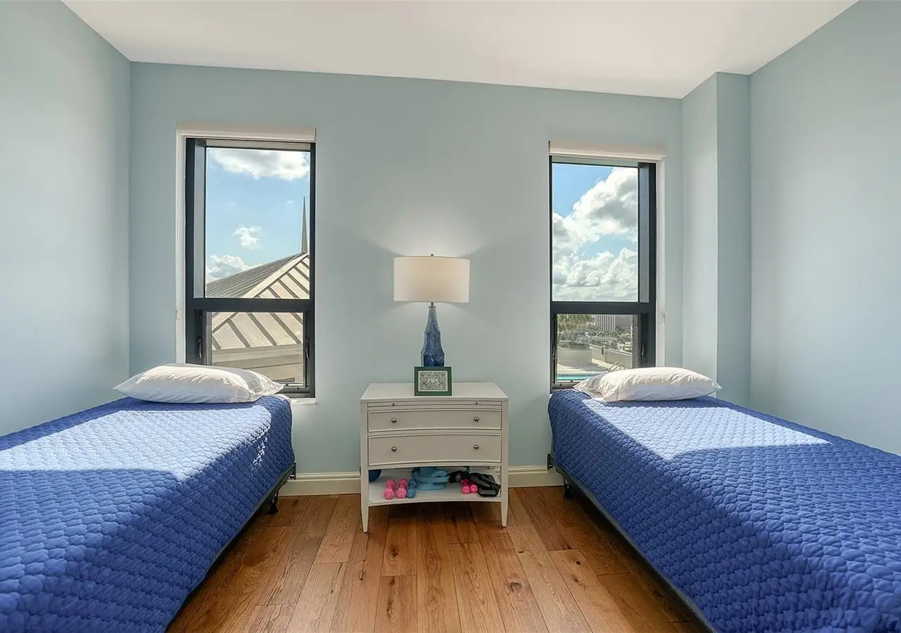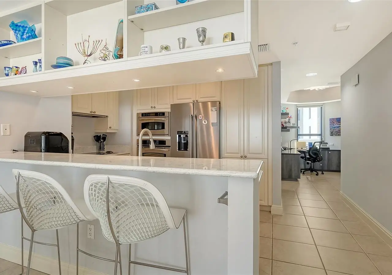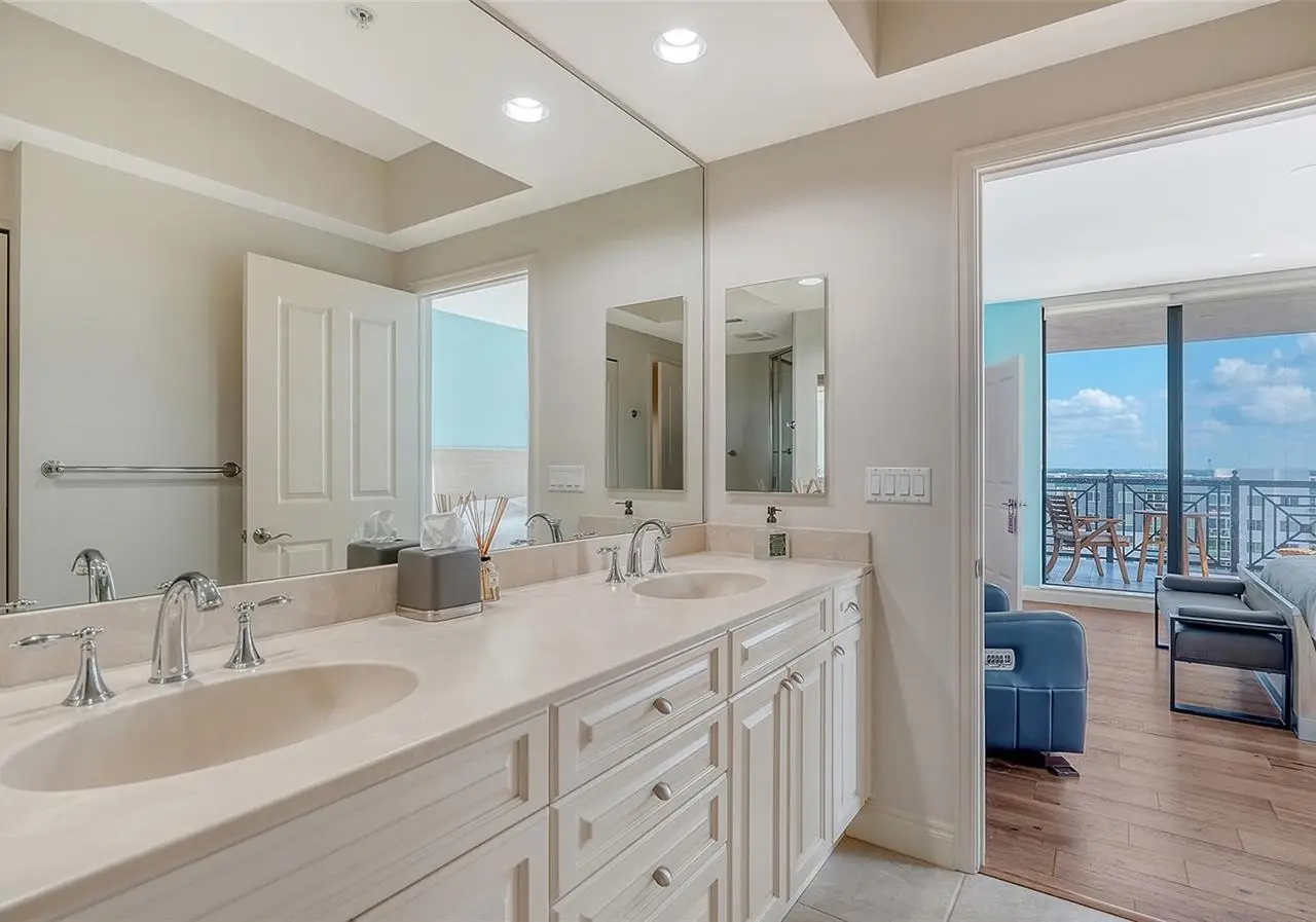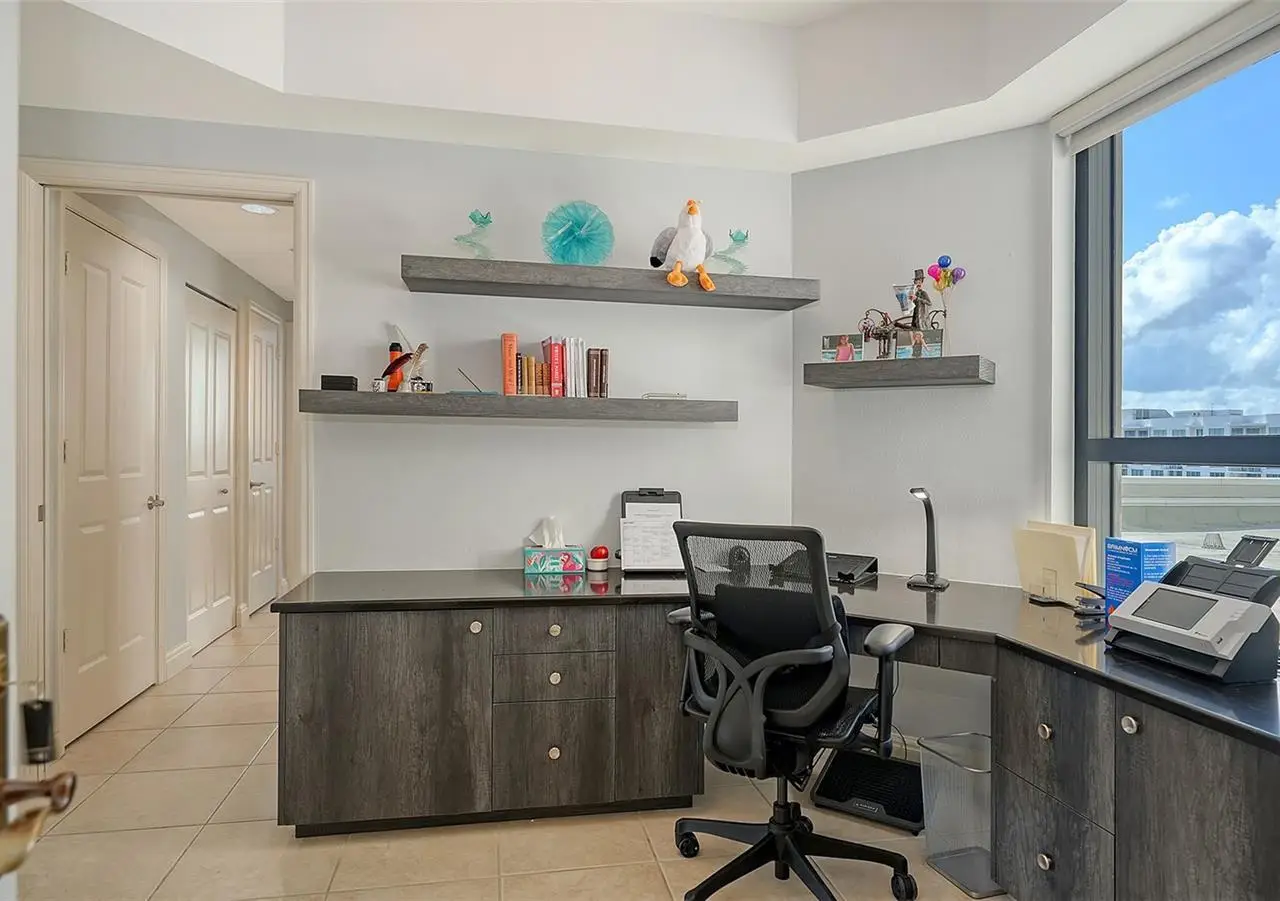 Lavish boutique living in the heart of Downtown Sarasota awaits at the Plaza at Five Points. This tastefully updated, turnkey 2-bedroom, 2-bath condo residence, offers city living with refined style and comfort. A spacious entry foyer with a dedicated office nook provides a practical and welcoming first impression ideal for year-round living or an stress-free seasonal retreat. The kitchen features sleek quartz countertops and newer, high-quality appliances. The primary en-suite bedroom showcases beautiful city views, a California-style walk-in closet, and access to the private lanai. The guest bedroom is generously sized and offers equally charming downtown vistas. The lanai is accessible from both the living room and the primary bedroom, providing a seamless indoor-outdoor flow. Additional features include two deeded garage parking spaces conveniently located near the lobby, and a private storage room. Building security includes controlled access at all entry points and elevators, ensuring peace of mind. Enjoy an elevated lifestyle with luxurious amenities including front desk concierge service, front desk steward, valet parking, rooftop heated pool and spa, outdoor grilling area, cabana with gazebo, a well-equipped fitness center, community room with catering kitchen and fireplace, conference room, and a guest suite available for weekly reservations. Step out of your lobby into Sarasota's vibrant arts and entertainment district. Just a short stroll to the Sarasota Opera House, theaters, live music venues, art galleries, eclectic shopping, and top-rated dining. Whole Foods is around the corner for added convenience. The Bayfront and Marina Jack are just minutes away, offering a variety of boating and waterfront activities. Easy access St. Armands Circle, Lido Beach, Longboat Key, and world-renowned Siesta Key Beach. The Sarasota-Bradenton International Airport, Selby Botanical Gardens, Van Wezel Performing Arts Center, and the Asolo Repertory Theatre are all within a short drive. The building performs like a champ during hurricanes and storms. Residences with this floor plan in 'The Plaza at Five Points' are rarely available schedule your private or virtual showing today. Vacant and easy to show.