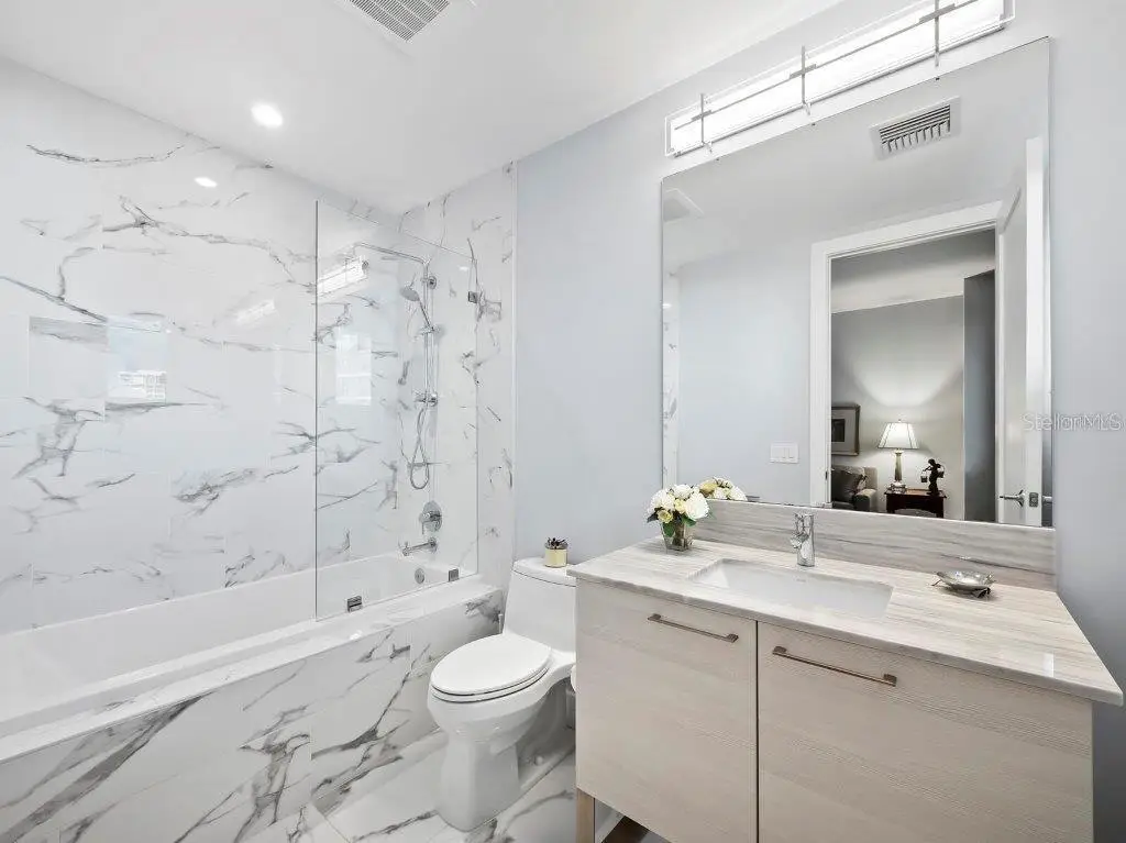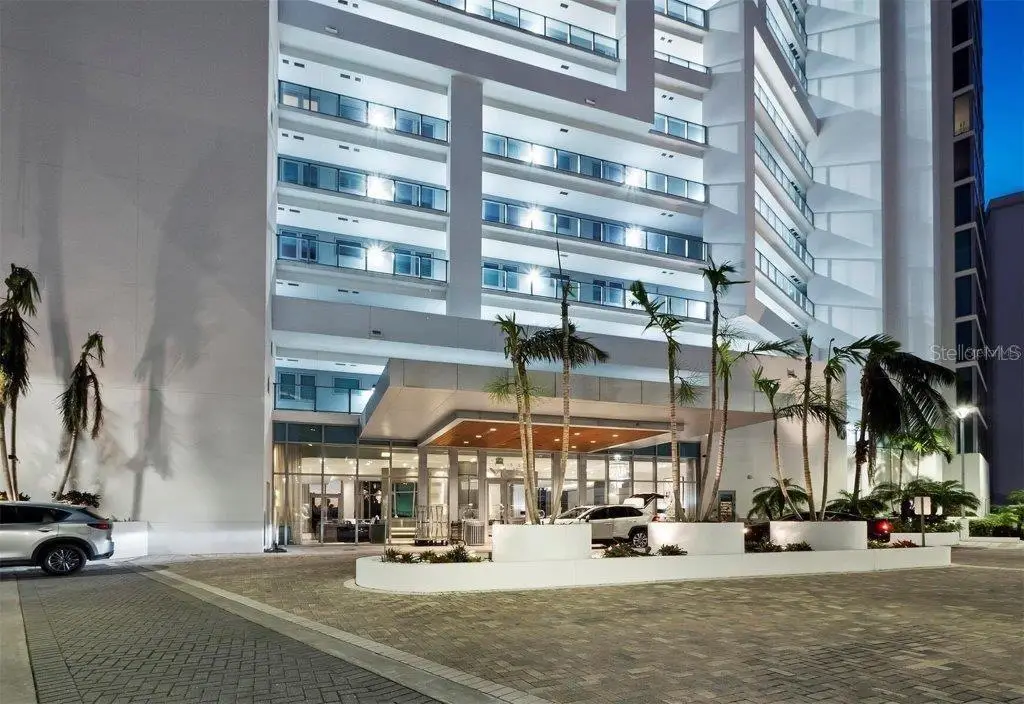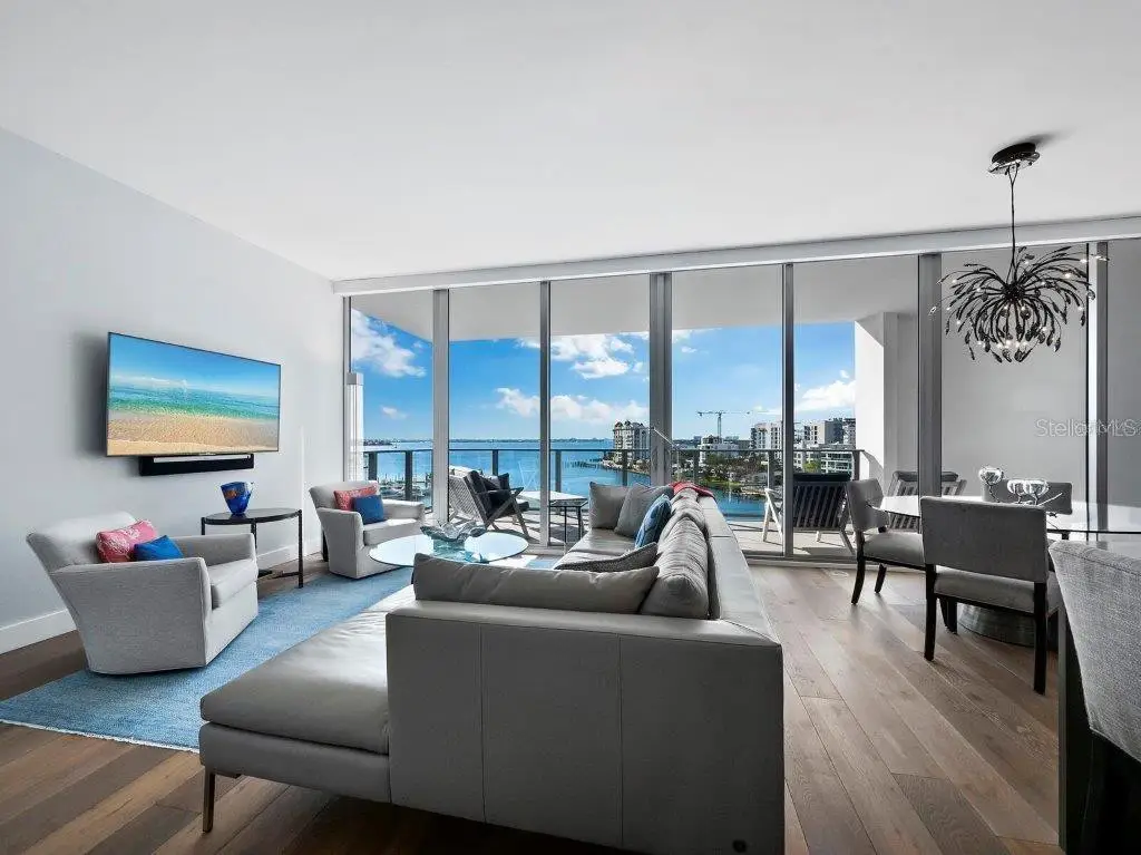 A fabulously appointed designer residence in a coveted, amenity-rich building, VUE 703 offers the pinnacle of luxury living in the heart of Sarasota's cosmopolitan downtown. Now available turnkey with luxury furnishings and accessories. Renowned for its exceptional resort-style living and elegant contemporary style, VUE is an incredible high-rise building with enviably curated amenities that extend from the valet service and concierge to plush resident lounges and facilities, all within steps of Sarasota's world-class cultural scene and thriving hub of shops, restaurants, and galleries. This elevated residence with private elevator access is a spacious retreat that blends the sleek modern style of the building with exquisite design elements that lend warmth and enhance the luxurious comfort. Premium upgrades include elegant wide-plank wood floors, designer lighting and decor-both by Creston; high-end built-in audio video system, water filtration by Aqua, while tall 10" ceilings throughout accentuate absolutely stunning water views. From the front door, unobstructed site lines showcase spectacular southwest vistas across Sarasota Bay and the keys to the Gulf of Mexico beyond. Thoughtfully designed to maximize the views, the home features an airy, open layout with a full wall of floor-to-ceiling sliding impact glass doors that extend the central living space to a deep private terrace with glass railings. Overlooking the dining and central living spaces, the gourmet kitchen with beautiful Italian cabinetry and stainless appliances wraps around a large quartz-clad island with abundant prep and storage space as well as additional seating for guests. The open plan living room and dining area are perfect for entertaining, flowing seamlessly to a private terrace that spans nearly 300 square feet with protective shade and picture-perfect views overlooking the waterfront and marina. The owner's suite enjoys its own floor-to-ceiling wall of windows for spectacular water and sunset views, with a resort-style bathroom that features extra-long double vanity, enviable storage, glass-enclosed walk-in shower, and separate water closet. Two separate walk-in closets add to the owner's luxury. Near the home's entry, a spacious second bedroom offers en suite comfort and ample closet space, and a separate den accommodates a private office or media lounge. The additional half bath is luxuriously outfitted with haute design elements including crystal sconces and a carved onyx sink. A generous, separate utility room with washer and dryer adds to the exceptional in-home conveniences. The residence comes with deeded, secure storage space and two assigned parking spaces that are gated and enclosed. Ideally located across from Sarasota's celebrated waterfront and within steps of Downtown's cosmopolitan core, VUE is a highly sought after address with a dazzling array of premium amenities including heated pool and spa with a spectacular pool deck that encompasses multiple lounge areas, fire pit, and enormous pergola with gourmet grill station. Additional amenities include fitness center, dedicated pet recreational area, concierge and security. Offered by the original owners, meticulously maintained and upgraded, VUE 703 is a valuable opportunity to enjoy a lifestyle of ultimate comfort and style.