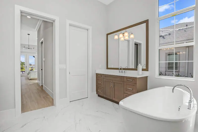 Modern self-standing bathtub and elegant bathroom features