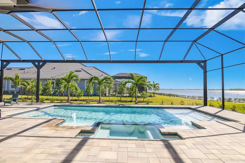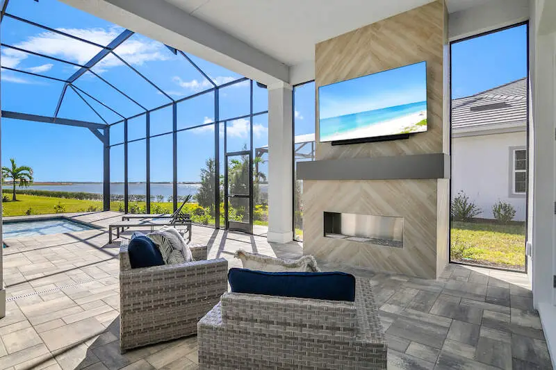 Expansive patio and screened lanai with serene lake views