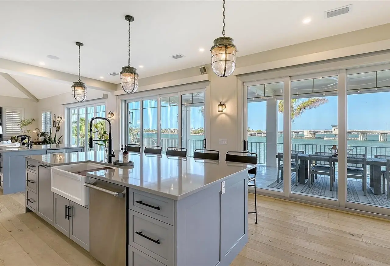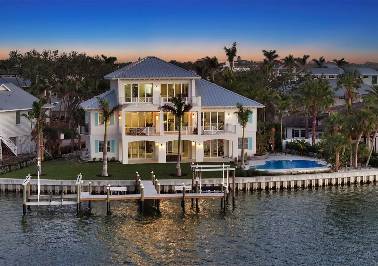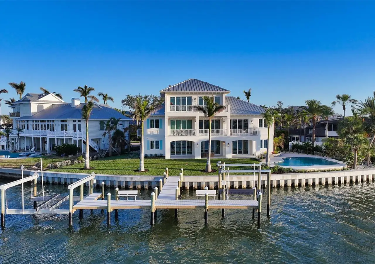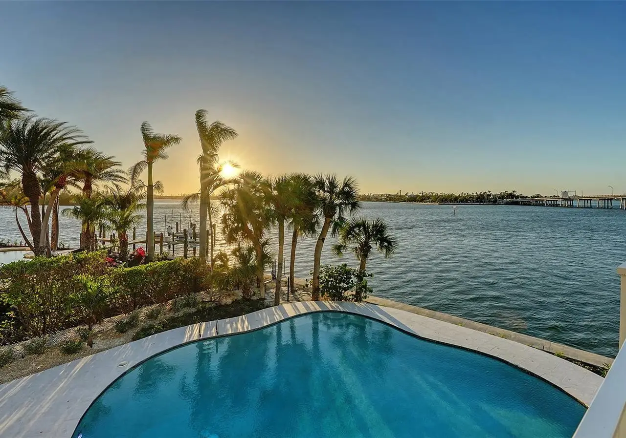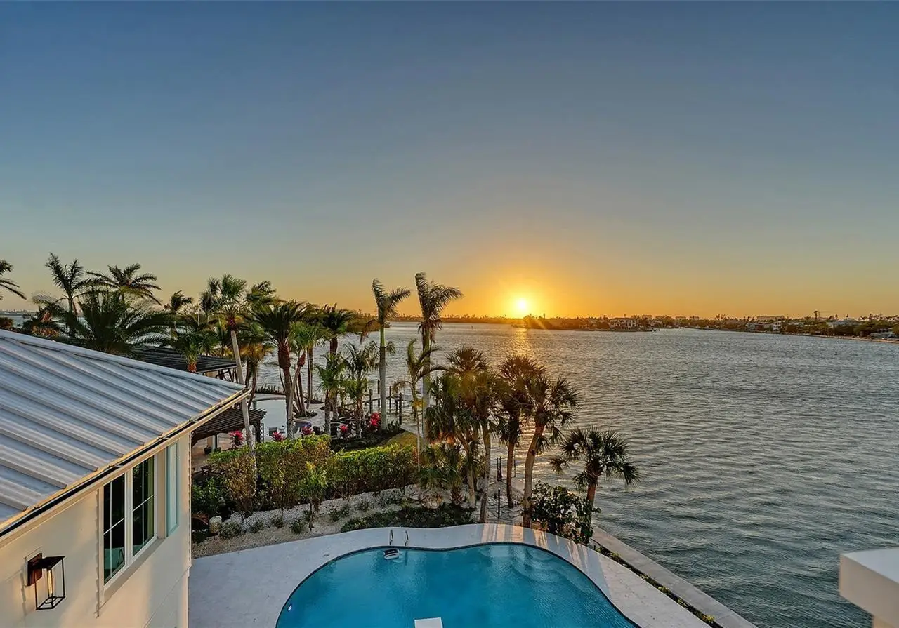 Experience the epitome of waterfront living in the sought-after San Remo neighborhood, ideally positioned at the tip of the peninsula. This exceptional 2022 custom-built residence offers sweeping panoramic views of Sarasota Bay and the city skyline, providing an unparalleled backdrop for everyday living. Boasting 4,359 square feet of thoughtfully designed living space, this home features 4 ensuite bedrooms, powder room, two expansive terraces, and a private study. The moment you step inside, you are greeted by breathtaking bay views through floor-to-ceiling windows and sliding glass doors that flood the space with natural light. The open-concept main level is designed for both comfort and style, with vaulted ceilings, unobstructed views and hardwood floors throughout. The chef's kitchen is a true highlight, complete with a large island offering seating, a hidden pantry, custom cabinetry and designer appliances. The kitchen opens to a large covered terrace, featuring an automated screen system to seamlessly blend indoor and outdoor living. The upper level is dedicated to the owner's suite, offering a spacious bedroom, a spa-like bathroom, a private terrace, and a separate area ideal for a study or lounge. An elevator services all levels. The backyard is designed for ultimate relaxation and entertainment, featuring a large saltwater pool, a new dock with two boat lifts, new seawall and a generous lawn with panoramic water views. Additional features include solar panels with 3 Tesla Powerwalls and an oversized 3-car side-entry garage with epoxy flooring. Located just minutes from downtown Sarasota, Southside Village's shops and restaurants, and the world-renowned Siesta Key beaches, this home is the perfect sanctuary for those seeking newer construction, convenience, and an unmatched lifestyle. Schedule your private showing today.