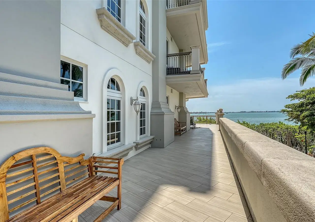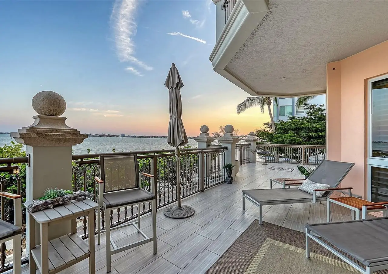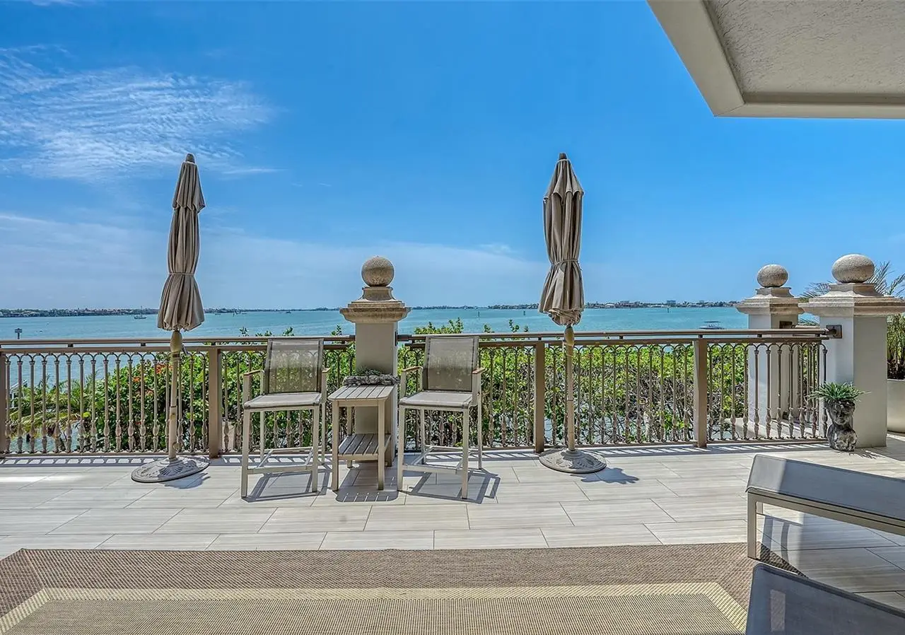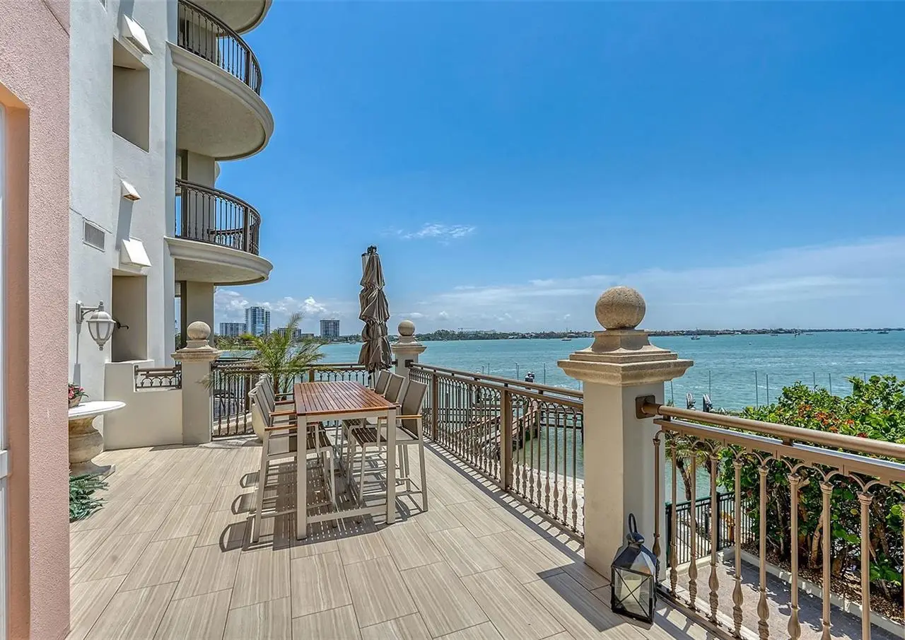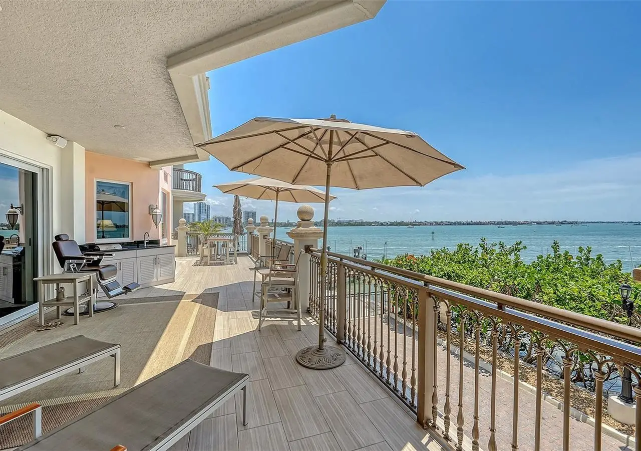 Experience the epitome of elegance and timeless sophistication in this exquisitely appointed residence at the exclusive Grande Riviera, a breathtaking architectural gem nestled in the prestigious Golden Gate Point neighborhood. Meticulously maintained, this classic condominium offers panoramic views of Sarasota Bay and the sparkling downtown skyline, setting a new standard for luxury waterfront living. This residence boasts the largest terrace in Grande Riviera, approximately 2300 square feet, providing the ultimate setting for sunsets and entertaining friends and family. One of only 13 exclusive residences, this home offers an intimate and private lifestyle, with a private elevator entrance leading directly to the elegant foyer. Designed for both comfort and grandeur, the residence features arched walkways, rich crown molding, and expansive living spaces ideal for entertaining or quiet reflection. The heart of the home is a remodeled chef’s kitchen, outfitted with a large center island, solid wood cabinetry adorned with sleek black hardware, a quartz backsplash, granite countertops, and a Sub-Zero refrigerator and freezer, as well as a Wolf gas range and double wall oven. Deluxe Laundry room with custom cabinetry and workspace conveniently located near the kitchen. A wet bar with a Sub-Zero wine fridge seamlessly connects the open living space to the elegant dining and living areas, creating a perfect flow for gatherings. Step outside onto the largest private wraparound terrace in the building, where you’ll enjoy breathtaking, unobstructed views of the bay. This is truly one of the most distinguished outdoor living spaces in the complex. The owners’ suite is a serene retreat, featuring dual walk-in closets with custom built-ins, and a spa-like bathroom with marble floors, a dual quartz vanity, walk-in shower with dual showerheads, and a private water closet. The suite also offers direct access to the terrace, allowing for peaceful mornings with stunning bay views. The guest suite boasts a private terrace entry, en suite bath, and walk-in closet, while a versatile den with double glass doors can serve as an office, sitting room, or additional guest space. Additional features include a private, deeded two-car garage with storage, resort-style pool, rooftop terrace, boat docks, on-site management, and private secured access. This is a rare opportunity to own a distinguished waterfront home in one of Sarasota’s most coveted locations, a residence that masterfully blends classic design, modern comforts, and breathtaking surroundings.