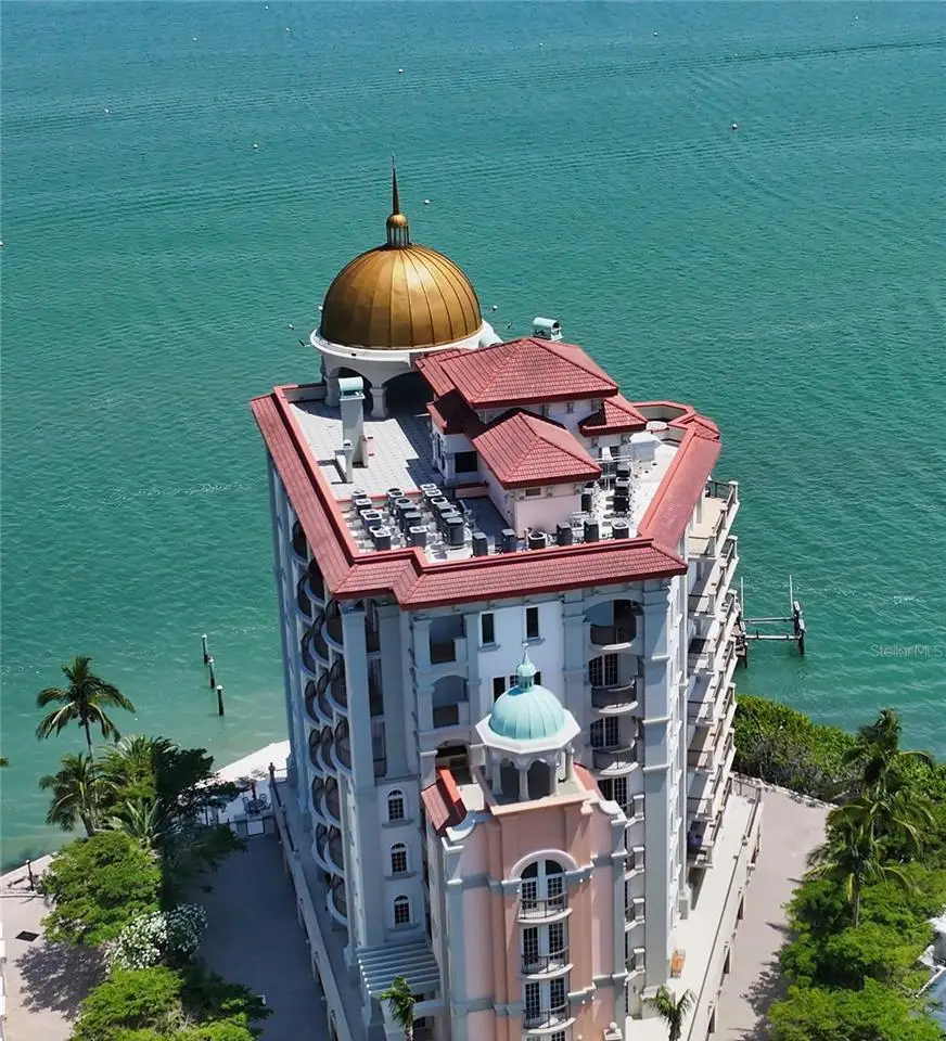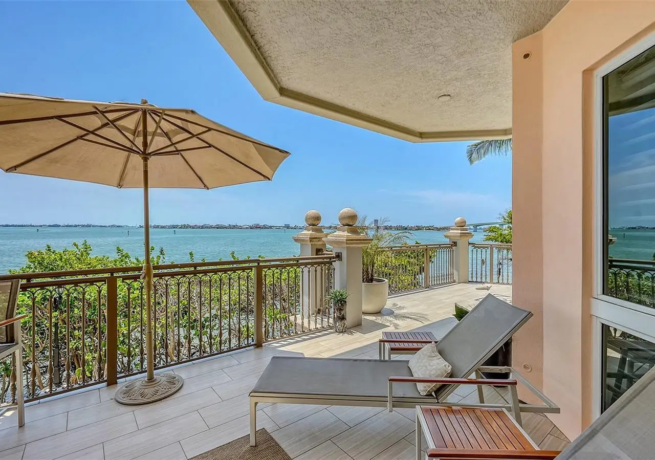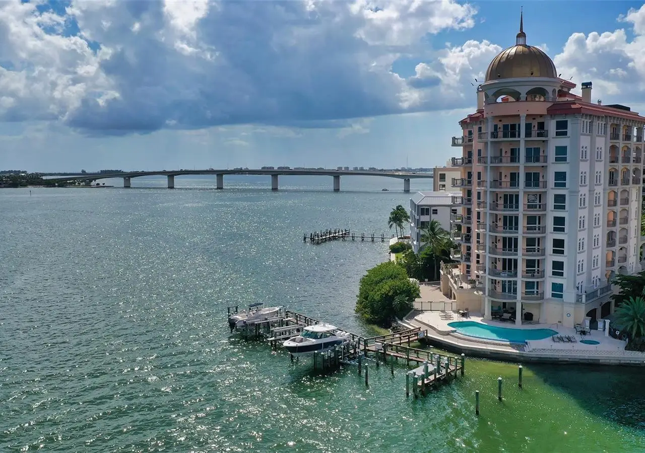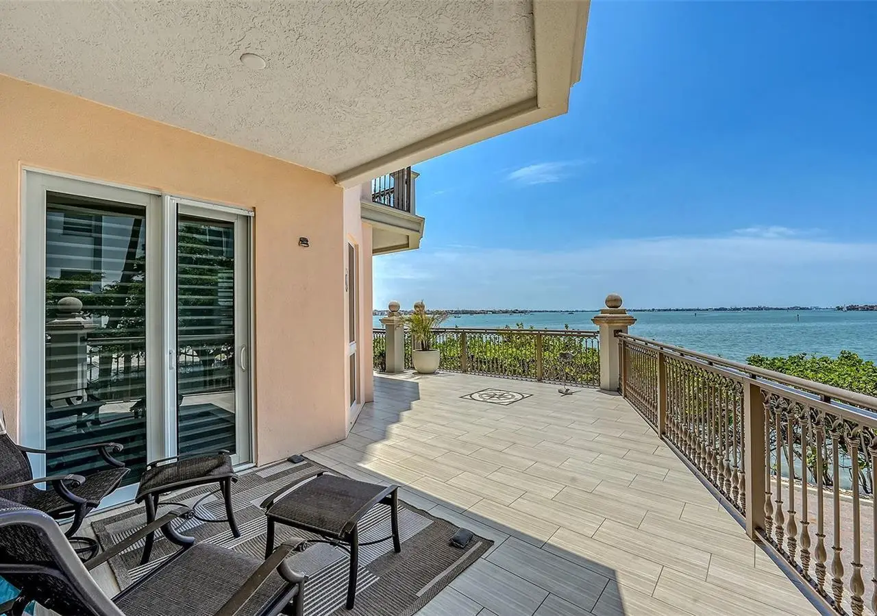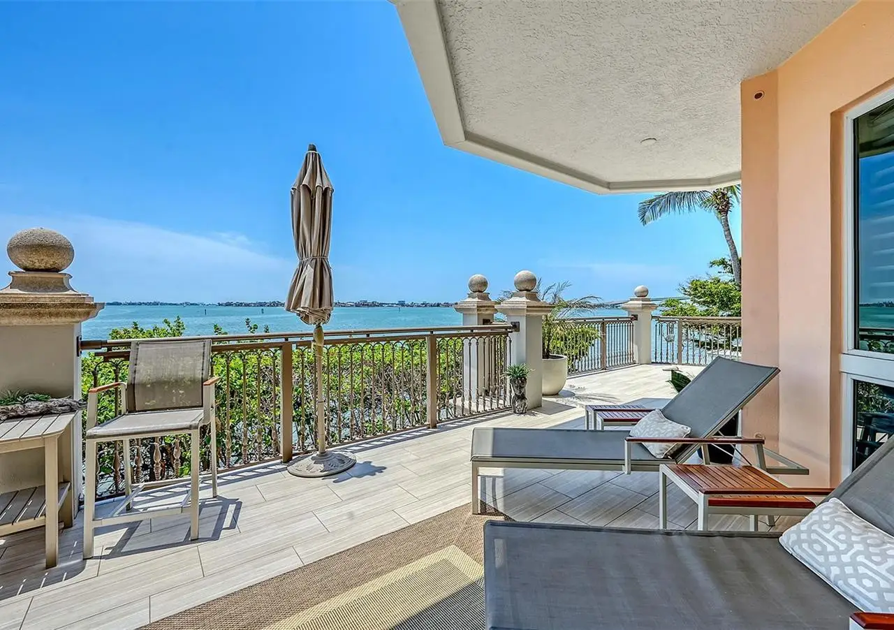 Experience the epitome of elegance and timeless sophistication in this exquisitely appointed residence at the exclusive Grande Riviera, a breathtaking architectural gem nestled in the prestigious Golden Gate Point neighborhood. Meticulously maintained, this classic condominium offers panoramic views of Sarasota Bay and the sparkling downtown skyline, setting a new standard for luxury waterfront living. This residence boasts the largest terrace in Grande Riviera, approximately 2300 square feet, providing the ultimate setting for sunsets and entertaining friends and family. One of only 13 exclusive residences, this home offers an intimate and private lifestyle, with a private elevator entrance leading directly to the elegant foyer. Designed for both comfort and grandeur, the residence features arched walkways, rich crown molding, and expansive living spaces ideal for entertaining or quiet reflection. The heart of the home is a remodeled chef’s kitchen, outfitted with a large center island, solid wood cabinetry adorned with sleek black hardware, a quartz backsplash, granite countertops, and a Sub-Zero refrigerator and freezer, as well as a Wolf gas range and double wall oven. Deluxe Laundry room with custom cabinetry and workspace conveniently located near the kitchen. A wet bar with a Sub-Zero wine fridge seamlessly connects the open living space to the elegant dining and living areas, creating a perfect flow for gatherings. Step outside onto the largest private wraparound terrace in the building, where you’ll enjoy breathtaking, unobstructed views of the bay. This is truly one of the most distinguished outdoor living spaces in the complex. The owners’ suite is a serene retreat, featuring dual walk-in closets with custom built-ins, and a spa-like bathroom with marble floors, a dual quartz vanity, walk-in shower with dual showerheads, and a private water closet. The suite also offers direct access to the terrace, allowing for peaceful mornings with stunning bay views. The guest suite boasts a private terrace entry, en suite bath, and walk-in closet, while a versatile den with double glass doors can serve as an office, sitting room, or additional guest space. Additional features include a private, deeded two-car garage with storage, resort-style pool, rooftop terrace, boat docks, on-site management, and private secured access. This is a rare opportunity to own a distinguished waterfront home in one of Sarasota’s most coveted locations, a residence that masterfully blends classic design, modern comforts, and breathtaking surroundings.