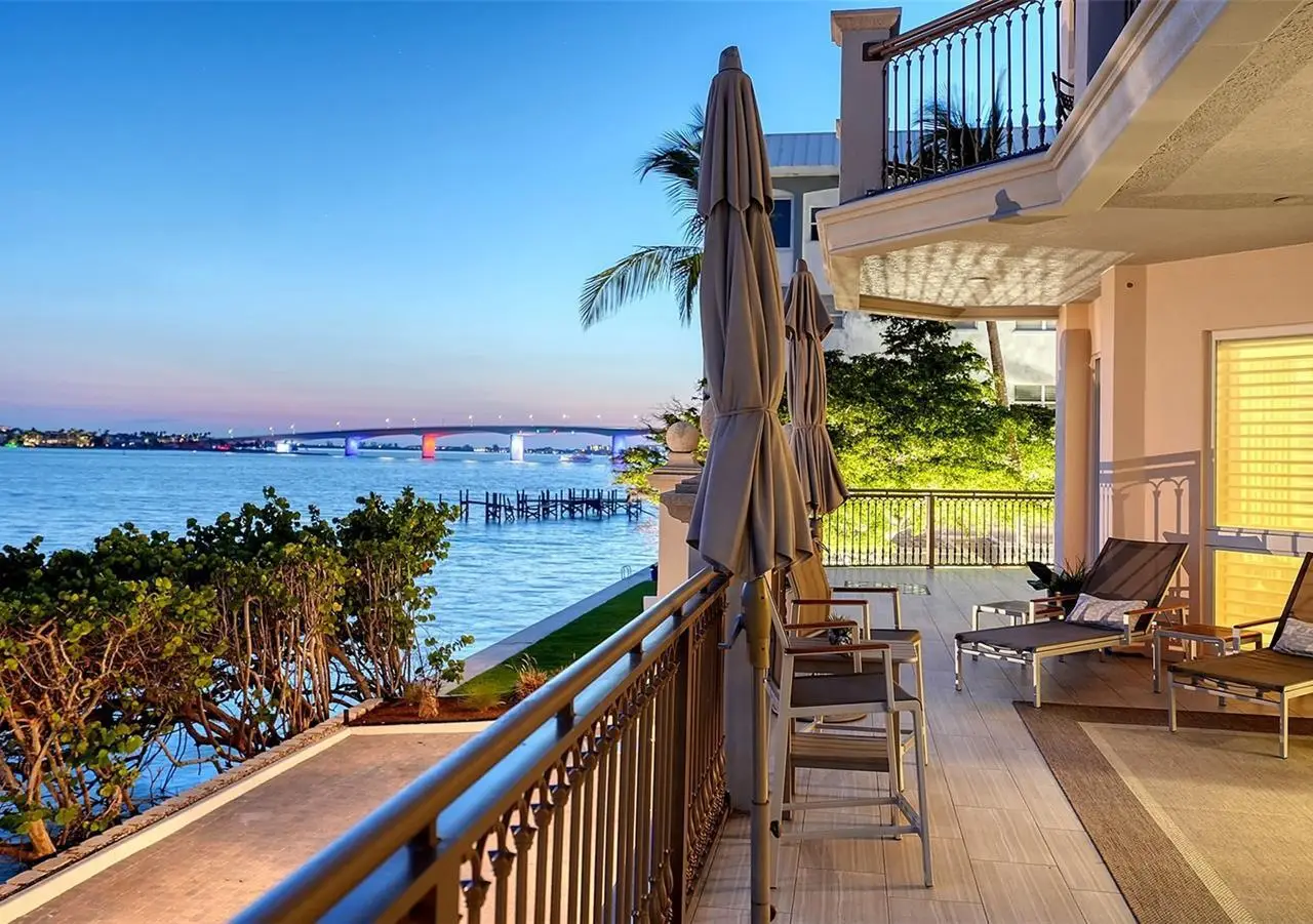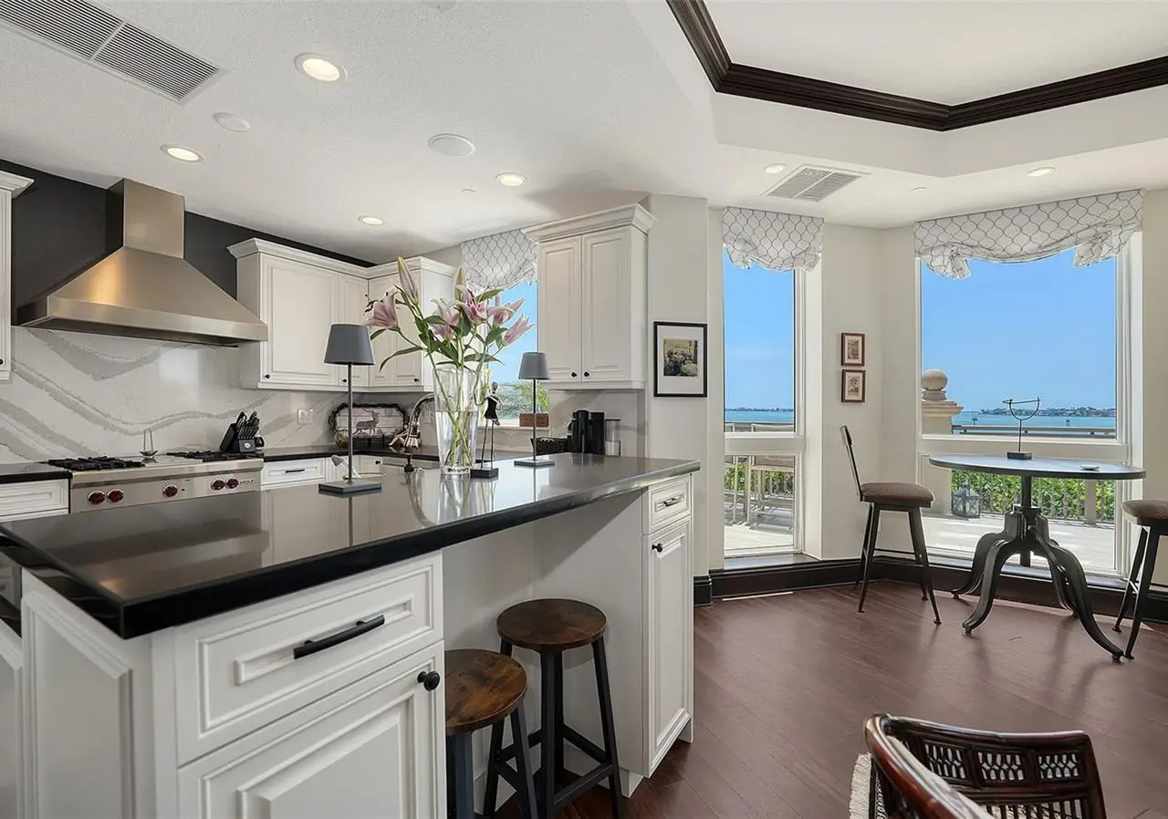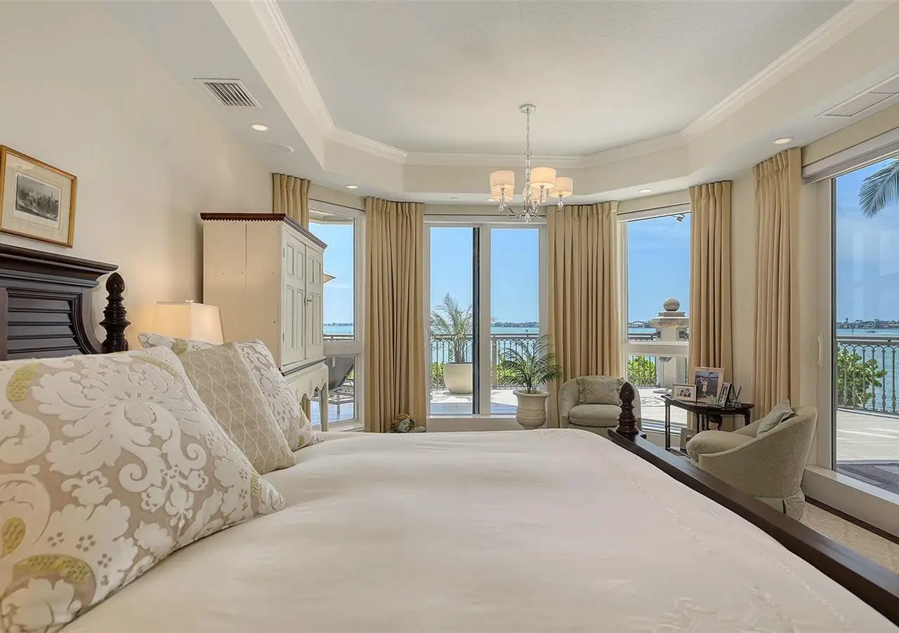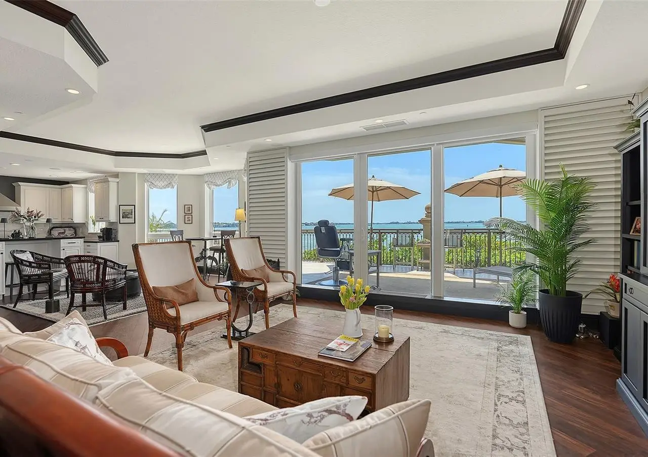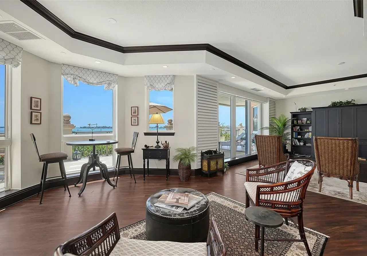Experience the epitome of elegance and timeless sophistication in this exquisitely appointed residence at the exclusive Grande Riviera, a breathtaking architectural gem nestled in the prestigious Golden Gate Point neighborhood. Meticulously maintained, this classic condominium offers panoramic views of Sarasota Bay and the sparkling downtown skyline, setting a new standard for luxury waterfront living. This residence boasts the largest terrace in Grande Riviera, approximately 2300 square feet, providing the ultimate setting for sunsets and entertaining friends and family. One of only 13 exclusive residences, this home offers an intimate and private lifestyle, with a private elevator entrance leading directly to the elegant foyer. Designed for both comfort and grandeur, the residence features arched walkways, rich crown molding, and expansive living spaces ideal for entertaining or quiet reflection. The heart of the home is a remodeled chef’s kitchen, outfitted with a large center island, solid wood cabinetry adorned with sleek black hardware, a quartz backsplash, granite countertops, and a Sub-Zero refrigerator and freezer, as well as a Wolf gas range and double wall oven. Deluxe Laundry room with custom cabinetry and workspace conveniently located near the kitchen. A wet bar with a Sub-Zero wine fridge seamlessly connects the open living space to the elegant dining and living areas, creating a perfect flow for gatherings. Step outside onto the largest private wraparound terrace in the building, where you’ll enjoy breathtaking, unobstructed views of the bay. This is truly one of the most distinguished outdoor living spaces in the complex. The owners’ suite is a serene retreat, featuring dual walk-in closets with custom built-ins, and a spa-like bathroom with marble floors, a dual quartz vanity, walk-in shower with dual showerheads, and a private water closet. The suite also offers direct access to the terrace, allowing for peaceful mornings with stunning bay views. The guest suite boasts a private terrace entry, en suite bath, and walk-in closet, while a versatile den with double glass doors can serve as an office, sitting room, or additional guest space. Additional features include a private, deeded two-car garage with storage, resort-style pool, rooftop terrace, boat docks, on-site management, and private secured access. This is a rare opportunity to own a distinguished waterfront home in one of Sarasota’s most coveted locations, a residence that masterfully blends classic design, modern comforts, and breathtaking surroundings.