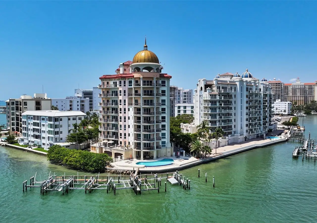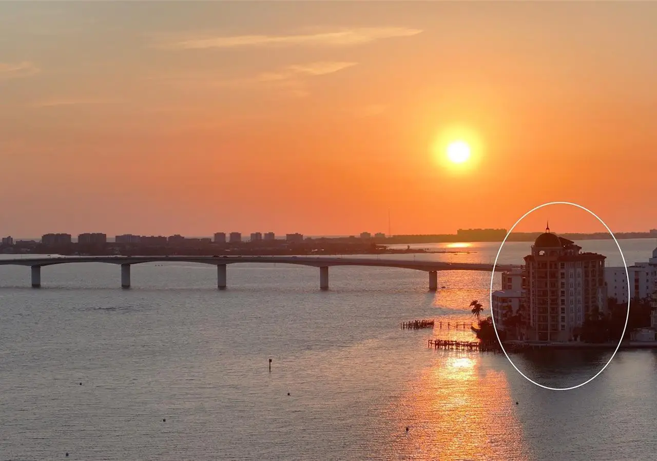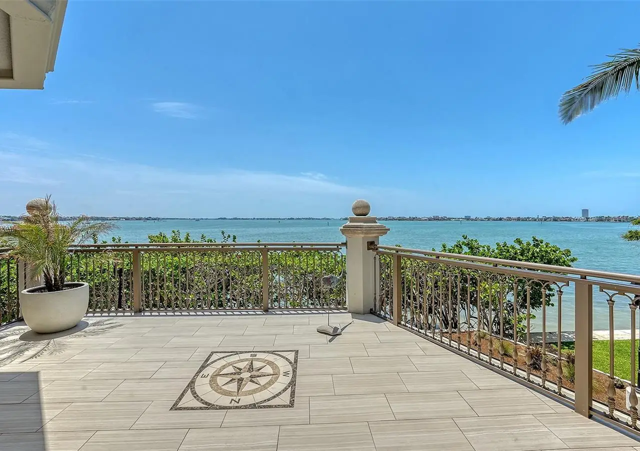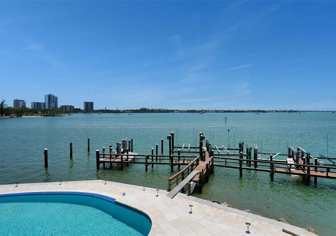 Experience the epitome of elegance and timeless sophistication in this exquisitely appointed residence at the exclusive Grande Riviera, a breathtaking architectural gem nestled in the prestigious Golden Gate Point neighborhood. Meticulously maintained, this classic condominium offers panoramic views of Sarasota Bay and the sparkling downtown skyline, setting a new standard for luxury waterfront living. This residence boasts the largest terrace in Grande Riviera, approximately 2300 square feet, providing the ultimate setting for sunsets and entertaining friends and family. One of only 13 exclusive residences, this home offers an intimate and private lifestyle, with a private elevator entrance leading directly to the elegant foyer. Designed for both comfort and grandeur, the residence features arched walkways, rich crown molding, and expansive living spaces ideal for entertaining or quiet reflection. The heart of the home is a remodeled chef’s kitchen, outfitted with a large center island, solid wood cabinetry adorned with sleek black hardware, a quartz backsplash, granite countertops, and a Sub-Zero refrigerator and freezer, as well as a Wolf gas range and double wall oven. Deluxe Laundry room with custom cabinetry and workspace conveniently located near the kitchen. A wet bar with a Sub-Zero wine fridge seamlessly connects the open living space to the elegant dining and living areas, creating a perfect flow for gatherings. Step outside onto the largest private wraparound terrace in the building, where you’ll enjoy breathtaking, unobstructed views of the bay. This is truly one of the most distinguished outdoor living spaces in the complex. The owners’ suite is a serene retreat, featuring dual walk-in closets with custom built-ins, and a spa-like bathroom with marble floors, a dual quartz vanity, walk-in shower with dual showerheads, and a private water closet. The suite also offers direct access to the terrace, allowing for peaceful mornings with stunning bay views. The guest suite boasts a private terrace entry, en suite bath, and walk-in closet, while a versatile den with double glass doors can serve as an office, sitting room, or additional guest space. Additional features include a private, deeded two-car garage with storage, resort-style pool, rooftop terrace, boat docks, on-site management, and private secured access. This is a rare opportunity to own a distinguished waterfront home in one of Sarasota’s most coveted locations, a residence that masterfully blends classic design, modern comforts, and breathtaking surroundings.