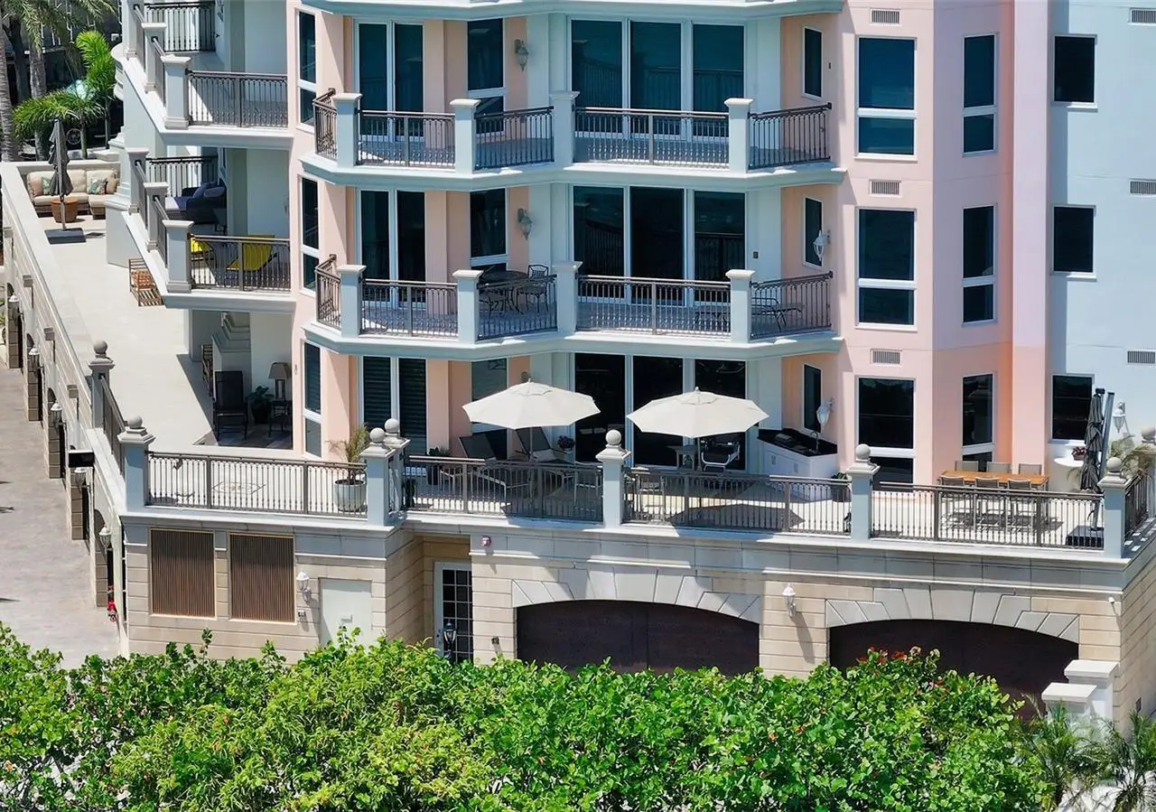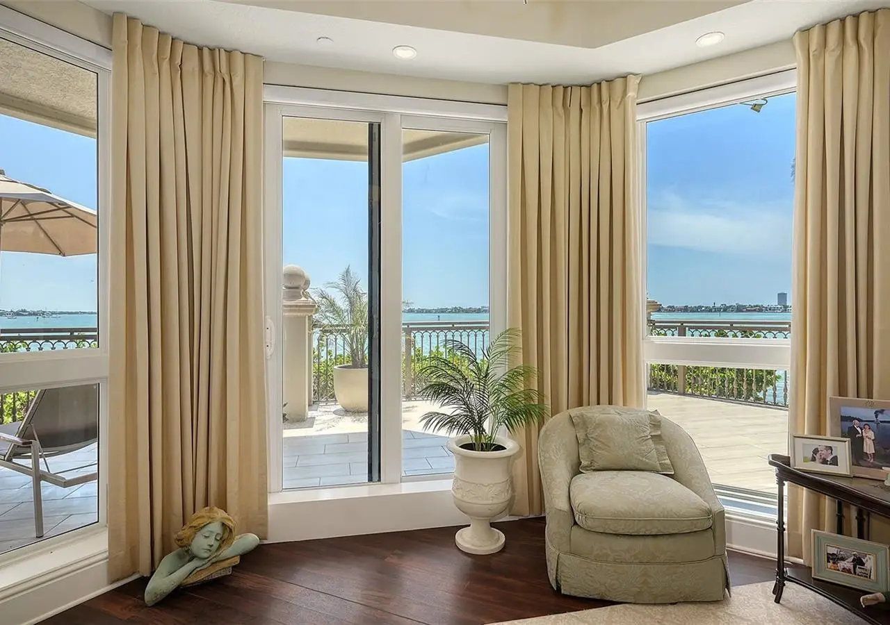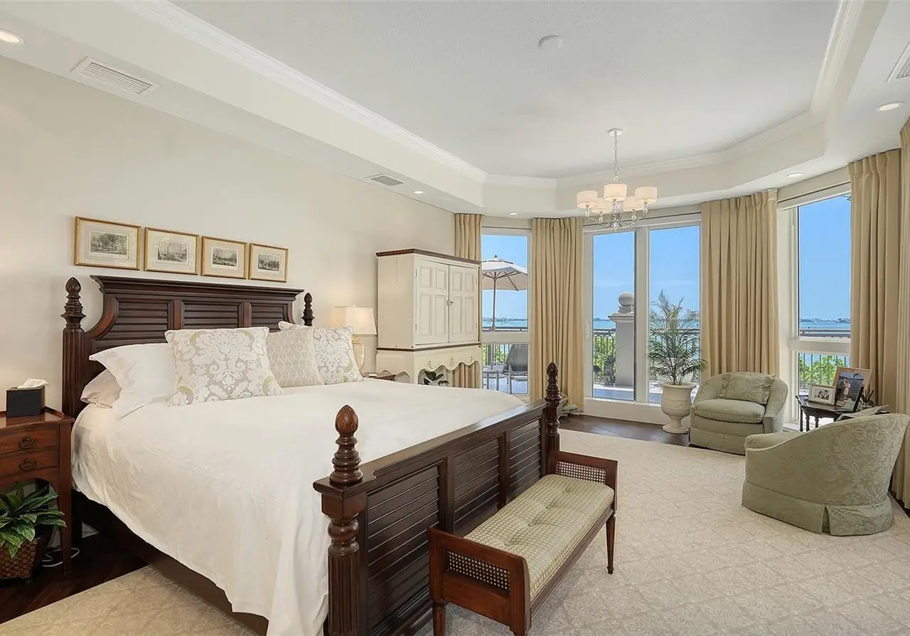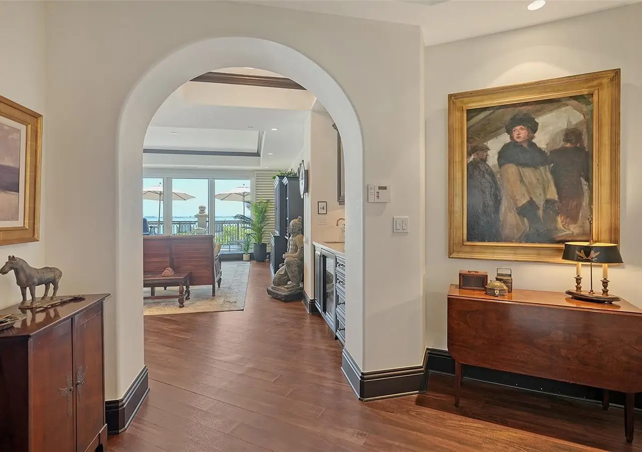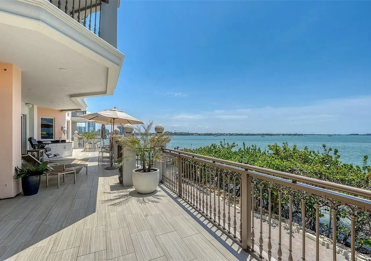 Experience the epitome of elegance and timeless sophistication in this exquisitely appointed residence at the exclusive Grande Riviera, a breathtaking architectural gem nestled in the prestigious Golden Gate Point neighborhood. Meticulously maintained, this classic condominium offers panoramic views of Sarasota Bay and the sparkling downtown skyline, setting a new standard for luxury waterfront living. This residence boasts the largest terrace in Grande Riviera, approximately 2300 square feet, providing the ultimate setting for sunsets and entertaining friends and family. One of only 13 exclusive residences, this home offers an intimate and private lifestyle, with a private elevator entrance leading directly to the elegant foyer. Designed for both comfort and grandeur, the residence features arched walkways, rich crown molding, and expansive living spaces ideal for entertaining or quiet reflection. The heart of the home is a remodeled chef’s kitchen, outfitted with a large center island, solid wood cabinetry adorned with sleek black hardware, a quartz backsplash, granite countertops, and a Sub-Zero refrigerator and freezer, as well as a Wolf gas range and double wall oven. Deluxe Laundry room with custom cabinetry and workspace conveniently located near the kitchen. A wet bar with a Sub-Zero wine fridge seamlessly connects the open living space to the elegant dining and living areas, creating a perfect flow for gatherings. Step outside onto the largest private wraparound terrace in the building, where you’ll enjoy breathtaking, unobstructed views of the bay. This is truly one of the most distinguished outdoor living spaces in the complex. The owners’ suite is a serene retreat, featuring dual walk-in closets with custom built-ins, and a spa-like bathroom with marble floors, a dual quartz vanity, walk-in shower with dual showerheads, and a private water closet. The suite also offers direct access to the terrace, allowing for peaceful mornings with stunning bay views. The guest suite boasts a private terrace entry, en suite bath, and walk-in closet, while a versatile den with double glass doors can serve as an office, sitting room, or additional guest space. Additional features include a private, deeded two-car garage with storage, resort-style pool, rooftop terrace, boat docks, on-site management, and private secured access. This is a rare opportunity to own a distinguished waterfront home in one of Sarasota’s most coveted locations, a residence that masterfully blends classic design, modern comforts, and breathtaking surroundings.