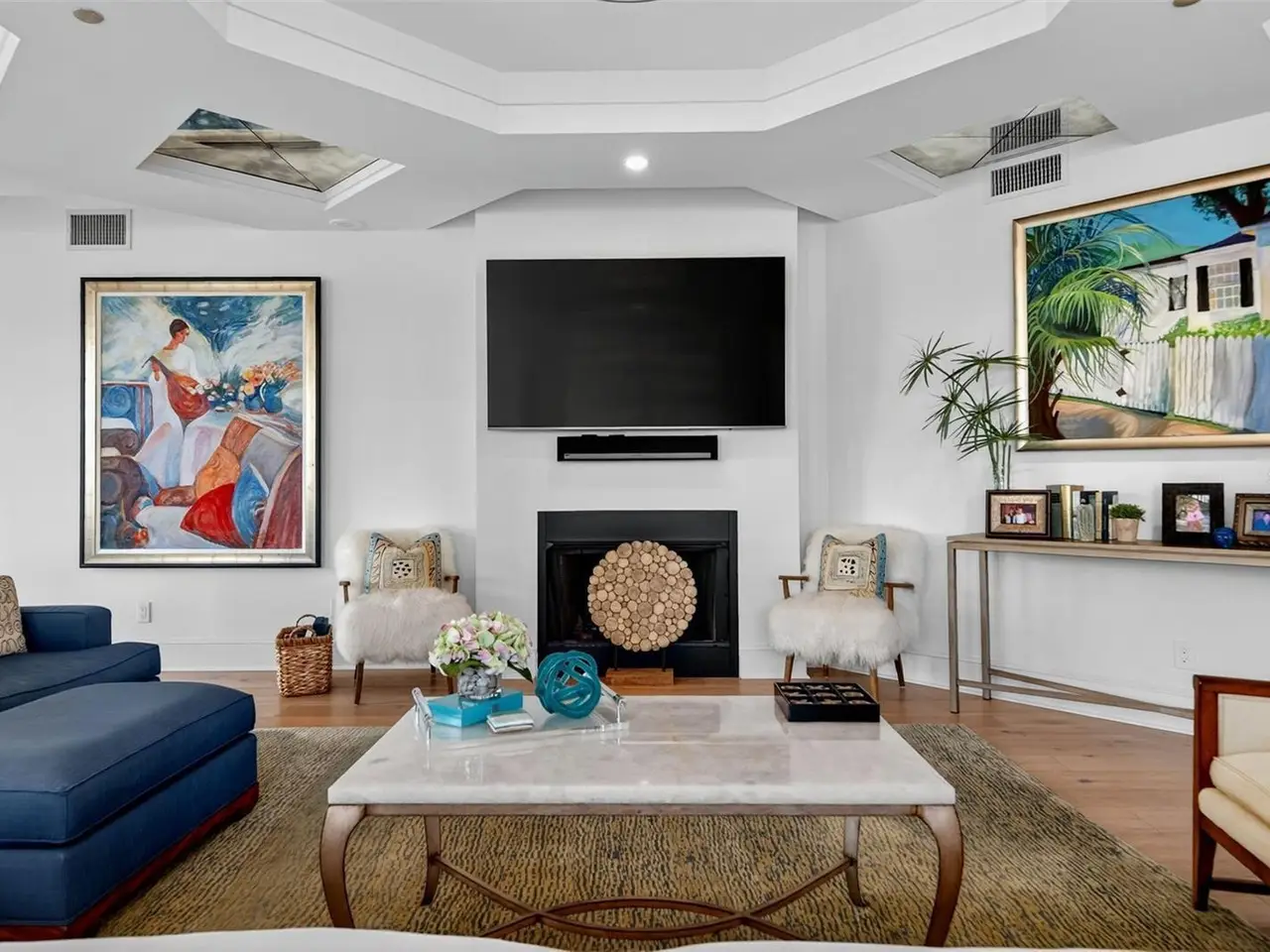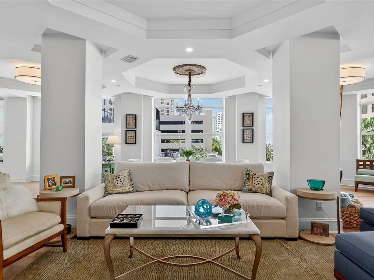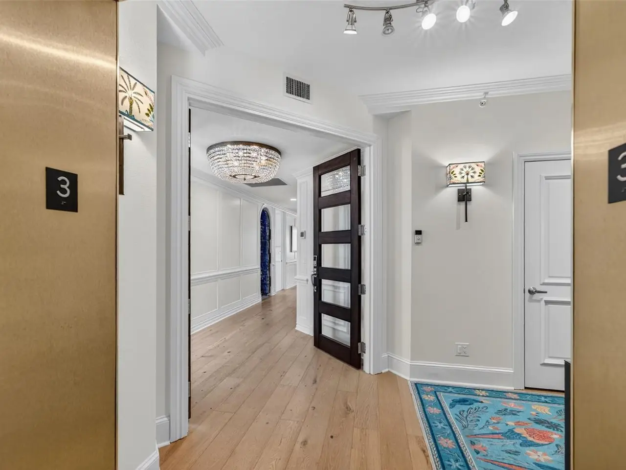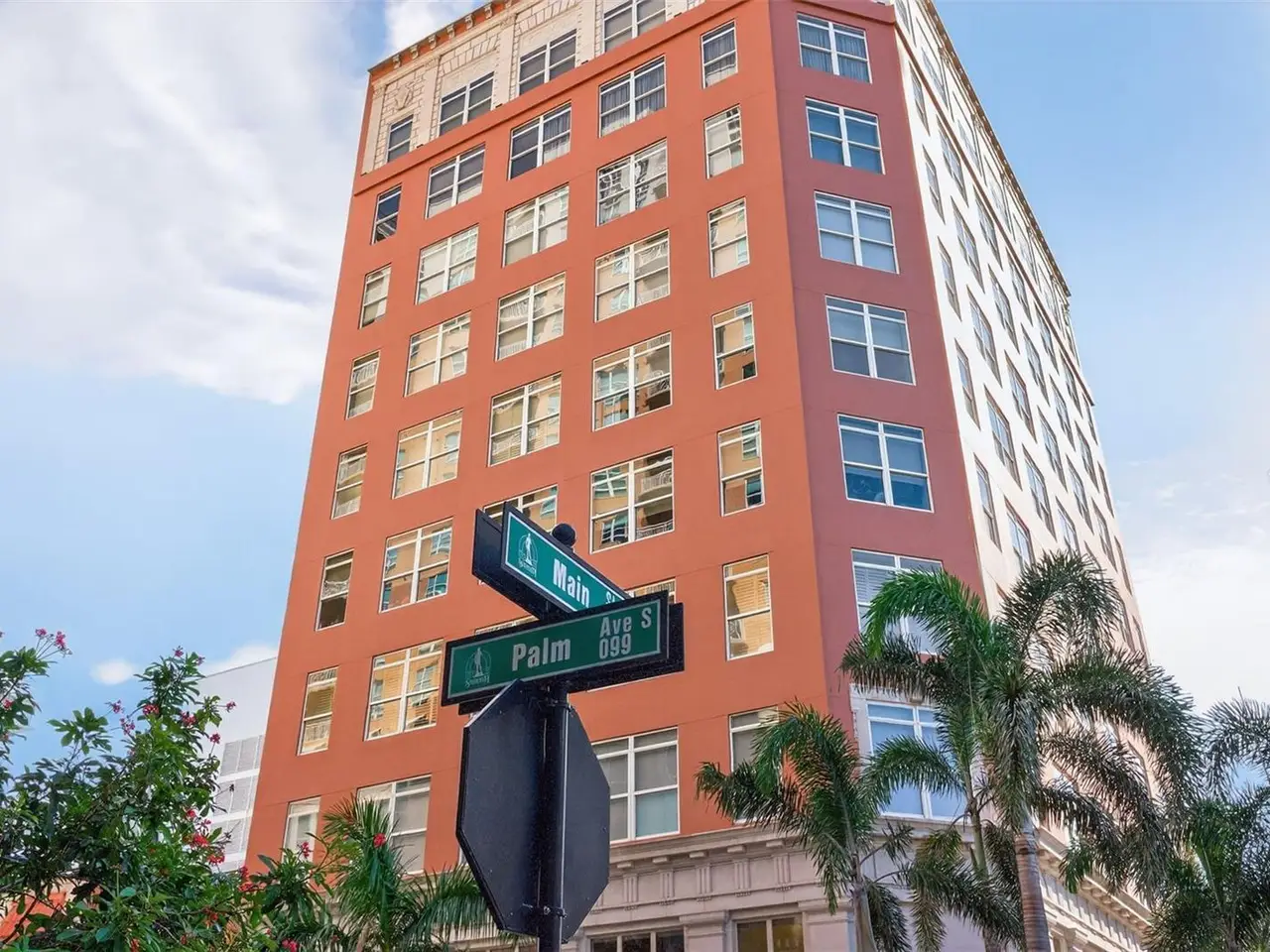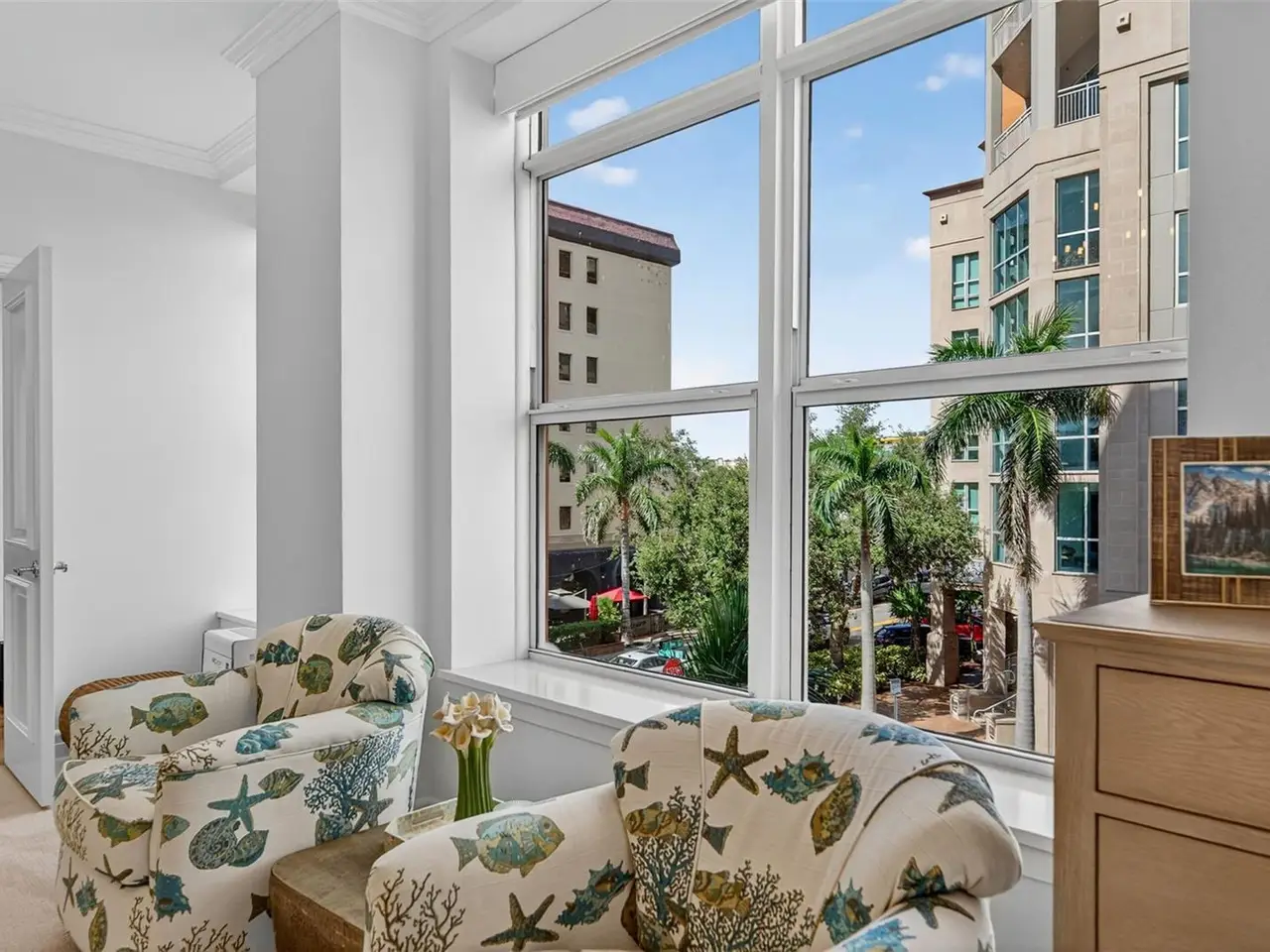 A luxurious piece of Sarasota’s history, combining timeless architecture, generous space, and modern upgrades in the heart of downtown. This rarely available full-floor residence at the iconic Orange Blossom Tower, built in 1926, one of downtown Sarasota’s most prestigious addresses at Main Street and Palm Avenue. Occupying the entire third floor, this 3-bedroom, 3-bath, 3,974-square-foot home offers a vibrant urban lifestyle just steps from fine dining, art galleries, boutiques, Bayfront Park, the marina, and Sarasota’s renowned theater district. From your private elevator, a grand foyer opens to a gallery hallway showcasing an antique brick wine cellar with a custom iron door, leading into expansive living and dining spaces adorned with bespoke millwork, a fireplace, octagonal ceiling detail, and oversized 7’ windows that flood the interiors with natural light. Two private terraces, including an oversized 13’ x 46’ retreat, to extend your living space outdoors for al fresco dining, and relaxation. The professionally enhanced kitchen is a chef’s dream, featuring quartz countertops, a Wolf 6-burner gas range, two Signature dishwashers, built-in refrigerator, beverage refrigerator, and a crystal chandelier over the center island. Condo features a water treatment system with reverse osmosis. Other recent updates include new AC units with infrared (2022 and 2023), new hot water heater (2024), new engineered wood flooring and carpet, a remodeled bath, new electrical outlets, electronic shades throughout, quartz window sills, and LED surface-mount fixtures and dimmers, The spacious owner’s suite offers large windows, 17’7” x 18’ antique-brick terrace overlooking tree-lined Palm Avenue, and an elegantly updated bath with dual vanities, walk-in shower, soaking tub, and custom closet system. Two guest suites are tucked into a private wing, each with a full bath and new custom closets—one opens directly to the expansive terrace—while a versatile large den makes an ideal office, reading room, or potential fourth bedroom with views of Sarasota Bay and stunning sunsets. Residents of Orange Blossom Tower enjoy concierge service, secure lobby entry, two deeded garage spaces, and use of the pool, spa, and fitness center at neighboring 1350 Main, along with additional storage room on the terrace and second floor. Importantly, the building’s Structural Integrity Reserve Study (SIRS) and Financial Reserve Study (FRS) were both completed in 2024, ensuring full compliance with current Florida regulations and giving buyers added peace of mind.