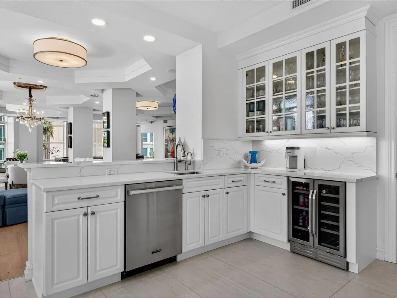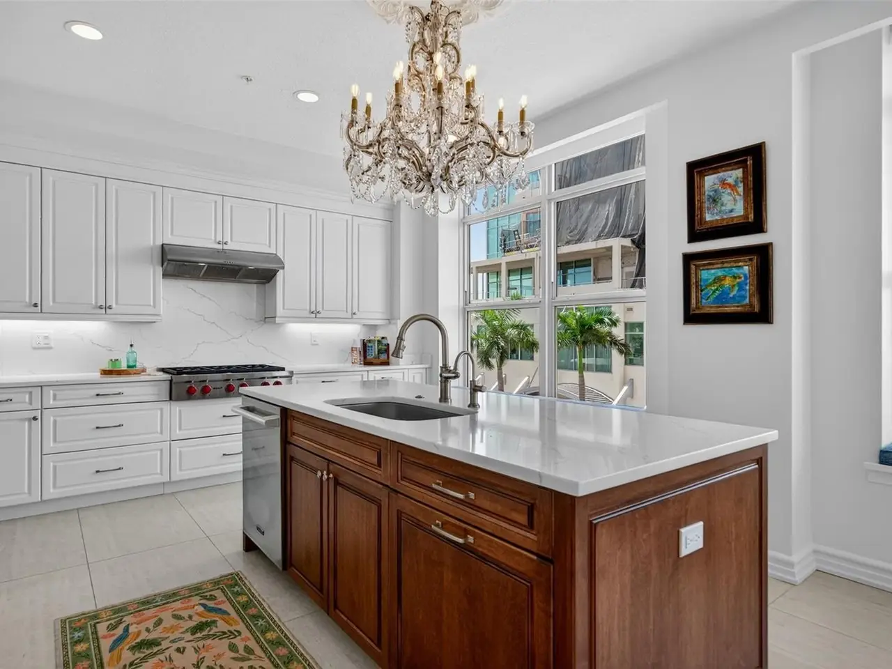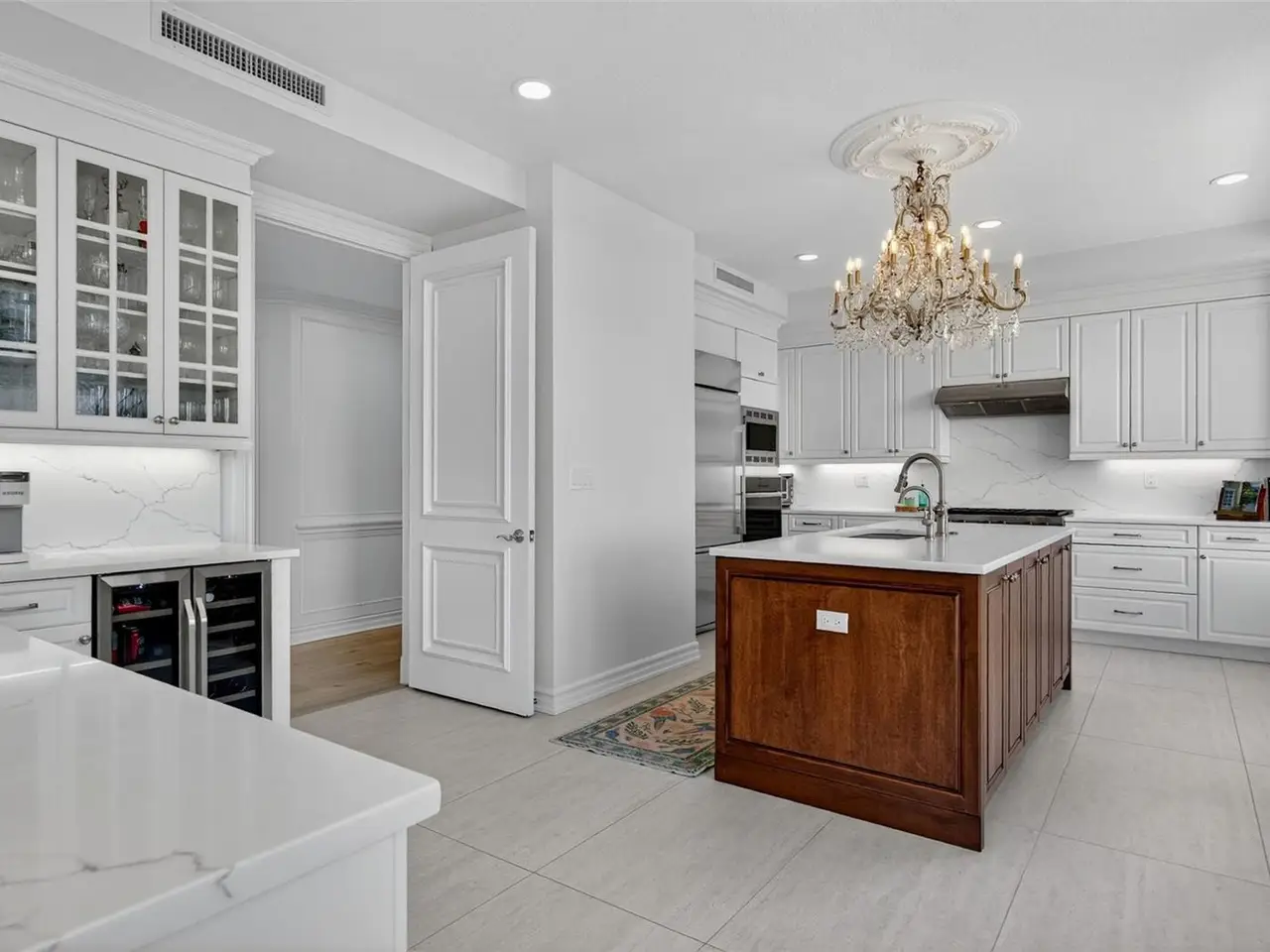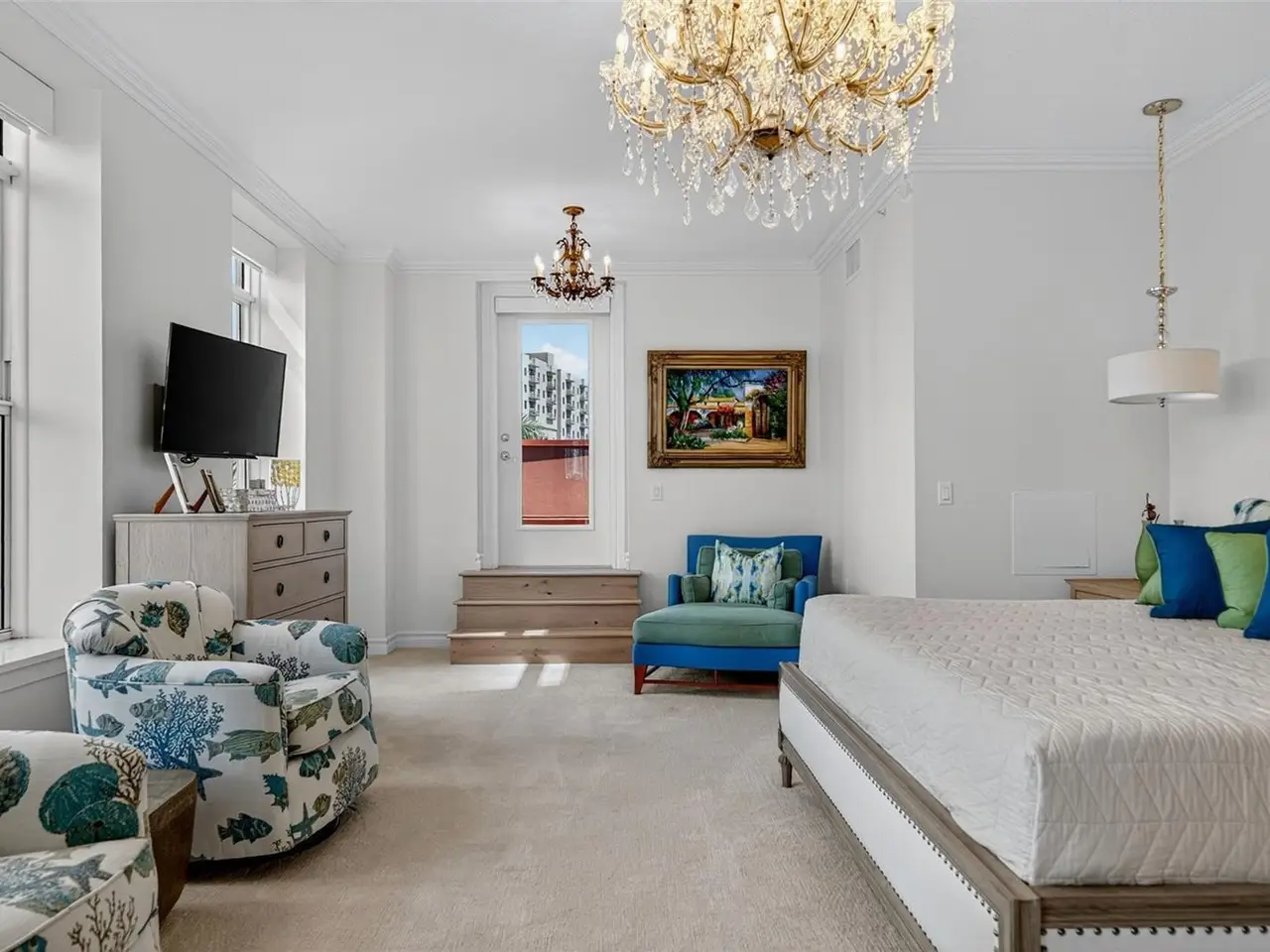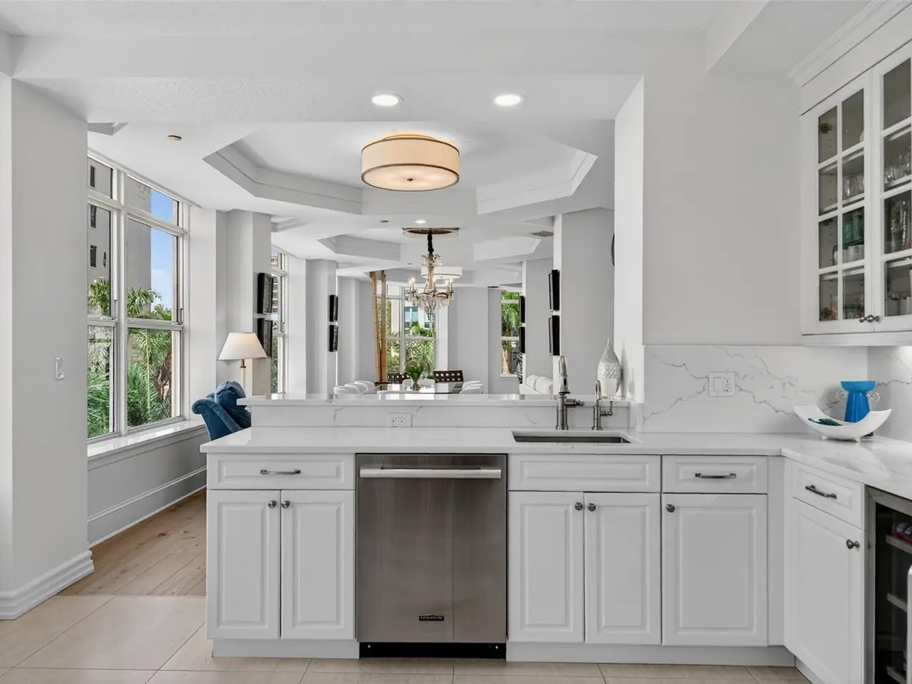 A luxurious piece of Sarasota’s history, combining timeless architecture, generous space, and modern upgrades in the heart of downtown. This rarely available full-floor residence at the iconic Orange Blossom Tower, built in 1926, one of downtown Sarasota’s most prestigious addresses at Main Street and Palm Avenue. Occupying the entire third floor, this 3-bedroom, 3-bath, 3,974-square-foot home offers a vibrant urban lifestyle just steps from fine dining, art galleries, boutiques, Bayfront Park, the marina, and Sarasota’s renowned theater district. From your private elevator, a grand foyer opens to a gallery hallway showcasing an antique brick wine cellar with a custom iron door, leading into expansive living and dining spaces adorned with bespoke millwork, a fireplace, octagonal ceiling detail, and oversized 7’ windows that flood the interiors with natural light. Two private terraces, including an oversized 13’ x 46’ retreat, to extend your living space outdoors for al fresco dining, and relaxation. The professionally enhanced kitchen is a chef’s dream, featuring quartz countertops, a Wolf 6-burner gas range, two Signature dishwashers, built-in refrigerator, beverage refrigerator, and a crystal chandelier over the center island. Condo features a water treatment system with reverse osmosis. Other recent updates include new AC units with infrared (2022 and 2023), new hot water heater (2024), new engineered wood flooring and carpet, a remodeled bath, new electrical outlets, electronic shades throughout, quartz window sills, and LED surface-mount fixtures and dimmers, The spacious owner’s suite offers large windows, 17’7” x 18’ antique-brick terrace overlooking tree-lined Palm Avenue, and an elegantly updated bath with dual vanities, walk-in shower, soaking tub, and custom closet system. Two guest suites are tucked into a private wing, each with a full bath and new custom closets—one opens directly to the expansive terrace—while a versatile large den makes an ideal office, reading room, or potential fourth bedroom with views of Sarasota Bay and stunning sunsets. Residents of Orange Blossom Tower enjoy concierge service, secure lobby entry, two deeded garage spaces, and use of the pool, spa, and fitness center at neighboring 1350 Main, along with additional storage room on the terrace and second floor. Importantly, the building’s Structural Integrity Reserve Study (SIRS) and Financial Reserve Study (FRS) were both completed in 2024, ensuring full compliance with current Florida regulations and giving buyers added peace of mind.