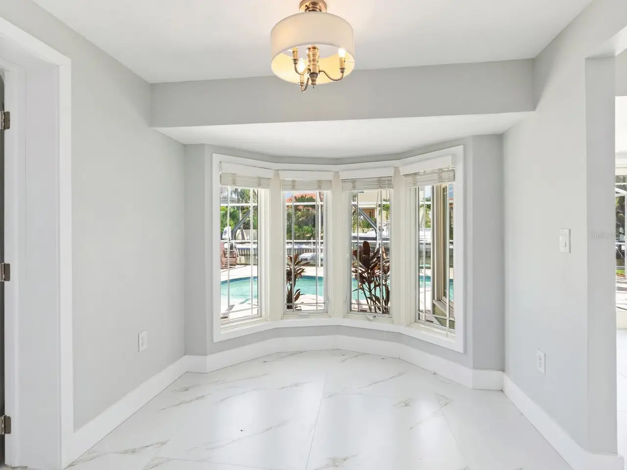 Pool, covered lanai, and expansive canal views