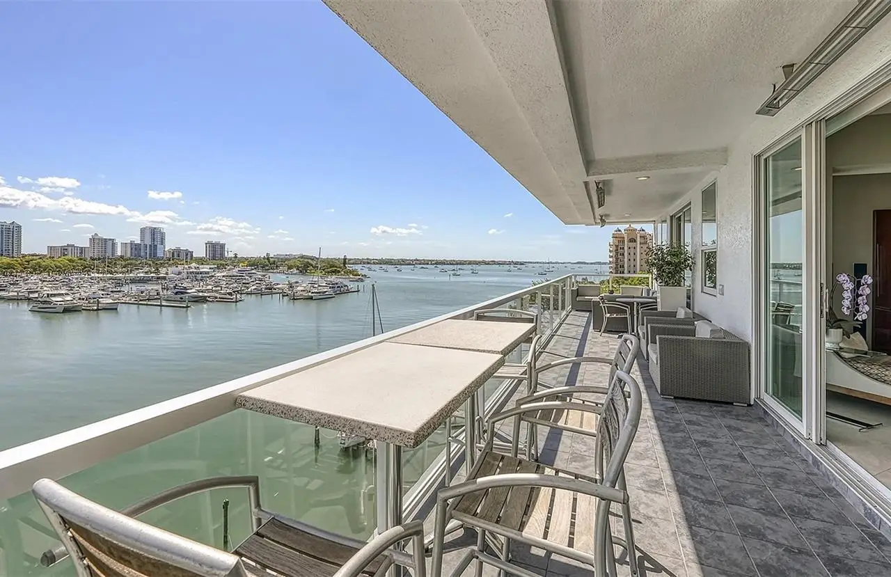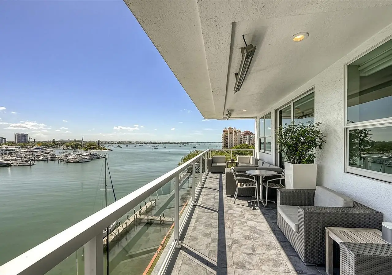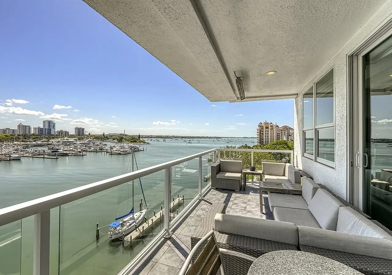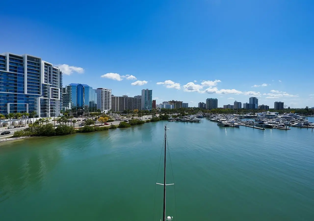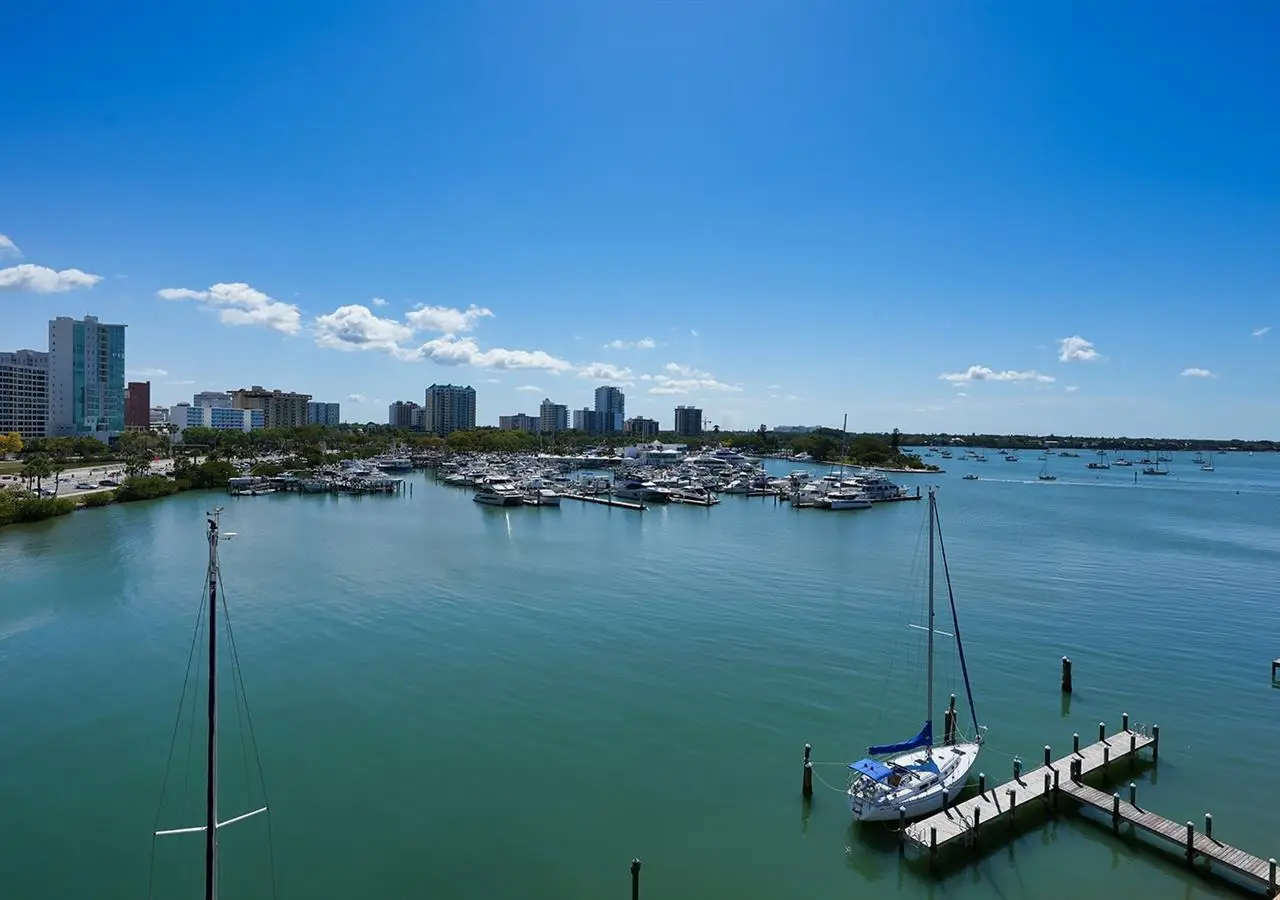 Luxury Waterfront Penthouse in Golden Gate Point. This exceptional penthouse in an exclusive 14-unit boutique building offers breathtaking panoramic views of Sarasota Bay, the city skyline, and Marina Jack. Occupying half of the top floor, this meticulously designed three-bedroom, three-bathroom residence features a spacious split floor plan with an open-concept layout ideal for privacy and entertaining. The chef's kitchen includes top-of-the-line appliances, imported finishes, and a wet bar, while the master suite offers a private wet bar, spa-inspired bath, and stunning views. Turnkey with high-end Italian furnishings and artwork (with few exceptions), the home also features a 52-foot heated balcony for prime waterfront relaxation. A rare assigned 40-foot boat slip provides direct access to Sarasota Bay and the Gulf. Harbor View was redeveloped to Florida?s enhanced building codes in 2006-07, with $1.5M in updates in 2018 and a new seawall, docks, and renovated pool/patio in 2022. Gated entry, security cameras, and two covered parking spaces add convenience. Just four blocks from downtown Sarasota and a short bike ride over the Ringling Bridge to Lido Beach and St. Armands Circle, this exclusive penthouse offers luxury waterfront living at its finest. Schedule your private showing today!