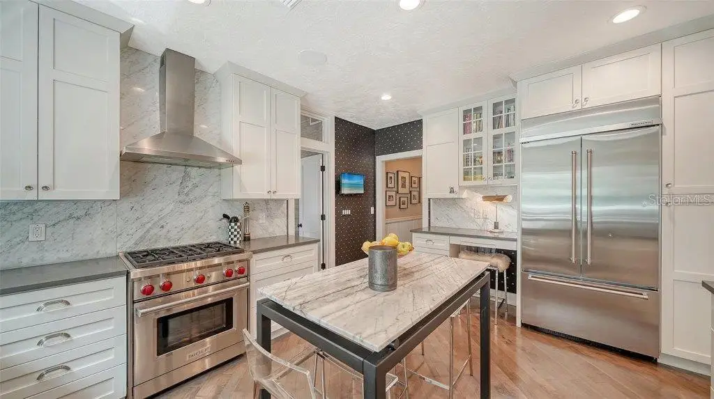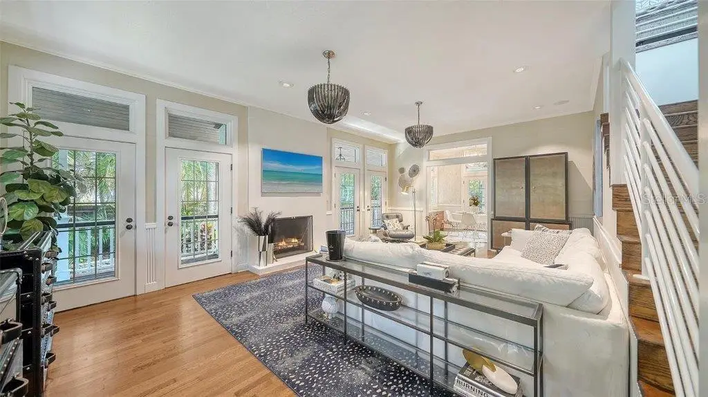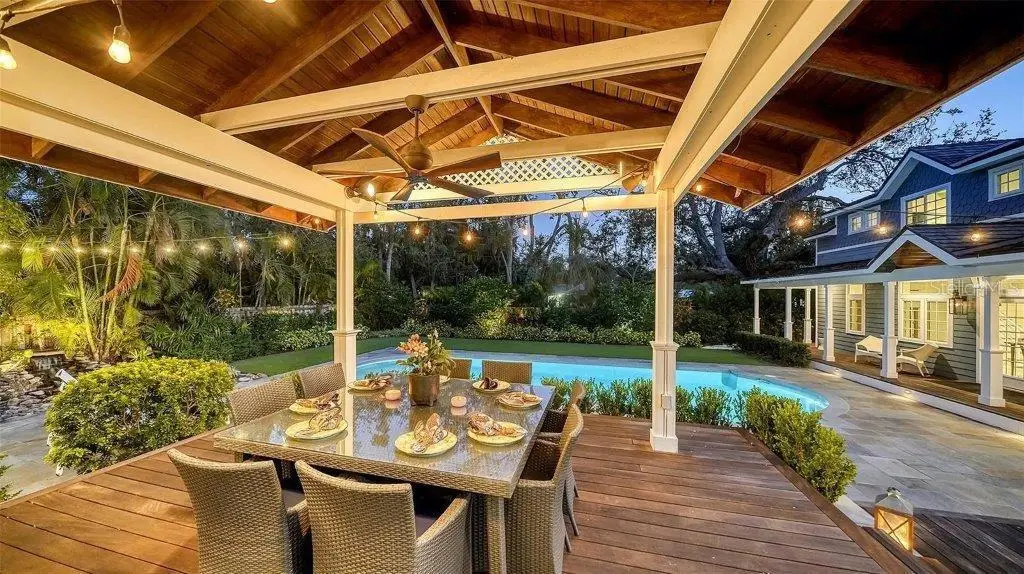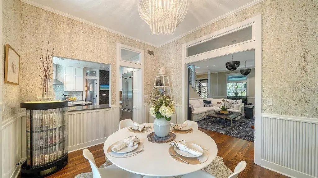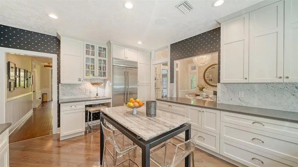 Welcome to this rarely available Cape Cod–style residence, comprised of a masterfully renovated main house and separate luxe guest house poised on an expansive 20,000 sq. ft. lot in Sarasota’s prestigious Cherokee Park. Elevated 23 feet above sea level and nestled on a wide, tree-lined street in the coveted West of Trail district—within the top-rated Southside school zone—this 4-bedroom, 3 full/2 half bath +office private compound blends timeless architecture with designer-curated sophistication. A stately front porch framed by lush landscaping and classic brick walkway introduces the home with understated grandeur. Handcrafted, glass-inlaid iron double doors open to a refined foyer where natural light, elegant millwork, and soaring 10-foot ceilings set the tone for the bespoke interiors beyond. Inside, original hardwood floors, designer lighting by Arteriors, Eichholtz, and Kelly Wearstler, and high-end finishes selected by Chelsea Dunbar of Blu Interiors create a sense of warmth and refinement throughout. The quartz-clad chef’s kitchen is as functional as it is beautiful, featuring a Wolf natural gas range, KitchenAid French-door refrigerator, ample pantry space, and custom cabinetry—perfectly suited for both intimate dining and entertaining. Anchored by a wood-burning fireplace, the main living and dining spaces flow seamlessly outdoors to an inviting Pennsylvania bluestone patio, low-maintenance Astroturf lawn, and wrap-around Brazilian teak deck—an idyllic setting for year-round enjoyment. The serene first floor primary suite is a private retreat showcasing three custom-designed walk-in closets and a spa-inspired bath with marble finishes, dual vanities, heated towel bar, and a zero-entry shower with body sprays. Ascend the custom staircase to find 2 tailored guest retreats with spa-like bath, each offering serene views and thoughtfully appointed details for ultimate comfort and privacy. Throughout the home, custom wallcoverings by Phillip Jeffries, Scalamandré, and Élitis add layers of texture and artistry, while upgraded systems—including a surround sound system, six climate zones, and multiple laundry areas—enhance everyday comfort. Resort-style living continues outdoors with a 9-foot-deep pool framed by classic Bevolo gas lanterns and an extraordinary luxury guest house built in 2016. This refined space includes an entertaining area with custom built-ins, full bar, refrigerator drawers, Scotsman icemaker, private guest suite, 1.5 baths, gym, and an outdoor teak shower. The fully equipped outdoor kitchen features a natural gas Lynx grill, XL Green Egg, quartzite prep counters, and a covered gazebo ideal for al fresco dining. All impact doors and windows, cedar shake roof, and Hardie Board siding add to the beauty and durability of the home. Completing this exceptional estate is an oversized 2.5-car detached garage and secure, fully fenced grounds with electric fence. Enjoy tree-lined streets with sidewalks and a true sense of community, all just a short stroll or golf cart ride to Southside Village where residents enjoy boutique shops, Morton’s Gourmet Market, cafés, and top-rated restaurants, and minutes from downtown Sarasota and Siesta Key Beach. This is refined Gulf Coast living—where timeless architecture meets effortless luxury in one of Sarasota’s most treasured neighborhoods.