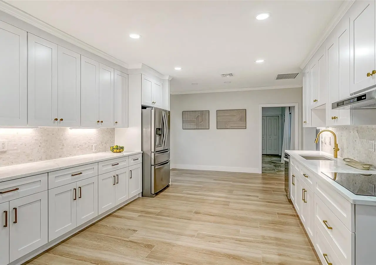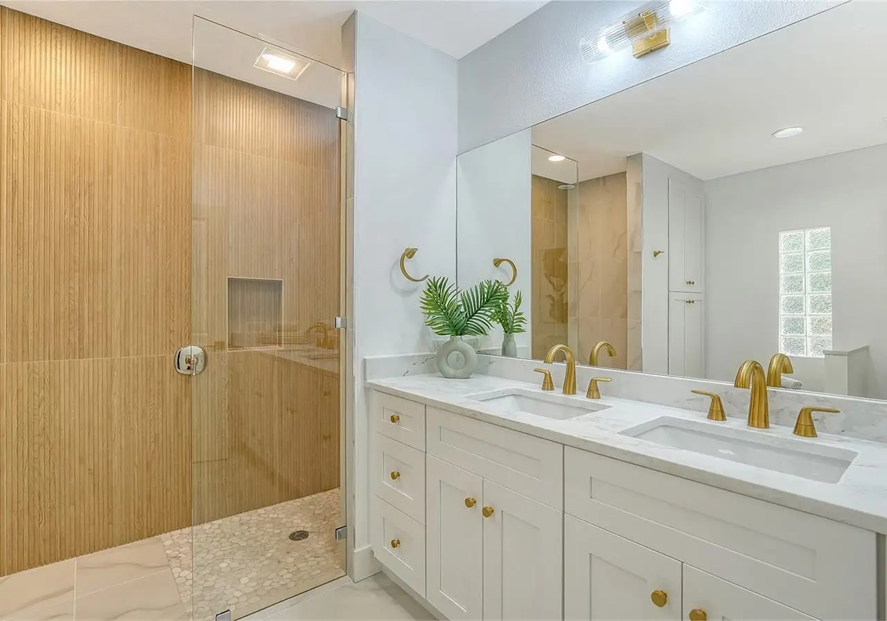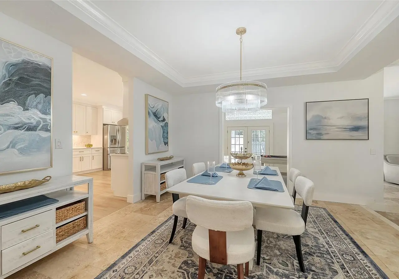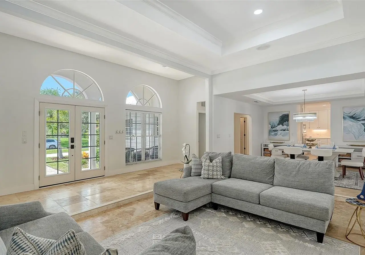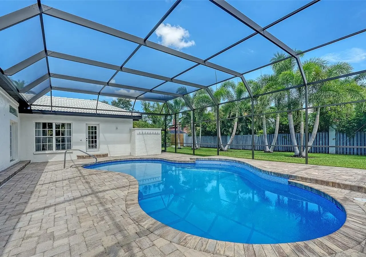 Tucked within the prestigious, gated enclave of Beneva Oaks, where centuries-old live oaks line meandering streets, this masterfully renovated home on a ½ acre lot offers incredible 2025 updates and a wonderful 4-bedroom, 3.5-bath, 1-story floor plan providing both grandeur and comfort across the expansive space. A circular drive framed by lush landscaping leads to the elegant entry of this modern residence, where refined upgrades blend seamlessly with timeless architectural features. Inside, travertine floors flow through the main living areas, while new designer carpet enhances the comfort of the bedrooms. The heart of the home is the extraordinary new eat-in kitchen featuring gleaming quartz countertops, crisp white wood cabinetry, stainless appliances including an induction cooktop, wide plank porcelain tile floor, and a custom tile backsplash. Accents like gold hardware, designer lighting, crown molding, and wide baseboards add the feel of luxury, while four sets of French doors connect the interior seamlessly with the lush exterior surroundings. An elegant dual-sided wood-burning fireplace with brick and tile surround and quartz and travertine hearths anchors the living and sitting areas, creating inviting spaces for conversation or quiet moments. With multiple entertaining areas designed for both intimate gatherings, grand-scale events or even a game of pool, the home's layout flows effortlessly from indoors to the screened lanai with paver deck, where a heated pool enhanced by Iconic Pools with sparkling new glass tile surface invites year-round enjoyment. The spacious primary suite, is a sanctuary unto itself, offering three walk-in closets with custom closet systems, and an extraordinary spa-inspired bath with bespoke tile work, frameless glass shower, gold fixtures, and a quartz-topped dual-sink vanity that exudes luxury. Two additional guest bedrooms enjoy new carpet, large closets, and generous natural light, while the newly redesigned guest bath impresses with design-forward flooring, quartz dual-sink vanity, and clean, modern finishes. The 4th bedroom can also be used as in-law suite, enjoying its own private French door entry and full bath with walk-in shower. The office with a custom built-in loft, closet, and a front facing window is ideal as a workspace, study, play, or creative escape. A chic updated powder bath adds further convenience. The thoughtfully designed laundry room features quartz countertops, utility sink, abundant cabinetry, and front-load GE Whirlpool washer/dryer. The oversized 2-car garage and beautifully landscaped grounds complete this exceptional property in one of Sarasota's most serene and sought-after neighborhoods. Located in a top rated school district, X flood zone and within close proximity to Sarasota's dining, shopping, culture, and the pristine Gulf of Mexico beaches, this exceptional property offers an unparalleled combination of design and craftsmanship in one of Sarasota's best-kept secret neighborhoods, presenting a rare opportunity to experience refined Florida living at its finest!