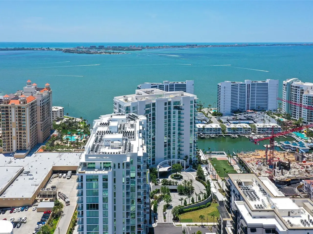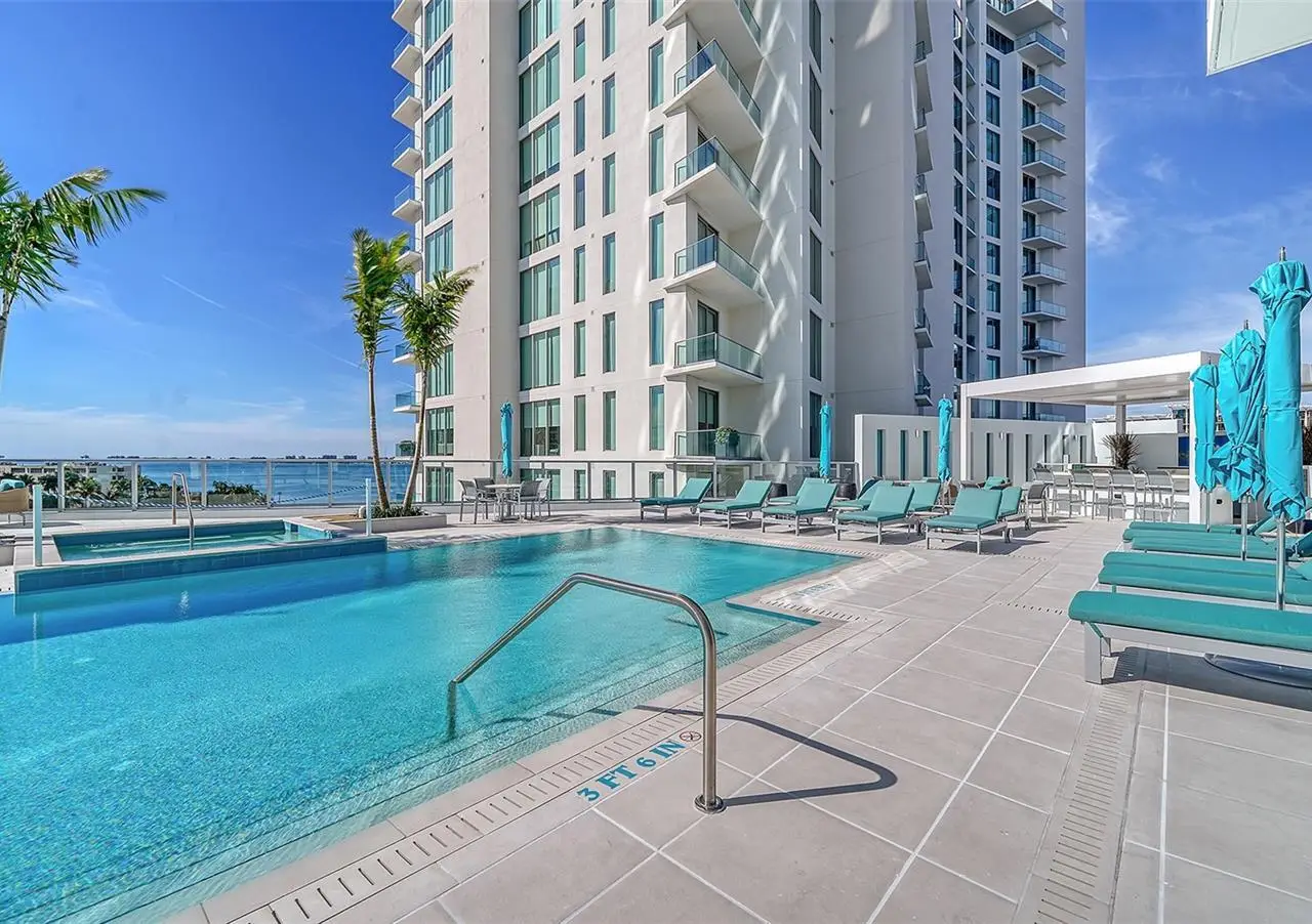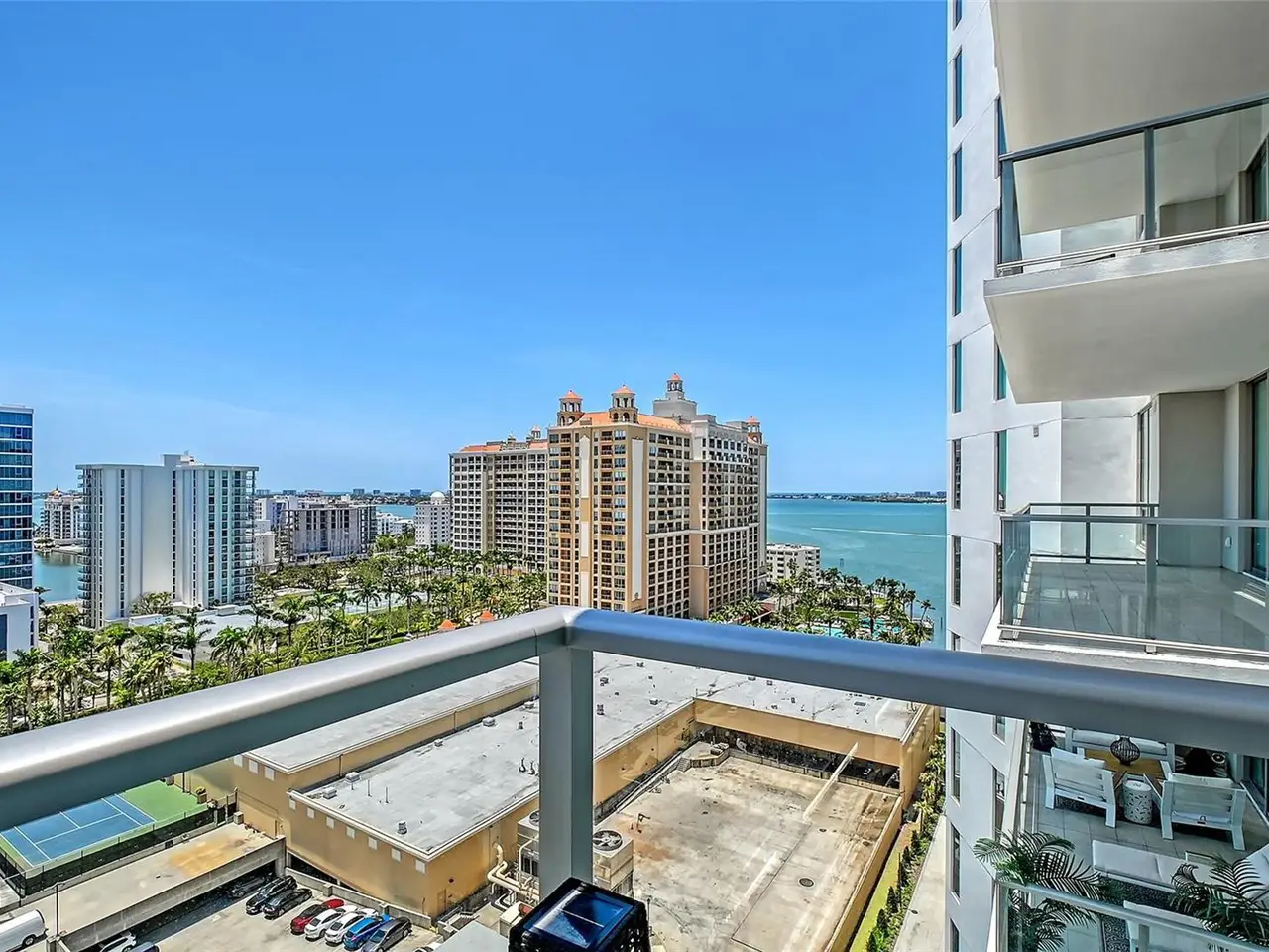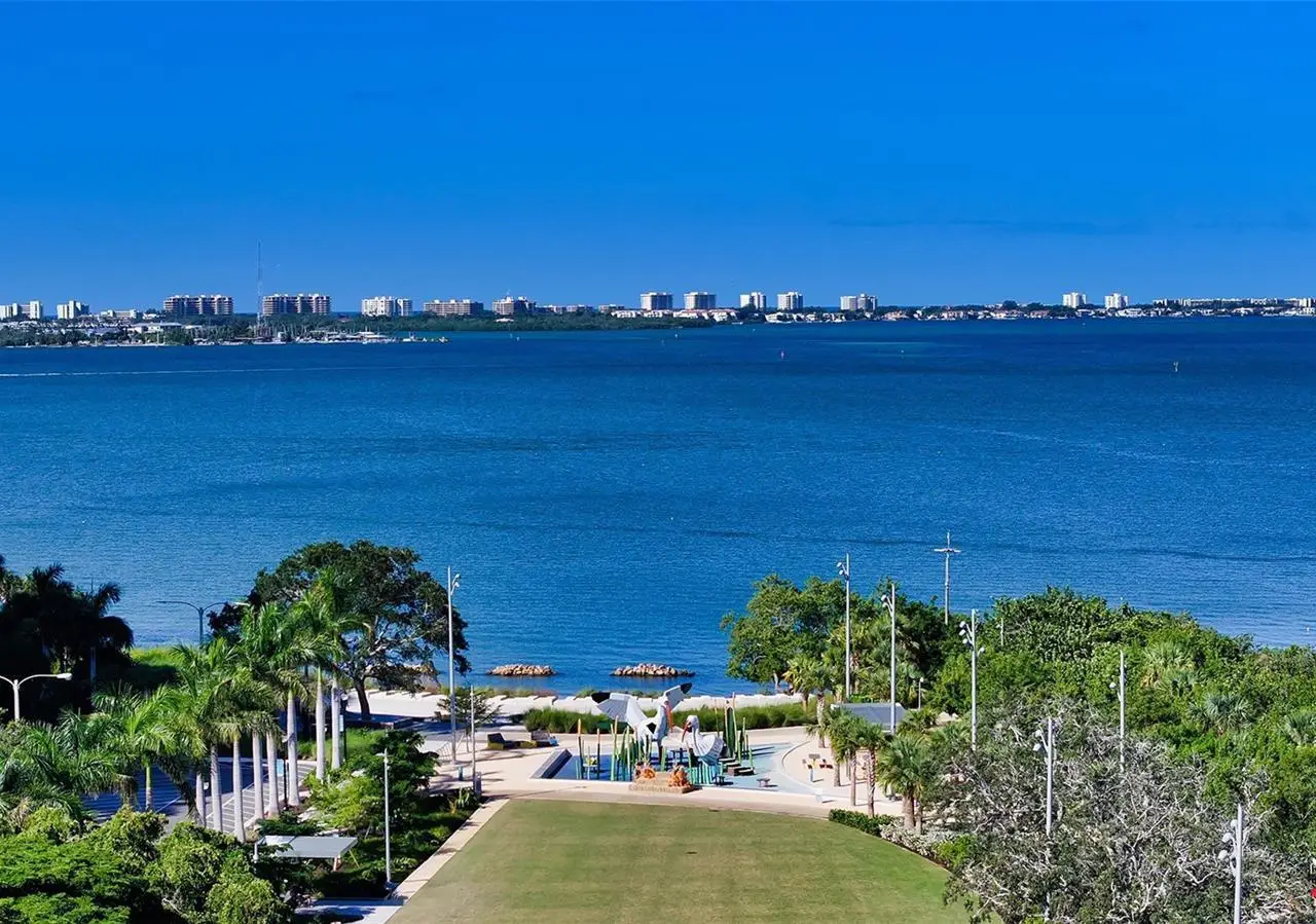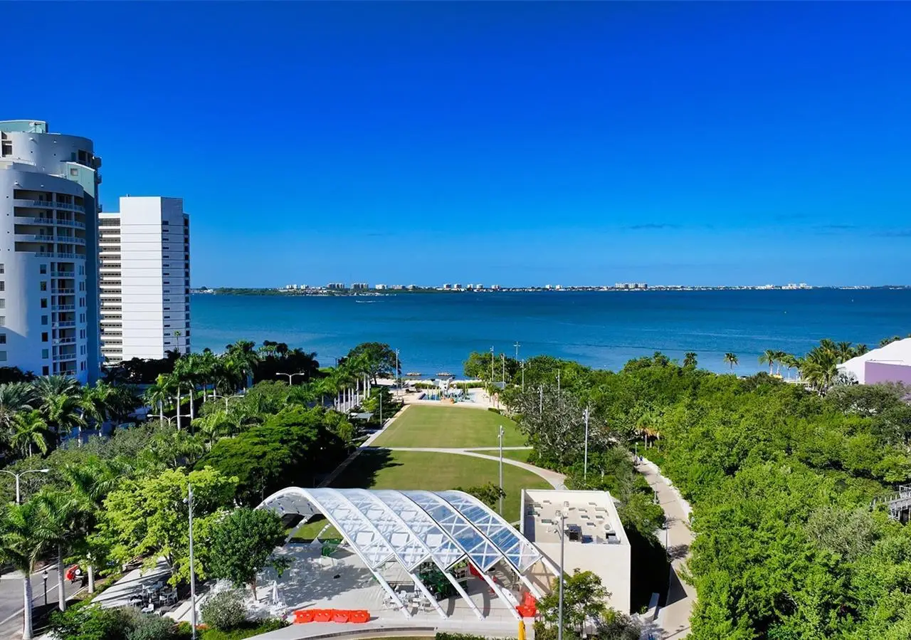 Prepare to be captivated by this absolutely stunning,12th-floor residence at Bayso, Sarasota’s most sought-after luxury tower at The Quay. With postcard worthy southern views of Sarasota Bay and the sparkling downtown skyline from every room, this extraordinary 2-bedroom plus den, 2.5-bath home offers nearly 1,600 square feet of refined sophistication and comfort. The moment you step inside, you’re greeted by a flood of natural light pouring through floor-to-ceiling glass, immediately drawing your eye to panoramic views that stretch endlessly across the bay and city. The elevated 20+ foot above sea level lobby sets the tone for the elegance that awaits above. Soaring 10-foot ceilings, porcelain tile flooring, and tastefully upgraded designer light fixtures throughout the home create a sleek and luxurious atmosphere. The spacious great room and dining area are the heart of the home; perfectly suited for entertaining, relaxing, or simply soaking in the view with your morning coffee or evening glass of wine. This is where everyday living transforms into something exceptional. Step outside to your oversized private terrace with glass railings and indulge in the beauty of Sarasota’s ever-changing skyline. The kitchen is a true showpiece, featuring European-inspired Italkraft cabinetry, glistening quartz countertops, a large center island with rollout drawers, premium Jenn-Air stainless steel appliances including an induction cooktop and double oven; making it ideal for both the everyday chef and the culinary enthusiast. The owner’s suite is a tranquil retreat, offering a spacious walk-in closet with custom built-ins and a spa-like bath complete with Grohe fixtures, double vanity with Robern recessed medicine cabinets, a separate water closet, and a glass-enclosed walk-in shower. The guest suite enjoys its own spectacular views, generous closet space, and a beautifully designed en-suite bath. A versatile den is outfitted with a custom wall unit with a queen-size Murphy bed, offering flexibility as a third bedroom, office, or private media space. A stylish powder room and an oversized utility room with full-size washer and dryer and abundant storage complete this perfectly designed residence. Bayso offers an unmatched array of resort-style amenities. Residents enjoy a 24/7 attended lobby, on-site management, and access-controlled security. The fifth floor is your personal oasis; featuring an elevated pool and spa deck over 60 feet above sea level, outdoor entertainment lounges, kitchen and grilling areas, the serene Splash Lounge, a state-of-the-art fitness center, movement studio, and a private dog park. There's even a formal club room with catering kitchen, co-working spaces, a boardroom for business meetings, secured Wi-Fi throughout all amenity spaces, and a mail room with package storage. The residence includes a premium assigned parking space in the private garage, climate-controlled storage, and there is also separate bicycle storage for the residents. All of this just steps from Sarasota’s thriving arts scene, award-winning dining, boutique shopping, and cultural venues; with the white sands of Lido Key, Longboat Key, and Siesta Key just minutes away. Whether you're seeking an elegant year-round home, a chic pied-à -terre, or a lock-and-leave retreat in one of Florida’s most desirable cities, this residence is your invitation to live the dream. Schedule your private tour today and experience the very best of luxury living at Bayso.