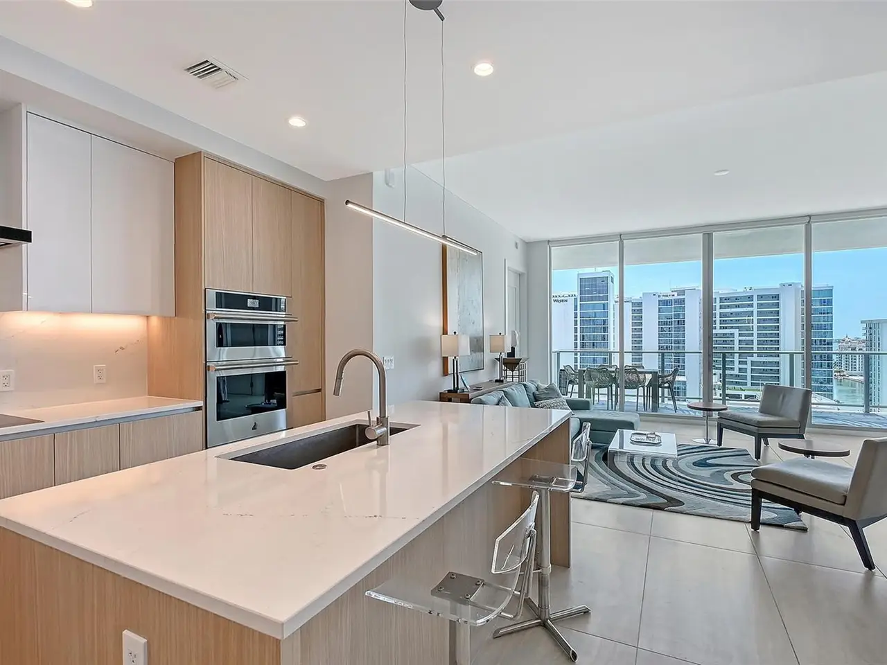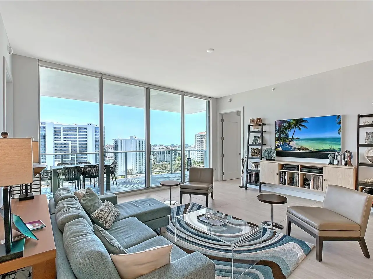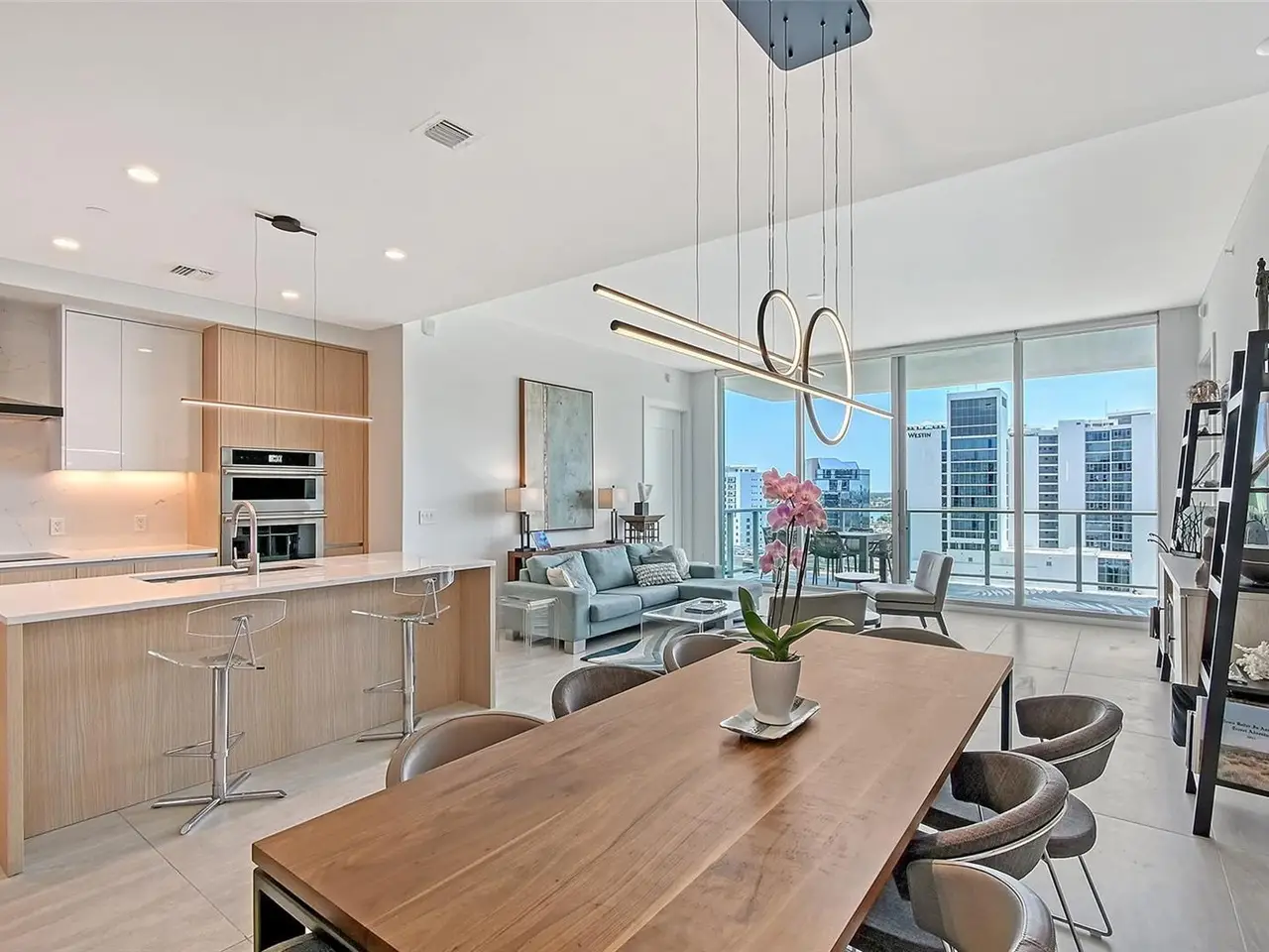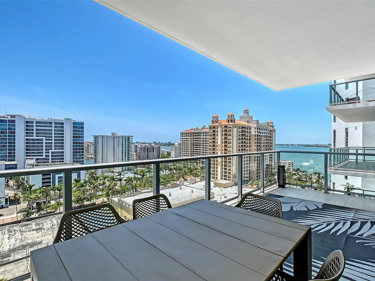 Prepare to be captivated by this absolutely stunning,12th-floor residence at Bayso, Sarasota’s most sought-after luxury tower at The Quay. With postcard worthy southern views of Sarasota Bay and the sparkling downtown skyline from every room, this extraordinary 2-bedroom plus den, 2.5-bath home offers nearly 1,600 square feet of refined sophistication and comfort. The moment you step inside, you’re greeted by a flood of natural light pouring through floor-to-ceiling glass, immediately drawing your eye to panoramic views that stretch endlessly across the bay and city. The elevated 20+ foot above sea level lobby sets the tone for the elegance that awaits above. Soaring 10-foot ceilings, porcelain tile flooring, and tastefully upgraded designer light fixtures throughout the home create a sleek and luxurious atmosphere. The spacious great room and dining area are the heart of the home; perfectly suited for entertaining, relaxing, or simply soaking in the view with your morning coffee or evening glass of wine. This is where everyday living transforms into something exceptional. Step outside to your oversized private terrace with glass railings and indulge in the beauty of Sarasota’s ever-changing skyline. The kitchen is a true showpiece, featuring European-inspired Italkraft cabinetry, glistening quartz countertops, a large center island with rollout drawers, premium Jenn-Air stainless steel appliances including an induction cooktop and double oven; making it ideal for both the everyday chef and the culinary enthusiast. The owner’s suite is a tranquil retreat, offering a spacious walk-in closet with custom built-ins and a spa-like bath complete with Grohe fixtures, double vanity with Robern recessed medicine cabinets, a separate water closet, and a glass-enclosed walk-in shower. The guest suite enjoys its own spectacular views, generous closet space, and a beautifully designed en-suite bath. A versatile den is outfitted with a custom wall unit with a queen-size Murphy bed, offering flexibility as a third bedroom, office, or private media space. A stylish powder room and an oversized utility room with full-size washer and dryer and abundant storage complete this perfectly designed residence. Bayso offers an unmatched array of resort-style amenities. Residents enjoy a 24/7 attended lobby, on-site management, and access-controlled security. The fifth floor is your personal oasis; featuring an elevated pool and spa deck over 60 feet above sea level, outdoor entertainment lounges, kitchen and grilling areas, the serene Splash Lounge, a state-of-the-art fitness center, movement studio, and a private dog park. There's even a formal club room with catering kitchen, co-working spaces, a boardroom for business meetings, secured Wi-Fi throughout all amenity spaces, and a mail room with package storage. The residence includes a premium assigned parking space in the private garage, climate-controlled storage, and there is also separate bicycle storage for the residents. All of this just steps from Sarasota’s thriving arts scene, award-winning dining, boutique shopping, and cultural venues; with the white sands of Lido Key, Longboat Key, and Siesta Key just minutes away. Whether you're seeking an elegant year-round home, a chic pied-à -terre, or a lock-and-leave retreat in one of Florida’s most desirable cities, this residence is your invitation to live the dream. Schedule your private tour today and experience the very best of luxury living at Bayso.