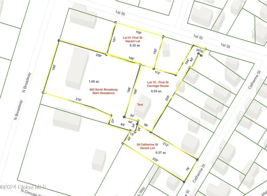 An exceptional opportunity for astute Buyers on North Broadway in Saratoga Springs; a sprawling 2.28-acre property hosting two homes mere steps away from downtown. Comprised of four parcels - the Main House, a Carriage House on L72 First St (165.36-72), a vacant lot on L61 First St (165.36-2-61), and 59 Catherine St (165.36-2-47) - this offering invites you to shape your private haven or fashion a multi-generational estate in Saratoga Springs' best neighborhood. Whether you are drawn to the existing charm or envision a transformative renovation, the property's expansive size and incredible location create a rare combination allowing Buyer's to flex their creative muscles in this premier location.