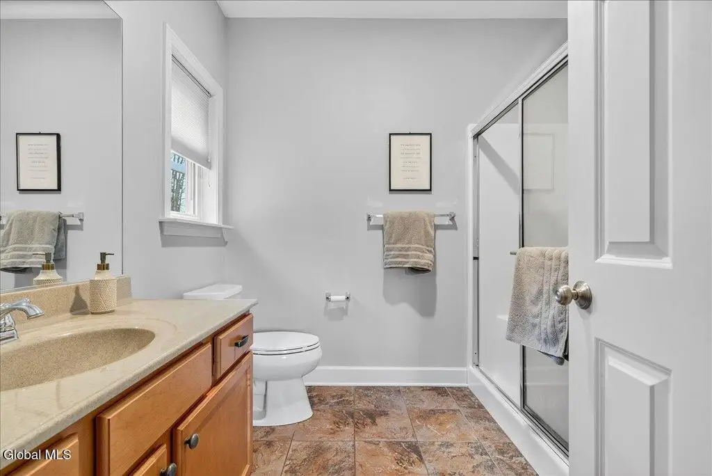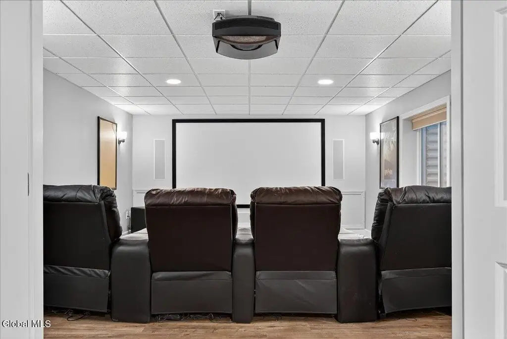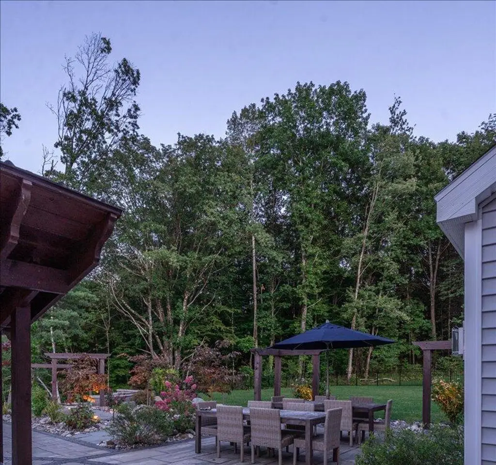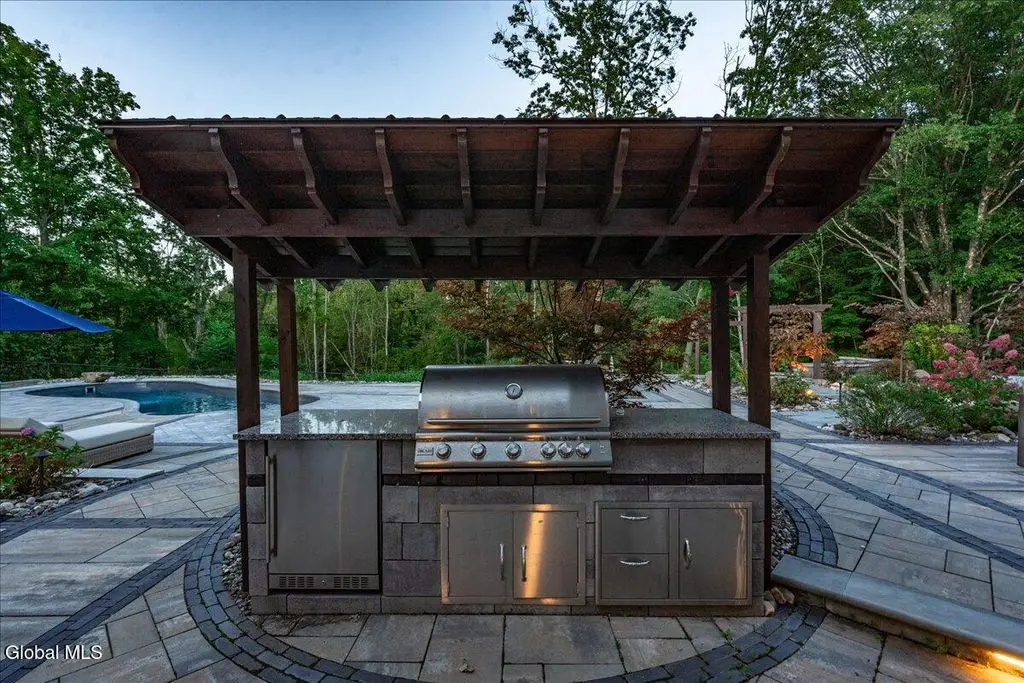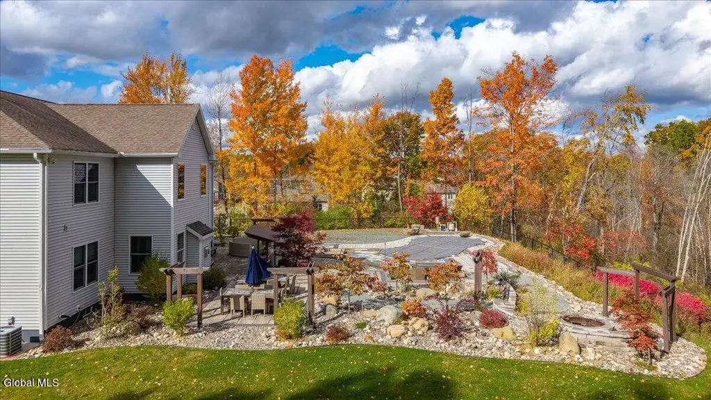 Welcome to this exceptional statement home in the prestigious Winding Brook Estates, where timeless elegance meets modern indulgence. Situated on a beautifully landscaped 1.98 acre lot, this custom-built residence offers unmatched privacy, superior craftsmanship, and resort-style amenities. Property highlights include over 4000 sf of luxury w/ 5 bedrooms, 4.5 baths, hardwood floors and surround sound throughout. Stroll by the beautifully landscaped entry path and serene water feature to the grand two-story entry and expansive open floor plan. You'll appreciate your own corner office, private and stylish. Be amazed by the massive two-story brick accent wall and gas fireplace in the great room. The gorgeous modern kitchen features an incredible butcher block center island w/seating for 8, granite countertops, farmhouse sink, double oven, wine fridge, brick accents and custom cabinetry. The elegant dining room boasts a tray ceiling, wainscoting, and chair rail detailing. First-floor guest suite with full bath. Plus convenient mud room, laundry and guest half bath. Upstairs the spacious primary retreat rewards you with luxury and style. Indulge in the his-and-her walk-in closet or take a spa day in the jetted soaking tub. In addition there's a dual sink vanity, walk-in shower, private throne room and abundant natural light. Three additional upstairs bedrooms; 2 with Jack & Jill bath and generous closet space, one with private bath. Fully finished lower level with granite entertainment bar, home theater, bonus office/den, and egress window. The outdoor oasis features a Saltwater inground pool and hot tub surrounded by lush landscaping. Custom paver patio with multiple seating areas and built-in covered kitchen w/BBQ and fridge. Gas firepit for year-round gatherings. Surround sound system extends seamlessly from inside to outdoors. Lawn sprinklers in front & back for easy maintenance. A short drive from downtown Saratoga Springs, minutes to Saratoga Lake